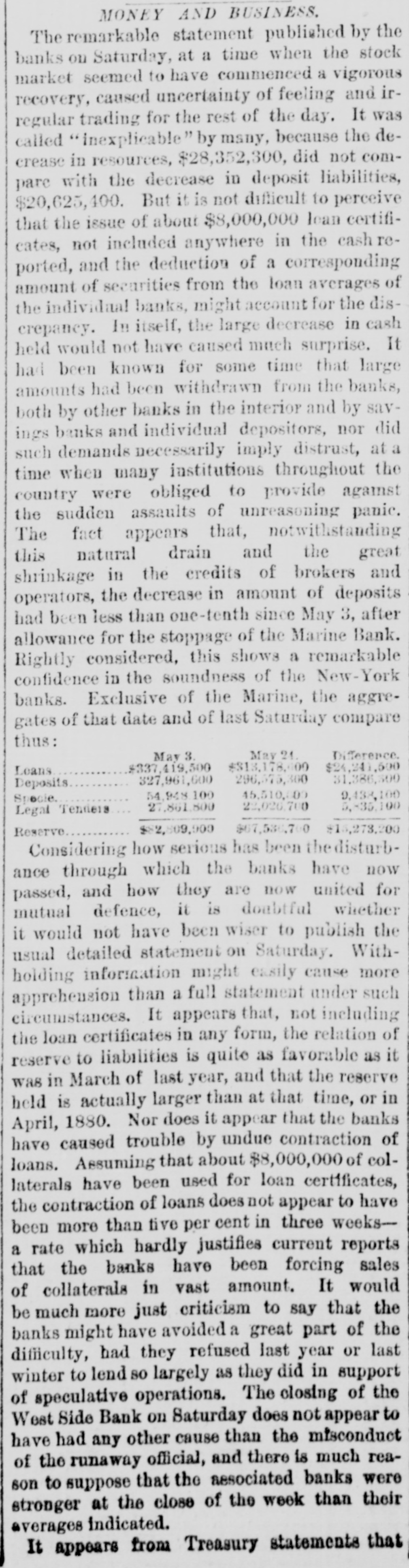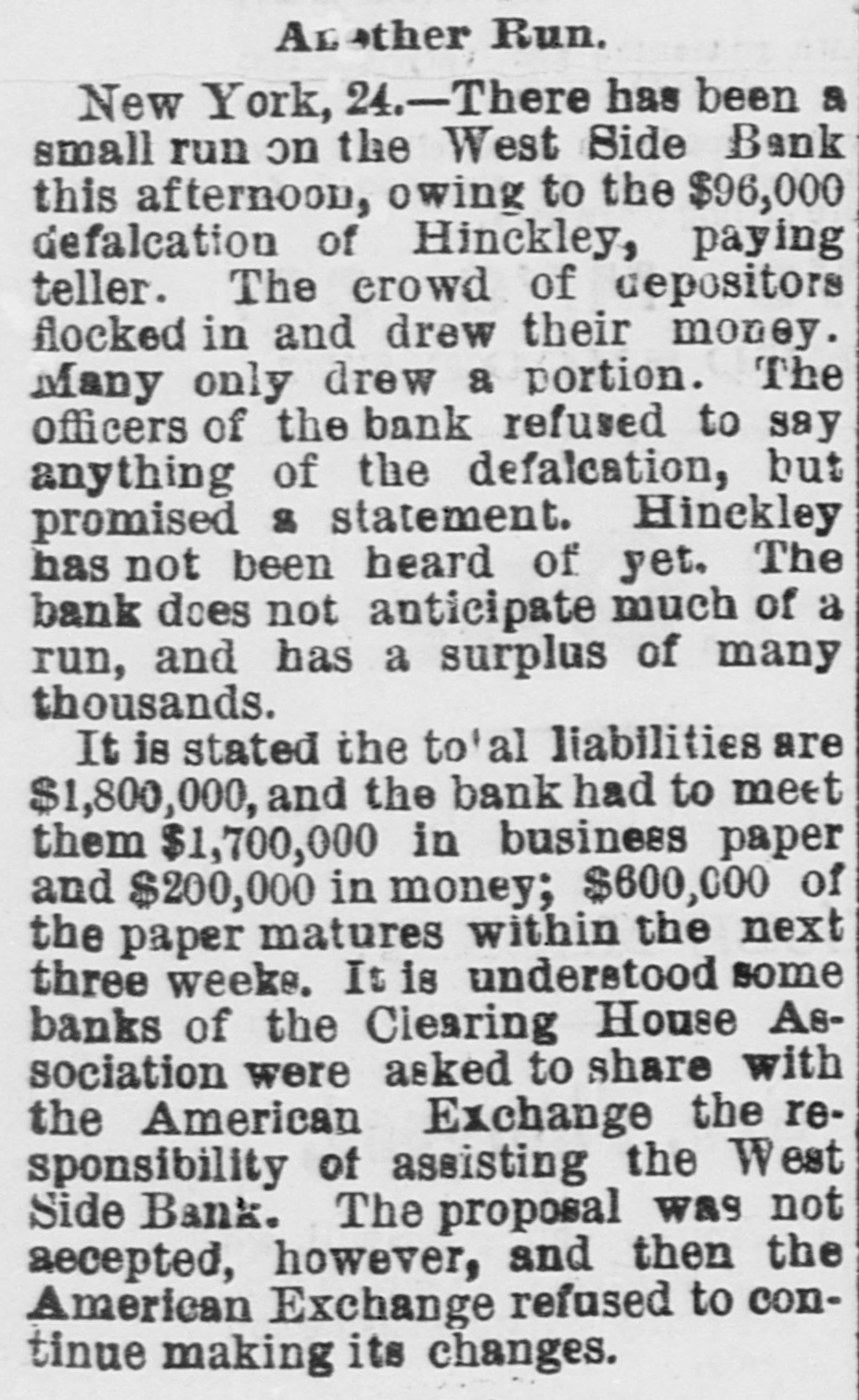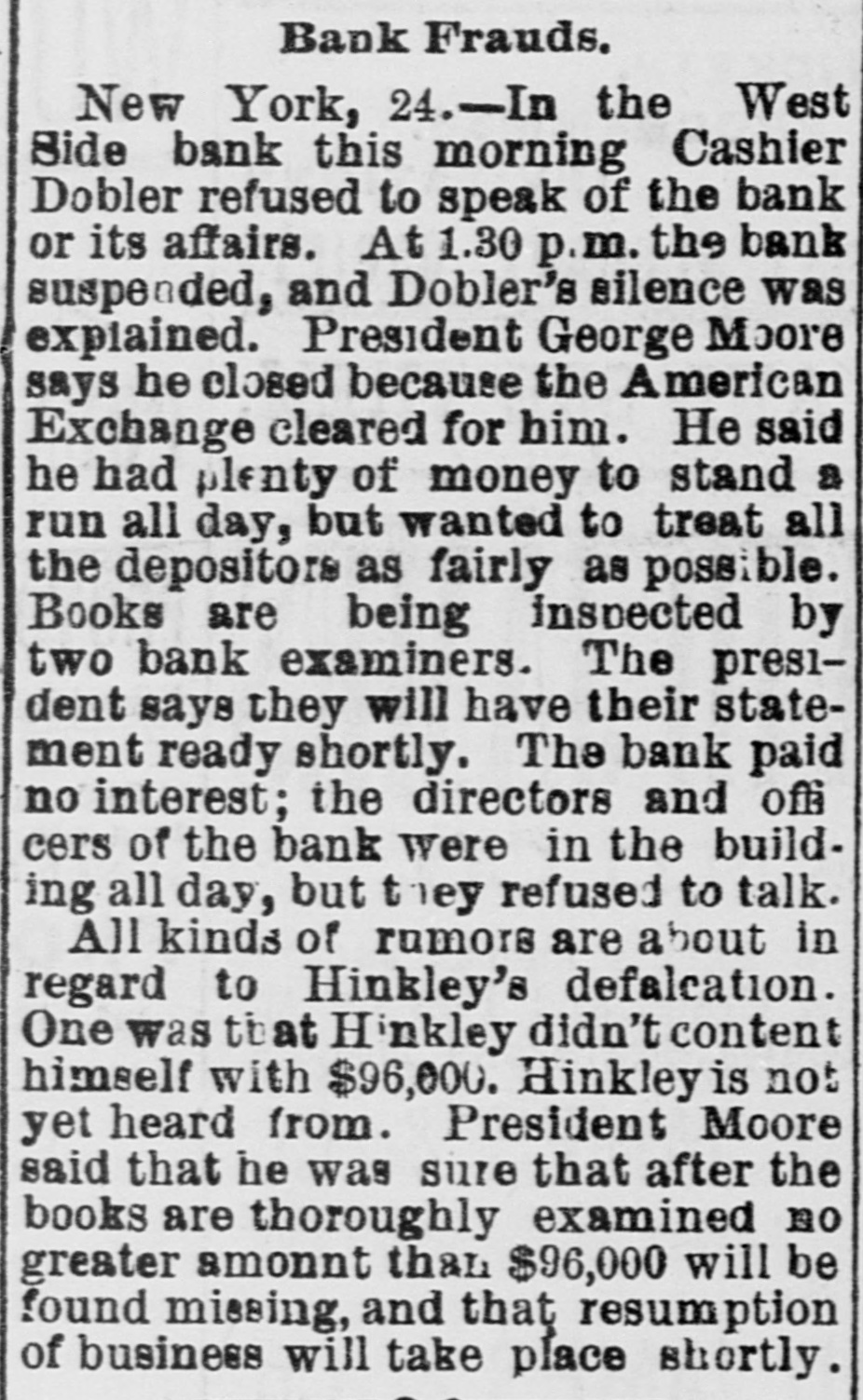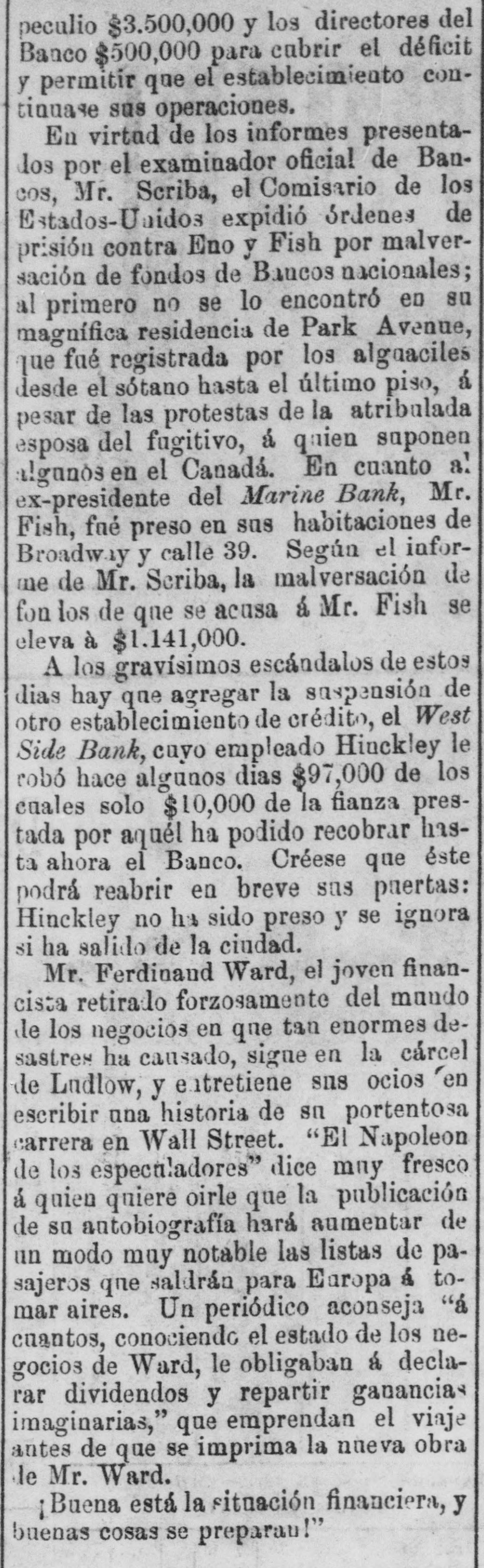 General Summary. Alexander Sullivan, President of the Irish National League of America, was asked last evening, in Chicago, wheth er the nomination of Blaine would cause any considerable number of Irish votes to be transferred from the Democratic to the Republican side. Hesaid that his position forbade expression from him on the subject, but laughingly remarked: I'll say this, nominate Phil Sheridan, and you have the Irish vote." Eli Heiney, one of the Buzzard gang of Ephrata Mountain thieves, was sentenced in Lancaster, Penna., on Satur urday, to six years' imprisonment. Daniel Hornberger,another of the gang, was sentenced to imprisonment for four years and three months. Isaac Brenzier and Mrs. 'Abe" Buzzard were acquitted. Right Rev. Benjamin Boeworth Smith, Bishop of Kentucky. the Presiding Bishop of the Protestant Episcopal Church in the United States, died on Satnrday morning, in New York. He was a native, of RhodeIsland, andlin two weeks more, had he lived, would have completed the 90th year of his age. Colonel Nellis Borden, formerly of Louisville, and a man named Lineback fought a duel at the mouth of a inica mine in Mitchell county, North Caro lina, on Friday. The trouble arose from a dispute as to the ownership of the mine. Pistols were used and Borden was shot dead. Charles Farciot, of the firm of Farciot & Wehrle, wine dealers of Sandusky, Ohio, disappeared on the 12th of May, and it has since been ascertained that he involved his partner to the extent of about $35,000. It is supposed he has gone to Europe. The West Side Bank, of New York, resumed business on Saturday morning, after a suspension of nearly a week. There was much less of a run upon it than had been expected, and considerable deposits were taken in. The schooner Macia Reynolds, from Philadelphia, for Galveston, with a cargo of coal, sank off Long Key, Florida, ou the 23d inst. All hands were landed at Alligator Lighthouse, and areawaiting passage north. Patrick Kennedy bad his skull frac. tured by being struck with a beer glass by John Hefferman, in the latter's saloon, in Brooklyn, yesterday. Kenne dy's recovery is doubtful. Hefferman was arrested. Julins Dietrich, supposed to be insane, shot his wife and bimself in San Francisco, on Saturday night. He died yesterday morning, but his wife is expected to recover. Joseph Eiden, an engineer in the Lackawanua Iron and Coal Company's mill at Scranton, Penna., was killed on Saturday morning by being caught in the belting of the machinery. The second game of billiards between George F. Slosson and Jacob Schaefer, in Chicago, on Saturday evening, was won by the former, the score standing, Slosson, 800; Schaefer, 654 The Courtney-Ross race at Oak Point, New York, was again prevented on Saturday by the roughness of the water, and was postponed until Saturday next. Miss Permil Chaffee, a well-known society belle of Natchitoches, Louisiana, was drowned at a friend's place on the Red River on Friday morning. Lyle's block at Morrisburg, Ontario, occupied by several stores and the Masonic Hall, was burned the ameday. Loss, $25,000. A fire in Paducah, Kentucky, on Saturday night dear yed Rick's store and the Knight complar Hall, causing a loss of $50,000. A. W. Corbitt & Son's establish2 ment" Aunapolis, Nova Scotia, was burned Satu rday. Loss $45,000.
