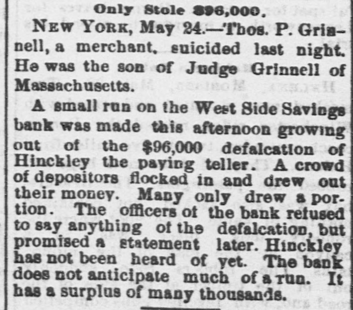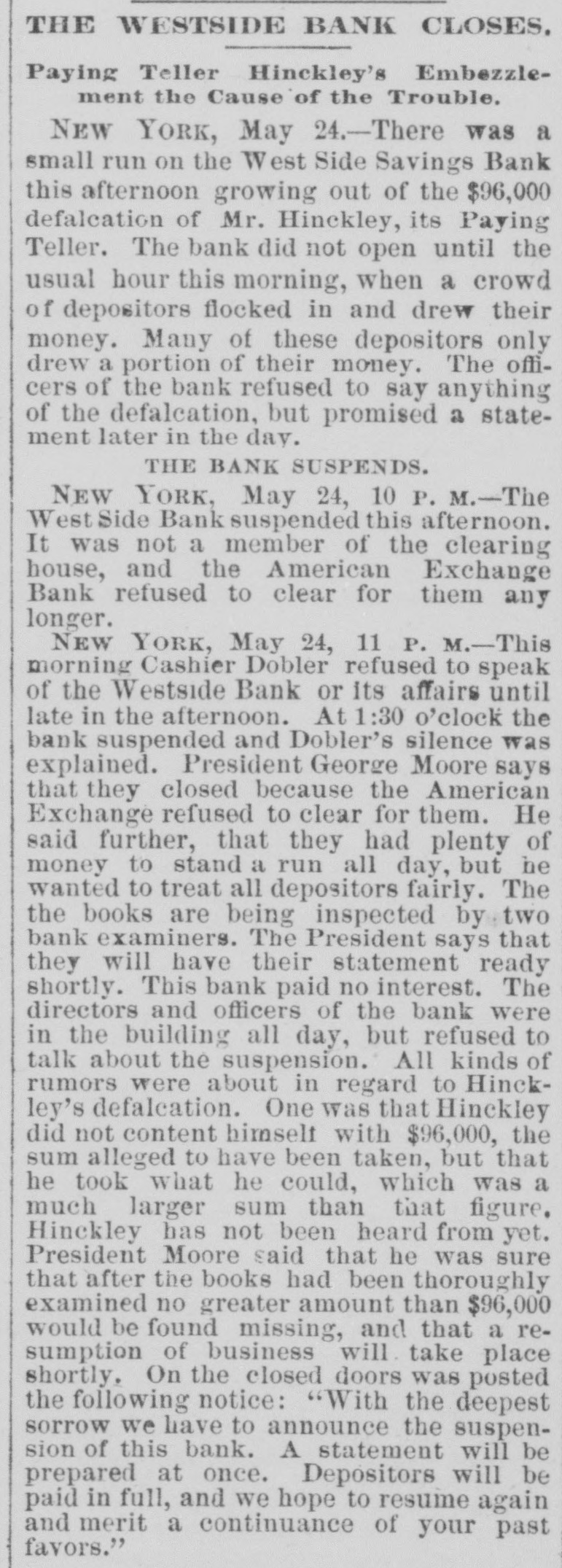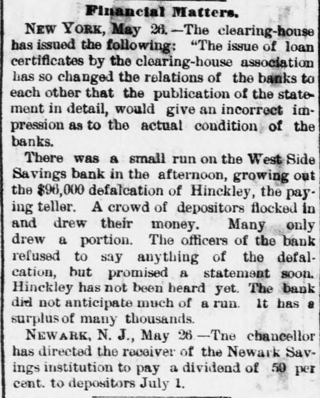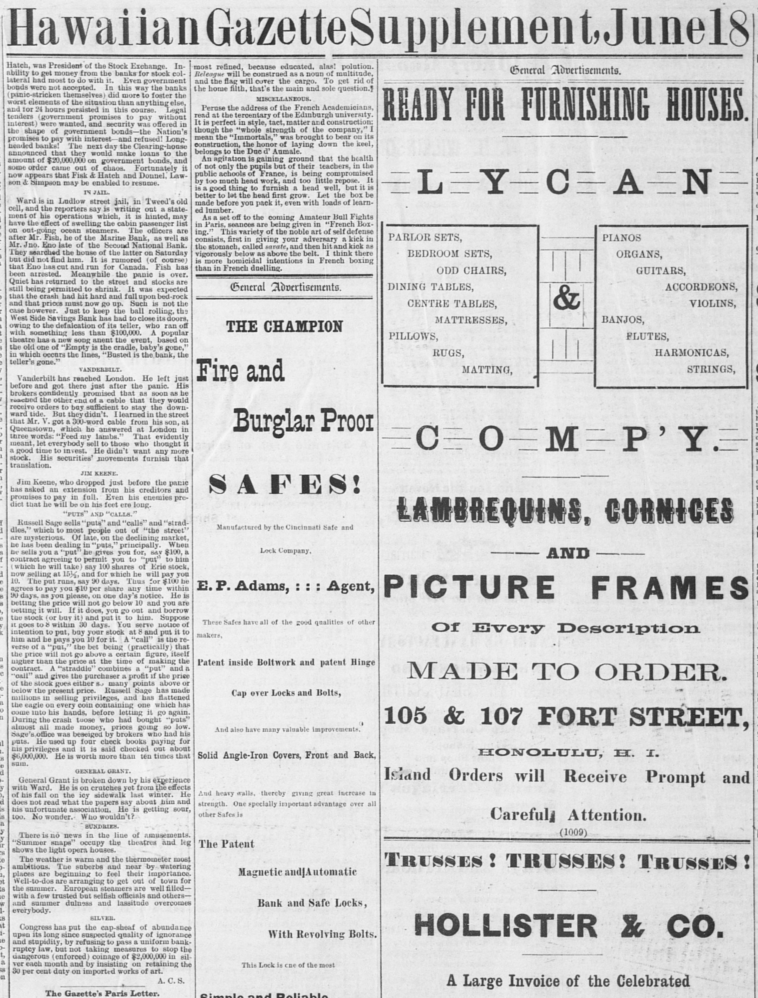 HawaianGazetteSupplementJunel8 Hatch, was President of the Stock Exchange. Inmost refined, because educated, alas! polution. General Advertisements. ability to get money from the banks for stock colReleague will be construed as a noun of multitude, lateral had most to do with it. Even government and the flag will cover the cargo. To get rid of bonds were not accepted. In this way the banks the home filth, that's the main and sole question. (panic-stricken themselves) did more to foster the MISCELLANEOUS. worst elements of the situation than anything else, Peruse the address of the French Academicians, and for 24 hours persisted in this course. Legal read at the tercentary of the Edinburgh university. tenders (government promises to pay without READY FOR FURNISHING HOUSES. It is perfect in style, tact, matter and construction: interest) were wanted, and security was offered in though the "whole strength of the company," I the shape of government bonds-the Nation's mean the "Immortals," was brought to bear on its promises to pay with interest-and refused! Longconstruction, the honor of laying down the keel, headed banks! The next day the Clearing-house belongs to the Due d' Aumale. announced that they would make loans to the An agitation is gaining ground that the health amount of $20,000,000 on government bonds, and of not only the pupils but of their teachers, in the some order came out of chaos. Fortunately it public achools of France, is being compromised now appears that Fisk & Hatch and Donnel, Lawby too much head work, and too little repose. It son & Simpson may be enabled to resume. is a good thing to furnish a head well, but it is LYCAN IN JAIL. better to let the head first grow. Let the box be Ward is in Ludlow street jail, in Tweed's old made before you pack it, even with loads of learncell, and the reporters say is writing out a stateed lumber. ment of his operations which, it is hinted, may As a set off to the coming Amateur Bull Fights have the effect of swelling the cabin passenger list in Paris, seances are being given in "French Boxon out-going ocean steamers. The officers are ing." This variety of the noble art of self defense PIANOS after Mr. Fish, he of the Marine Bank, as well as PARLOR SETS, consists, first in giving your adversary a kick in Mr. Jno. Eno late of the Second National Bank. the stomach, called savate, and then hit and kick as They searched the house of the latter on Saturday vigorously below as above the belt. I think there BEDROOM SETS, ORGANS, but did not find him. It is rumored (of course) is more homicidal intentions in French boxing that Eno has cut and run for Canada. Fish has than in French duelling. GUITARS, ODD CHAIRS, been arrested. Meanwhile the panic is over. Quiet has returned to the street and stocks are General Advertisements. ACCORDEONS, DINING TABLES, still being permitted to shrink. It was expected that the crash had hit hard and full upon bed-rock and that prices must now go up. Such is not the VIOLINS, CENTRE TABLES, & case however. Just to keep the ball rolling, the West Side Savings Bank has had to close its doors, BANJOS, MATTRESSES, owing to the defalcation of its teller, who ran off THE CHAMPION with something less than $100,000. A popular PILLOWS, FLUTES, theatre has a new song anent the event, based on the old one of "Empty is the cradle, baby's gone," HARMONICAS, RUGS, in which occurs the lines, "Busted is the bank, the teller's gone." VANDERBILT. STRINGS, MATTING, Fire and Vanderbilt has reached London. He left just before and got there just after the panic. His brokers confidently promised that as soon as he reached the other end of a cable that they would receive orders to buy sufficient to stay the downward tide. But they didn't. Ilearned in the street that Mr. V. got a 300-word cable from his son, at Queenstown, which he answered at London in Burglar Proor three words: "Feed my lambs." That evidently meant, let everybody sell to those who thought it CMP'Y. a good time to invest. He didn't want any more stock. His securities' movements furnish that translation. JIM KEENE. Jim Keene, who dropped just before the panic has asked an extension from his creditors and SAFES! promises to pay in full. Even his enemies predict that he will be on his feet ere long. "PUTS" AND "CALLS." Russell Sage sells "puts" and "calls" and "stradLAMBREQUINS, CORNICES Manufactured by the Cincinnati Safe and dles," which to most people out of "the street" are mysterious. Of late, on the declining market, he has been dealing in "puts," principally. When Lock Company, he sells you a "put" he gives you for, say $100, a AND contract agreeing to permit you to "put" to him which he will take) say 100 shares of Erie stock, now selling at 15½, and for which he will pay you 10. The put runs, say 90 days. Thus for $100 he agrees to pay you $10 per share any time within E.P. Adams, : : Agent, 90 days, as you please, on one day's notice. He is PICTURE FRAMES betting the price will not go below 10 and you are betting it will. If it does, you go out and borrow the stock (or buy it) and put it to him. Suppose These Safes have all of the good qualities of other it goes to 8 within 30 days. You serve notice of Of Every Description intention to put, buy your stock at 8 and put it to makers, him and be pays you 10 for it. A "call" is the reverse of a "put," the bet being (practically) that the price will not go above a certain figure, itself higher than the price at the time of making the Patent inside Boltwork and patent Hinge contract. A "straddle" combines a "put" and a "call" and gives the purchaser a profit if the price MADE TO ORDER. of the stock goes either So many points above or below the present price. Russell Sage has made Cap over Locks and Bolts, millions in selling privileges, and has flattened the eagle on every coin containing one which has come into his hands, before letting it go again. During the crash tuose who had bought "puts" almost all made mo