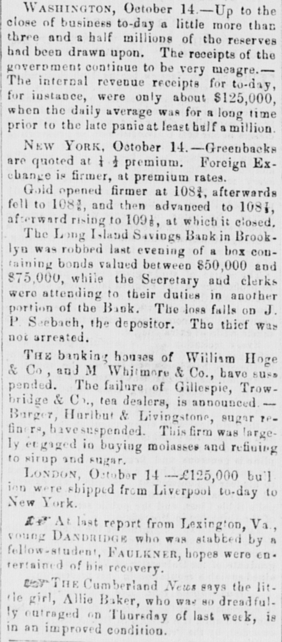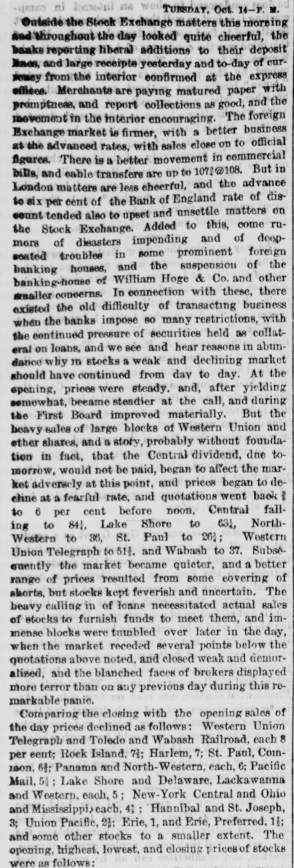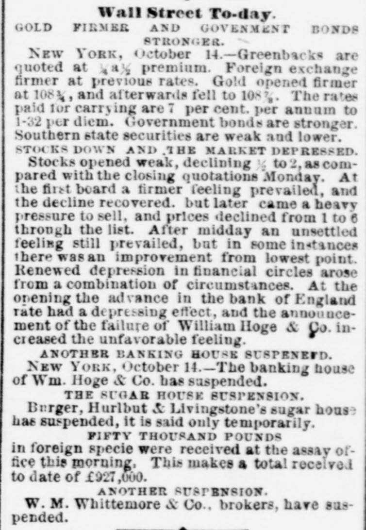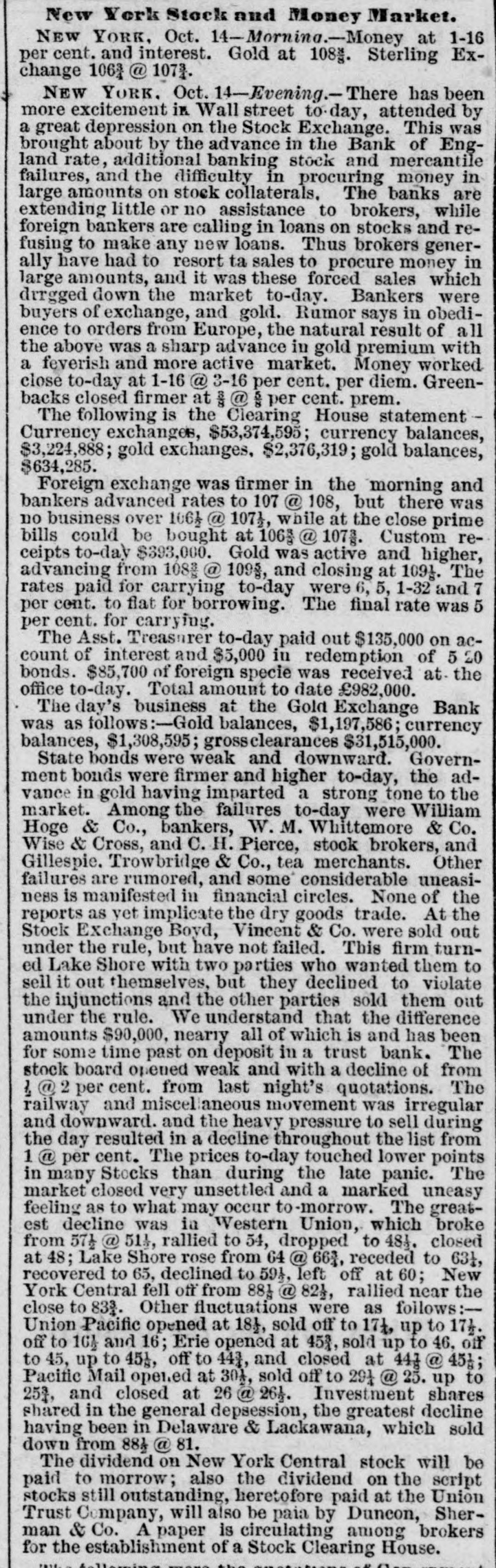 DO drawn against thom. The existing system, when contrasted with the one adopted in Ohicago, is driving the grain business to that city, and not the grain business only, but the purchasers who buy the goods to supply the farmers. Chicago has shown more good BONBO in this emergency than any other considerable city, and, as a consequence, 18 constantly foreing currency to flow thither from all parte of the country, either to purchase grain or to purchase goods. The farmer sells where he can get cash, and Chicago compels everybody to send the cash forward. But the farmer pays his country merchant, and that merchant, having cash, buys where cash 18 used. Thus the monoy drifts back again to the Chicago banks, paying on the way the debts of the farmer, the country merchant, and the Chiengo morchant, and lifting another load from the banks. How long does this city want that open high-road to complete rolief to be monopolized by our neighbor P LATEST, NEW YORK, Oct. 14.-Thero line been more or less excitement in Wall street to-day, attended with a great depression on the Stock Exchange. This condition of affairs was brought about by all advance in the Bank of England rate, additional banking, stock, and mercantile failures, and the difficulty of procuring money to largo amounts on stock collaternis. The banks are extending little or no assistance to brokers, while foreign bankers are calling In loans on stocks and refusing to make any now bank, Thus brokers generally have to resort to: ⑇ to procure money in large amounts, and it Was these forced sales which dragged down the market to-day. The bankers were buyers of exchange and gold, rumor BAYS in obedience to somo orders from the other side. The natural result of all the above matters was a sharp advance in the gold premium, with a feverish and more active market. Money worked close at 1-10 to 3-60 por diem, Greenbacks closed firm at KON premium. Foreign exchange was firmer in the morning, and bankers advanced their rates to 107@108, but there WAR no business over while at the close primo bills could be bought at 100%@107%. Customs receipts, $393,000. Gold was active and higher, advancing from 108% to 100%, closing at 100%. The rates paid for carrying were 0, 5 1-32, and 7 per cent, to flat for borrowing. The final rate was 5 per cent for carrying. Clearings, $31,000,000. The Assistant Treasurer disbursed, to-day, $140,000. Elghty-five thousand pounds of foreign specie were received at the Assay office to-day. The total amount to date is .0082,000. Government bonds ruled Arm and higher, the advance in gold having imparted a strong tono to the market, Among the failures to-day were William Hoge & Co., bankers W. M. Whittemore & Co., Wise & Cross, and O. H. Pierce, stock brokers; Gillospio, Trowbridge & Co., tos merchants, and the sugar house of Burger, Hurlbert & Livingston, No failures are reported among the dry goods mon. At the Stock Exchange, Boyd, Vincent & Co. were wold out under the rule, but have not failed. This firm turned Lake Shore with two parties who wanted them to sell it out themselves, but they declined to violate the injunction, and other parties sold them out under the rule. The difference amounts to $00,000, nearly all of which 1H, and has been for some time past, upon deposit In the Trust Company. The railway and miscellaneous speculation was feverish and unsettled, owing to reasons already given. There was a very heavy pressure to sell at times during the day, resulting in a decline in prices of 1 to 9 por cent. At the close, there was but & slight recovery from the extreme depression. The greatest decline was in Western Union, which broke from 5736 to 51%, rallied to 54, dropped to 483, and closed at 49. Lake Shore rose from 04 to 00% receded to 0315, recovered to 65, declined to 59%, and left off at 60, New York Central fell off from 88% to 82%, and rallied Dear the close to 83%. These were the principal features, but B sharp decline took place in some of the other shares. The prices touched to-day were in many instances lower than those made during the panic. Invostment shares shared in the general depression, the greatest decline having been in Dolaware, Lackawanna & Western, which sold from 88y to 81c. There was much excitement in the street regarding the Vanderbilt stocks, and all sorts of rumors are current touching his brokers and Mr. Drew's. The fight made on New York Central to-day was on the representation of partics that the dividend due to-morrow would not be paid. At a late hour, however, It was stated that the dividend would be paid prom) tly, The stock market left off uneasy and feverish, with a foeling of apprehension for the morrow. Sterling, 107.