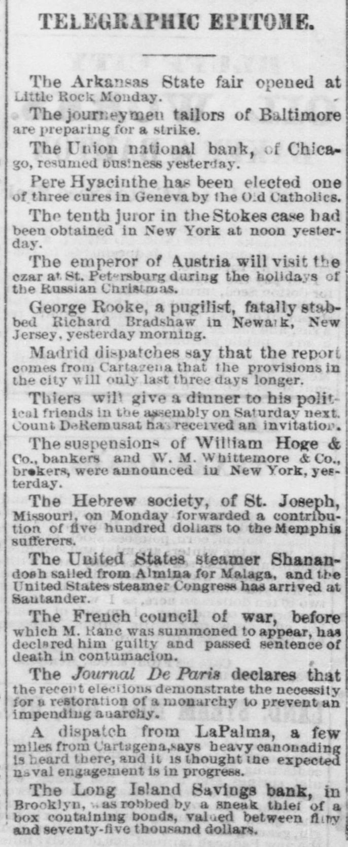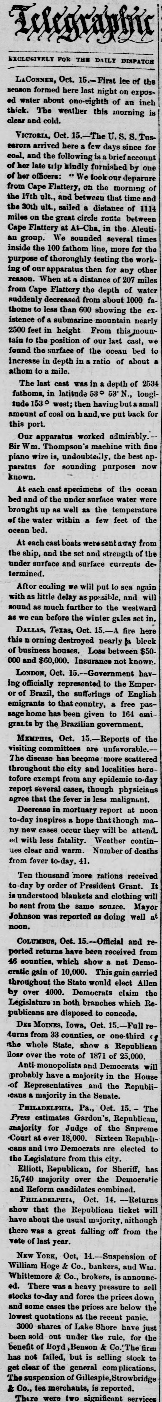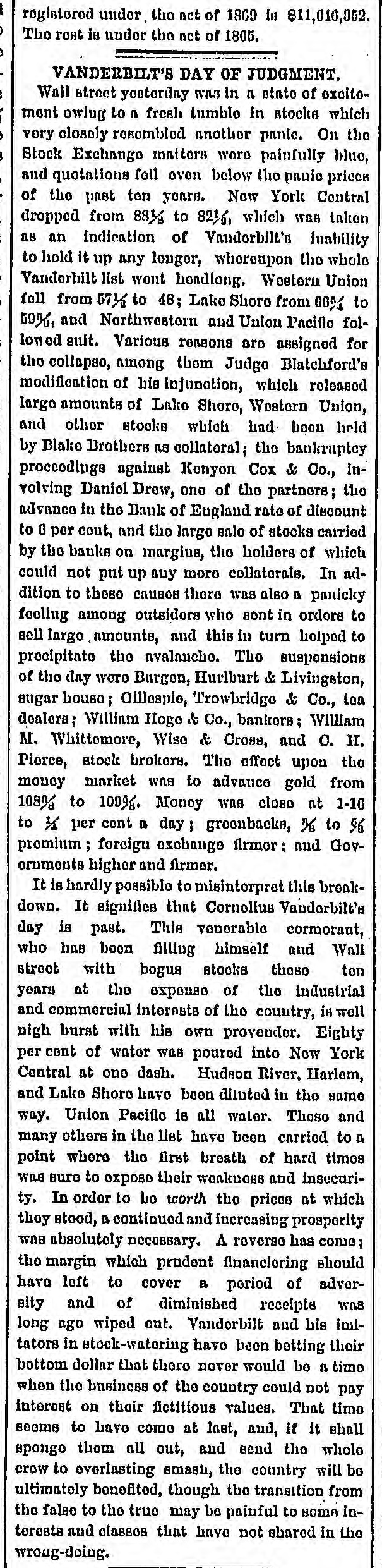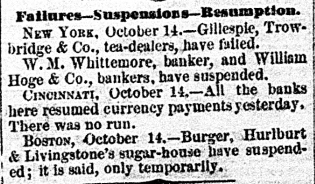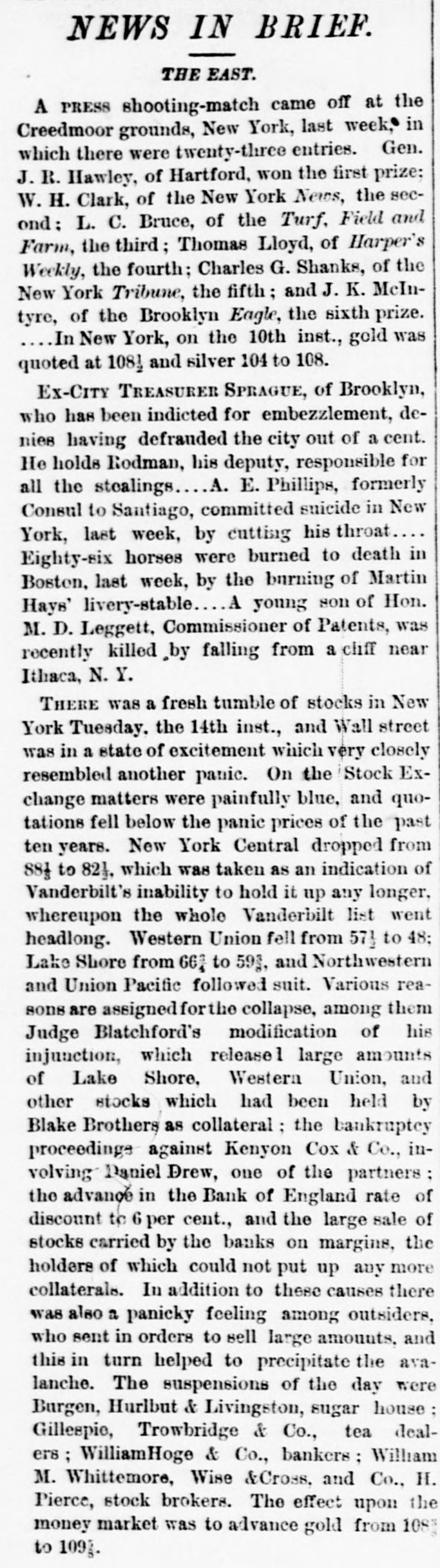 DO drawn against thom. The existing system, when contrasted with the one adopted in Ohicago, is driving the grain business to that city, and not the grain business only, but the purchasers who buy the goods to supply the farmers. Chicago has shown more good BONBO in this emergency than any other considerable city, and, as a consequence, 18 constantly foreing currency to flow thither from all parte of the country, either to purchase grain or to purchase goods. The farmer sells where he can get cash, and Chicago compels everybody to send the cash forward. But the farmer pays his country merchant, and that merchant, having cash, buys where cash 18 used. Thus the monoy drifts back again to the Chicago banks, paying on the way the debts of the farmer, the country merchant, and the Chiengo morchant, and lifting another load from the banks. How long does this city want that open high-road to complete rolief to be monopolized by our neighbor P LATEST, NEW YORK, Oct. 14.-Thero line been more or less excitement in Wall street to-day, attended with a great depression on the Stock Exchange. This condition of affairs was brought about by all advance in the Bank of England rate, additional banking, stock, and mercantile failures, and the difficulty of procuring money to largo amounts on stock collaternis. The banks are extending little or no assistance to brokers, while foreign bankers are calling In loans on stocks and refusing to make any now bank, Thus brokers generally have to resort to: ⑇ to procure money in large amounts, and it Was these forced sales which dragged down the market to-day. The bankers were buyers of exchange and gold, rumor BAYS in obedience to somo orders from the other side. The natural result of all the above matters was a sharp advance in the gold premium, with a feverish and more active market. Money worked close at 1-10 to 3-60 por diem, Greenbacks closed firm at KON premium. Foreign exchange was firmer in the morning, and bankers advanced their rates to 107@108, but there WAR no business over while at the close primo bills could be bought at 100%@107%. Customs receipts, $393,000. Gold was active and higher, advancing from 108% to 100%, closing at 100%. The rates paid for carrying were 0, 5 1-32, and 7 per cent, to flat for borrowing. The final rate was 5 per cent for carrying. Clearings, $31,000,000. The Assistant Treasurer disbursed, to-day, $140,000. Elghty-five thousand pounds of foreign specie were received at the Assay office to-day. The total amount to date is .0082,000. Government bonds ruled Arm and higher, the advance in gold having imparted a strong tono to the market, Among the failures to-day were William Hoge & Co., bankers W. M. Whittemore & Co., Wise & Cross, and O. H. Pierce, stock brokers; Gillospio, Trowbridge & Co., tos merchants, and the sugar house of Burger, Hurlbert & Livingston, No failures are reported among the dry goods mon. At the Stock Exchange, Boyd, Vincent & Co. were wold out under the rule, but have not failed. This firm turned Lake Shore with two parties who wanted them to sell it out themselves, but they declined to violate the injunction, and other parties sold them out under the rule. The difference amounts to $00,000, nearly all of which 1H, and has been for some time past, upon deposit In the Trust Company. The railway and miscellaneous speculation was feverish and unsettled, owing to reasons already given. There was a very heavy pressure to sell at times during the day, resulting in a decline in prices of 1 to 9 por cent. At the close, there was but & slight recovery from the extreme depression. The greatest decline was in Western Union, which broke from 5736 to 51%, rallied to 54, dropped to 483, and closed at 49. Lake Shore rose from 04 to 00% receded to 0315, recovered to 65, declined to 59%, and left off at 60, New York Central fell off from 88% to 82%, and rallied Dear the close to 83%. These were the principal features, but B sharp decline took place in some of the other shares. The prices touched to-day were in many instances lower than those made during the panic. Invostment shares shared in the general depression, the greatest decline having been in Dolaware, Lackawanna & Western, which sold from 88y to 81c. There was much excitement in the street regarding the Vanderbilt stocks, and all sorts of rumors are current touching his brokers and Mr. Drew's. The fight made on New York Central to-day was on the representation of partics that the dividend due to-morrow would not be paid. At a late hour, however, It was stated that the dividend would be paid prom) tly, The stock market left off uneasy and feverish, with a foeling of apprehension for the morrow. Sterling, 107.