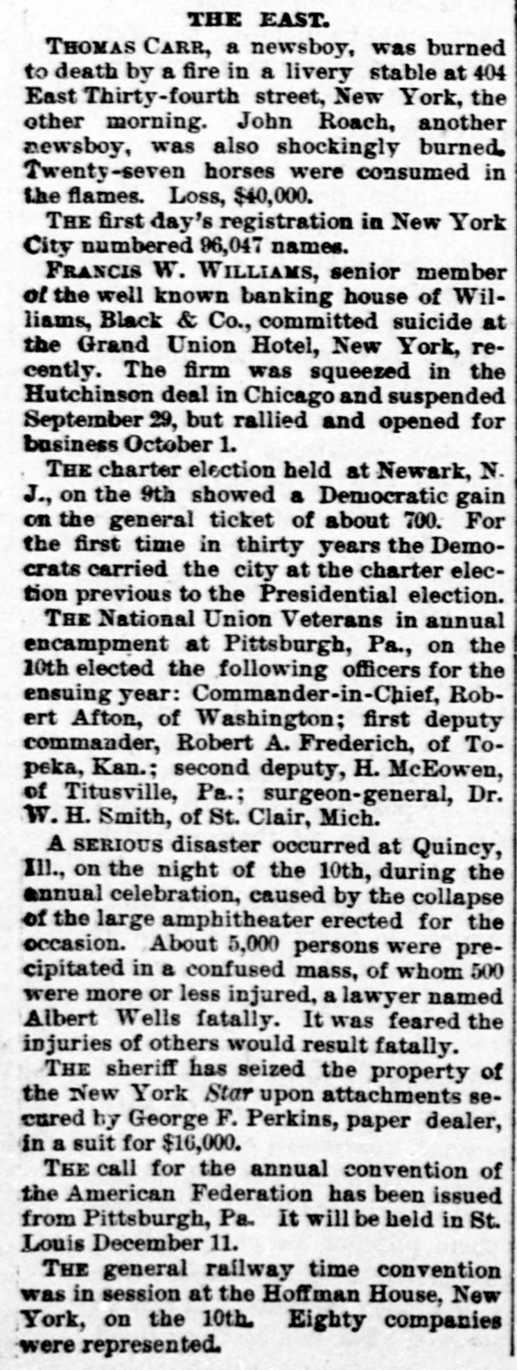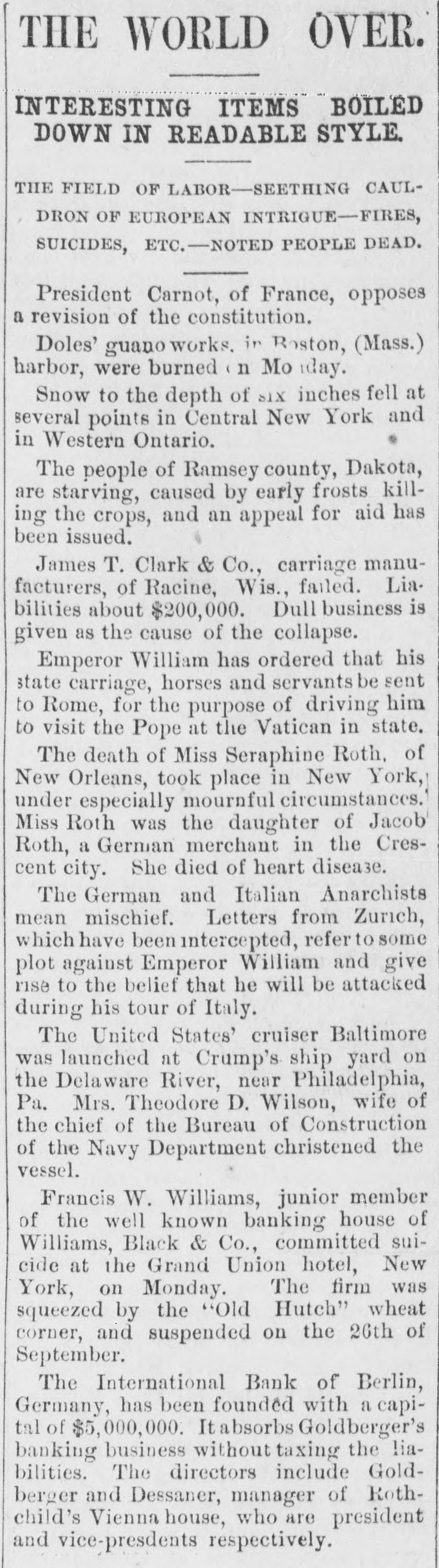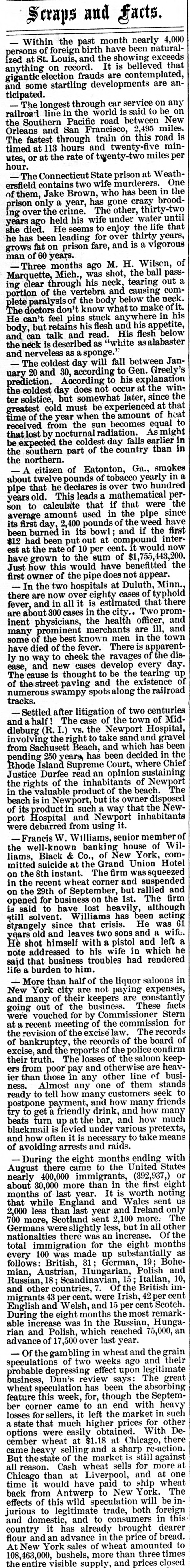 Scraps and facts. Within the past month nearly 4,000 persons of foreign birth have been naturalized at St. Louis. and the showing exceeds anything on record. It is believed that gigantic election frauds are contemplated and some startling developments are an ticipated. The longest through car service on any railroa line in the world is said to be on the Southern Pacific road between New Orleans and San Francisco, 2. 495 miles The fastest through train on this road is timed at 113 hours and twenty-five minutes, or at the rate of twenty-two miles per hour The Connecticut State prison at Weathersfield contains two wife murderers One of them. Jake Brown, who has been in the prison only a year, has gone crazy brooding over the crime The other, thirtyyears ago held his wife under water until she died. He seems to enjoy the life that he has been leading for over thirty years. grows fat on prison fare, and is a vigorous man of 60 years. Three months ago M. H. Wilson, of Marquette, Mich., was shot, the ball passa ing clear through his neck, tearing out portion of the vertebra and causing complete paralysis of the body below the neck The doctors don't know what to make of it He can't feel pins stuck anywhere in his body but retains his flesh and his appetite, and can talk and read. His flesh below the neck is descr ibed as "white as alabaster and nerveless as sponge. The coldest day will fall between January 20 and 30. according to Gen. Greely's prediction. According to his explanatic the coldest day does not occur at the winter solstice, but somewhat later, since the greatest cold must be experienced at that time of the year when the amount of heat received from the sun becomes equal to that lost by nocturnal radiation. As might be expected the coldest day falls earlier in the southern part of the country than in the northern. A citizen of Eatonton, Ga.. smokes about twelve pounds of tobacco yearly in a pipe that he declares is over two hundred years old. This leads a mathematical person to calculate that if that were the average amount used in the pipe since its first day. 2,400 pounds of the weed have been burned in its bowl and if the first $12 had been put out at compound interest at the rate of 10 per cent would now have grown to the sum of $1,755,443,200. Just how this would have benefitted the first owner of the pipe does not appear. In the two hospitals at Duluth, Minn. there are now over eighty cases of typhoid fever, and in all it is estimated that there are about 300 cases in the city Two prominent physicians, the health officer and many prominent merchants are ill, and some of the best known men in the town have died of the fever There is apparently no way to cheek the ravages of the disease, and new cases develop every day The cause is thought to be the tearing up of of the street paving and the existence numerous swampy spots along the railroad tracks. Settled after litigation of two centuries and half The case of the town of Mid dleburg (R. I.) vs. the Newport Hospital involving the right to take sand and gravel from Sachusett Beach, and which has been pending 250 years, has been decided in the Rhode Island Supreme Court, where Chief Justice Durfee read an opinion sustaining the rights of the inhabitants of Newport in the valuable product of the beach. The beach is in Newport but its owner dis posed of its product in such way that the Newport Hospital and Newport inhabitants were debarred from using it. Francis W. Villiams, sepior member of the well-known banking house of Williams Black & Co., of New York, committed suicide at the Grand Union Hotel on the 8th instant. The firm was squeezed in the recent wheat corner and suspended on the 29th of September, but rallied and opened for business on the 1st. The firm said to have lost hea although still solvent. Williams has been acting strangely since that crisis. He was 61 years old and leaves two sons and a wife. He shot himself with pistol and left a note addressed to his wife in which he said that business troubles had rendered life a burden to him. More than half of the liquor saloons in New York city are not paying expenses, and many of their keepers are constantly going out of the business. These facts were vouched for by Commissioner Stern at a recent meeting of the commission for the revision of the excise law The records of bankruptcy, the records of the board of excise. and the reports of the police confirm their truth. The losses of the saloon keepers from poor pay and otherwise are heav ier than those in any other line of business. Almost any one of them stands ready to tell how many customers seek to postpone payment, and how many friends try to get friendly drink and how many beats turn up at the bar. and how much blackmail is fevied under various pretexts, and how often it is necessary to take means of avoiding arrests and raids. During the eight months ending with August there came to the United States nearly 400.000 immigrants, (392.937,) or about 30,000 more than in the first eight months of last year It is worth noting that while England and Wales sent us 2.000 less than last year and Ireland only 700 more, Scotland sent 2.100 more. The Germans were slightly less, but in all other nationalties there was an increase. Of the total immigration for the eight months every 100 was made up substantially as follows: British, 31 German, 19 Bohemian, Austrian. Hungarian, Polish and Russian, 18: Scandinavian, 15 Italian, 10. and other countries, Of the British immigrants 43 per cent were Irish, 42percent English and Welsh, and 15 per cent Scotch. During the eight month the most remark able increase was in the Russian, Hungarian and Polish, which reached 75,000, an advance of 17,500 over last year. Of the gambling in wheat and the grain speculations of two weeks ago and their probable depressing effect upon legitimate business, Dun's review says: The great wheat speculation has been the osorbing feature this week. for, though th