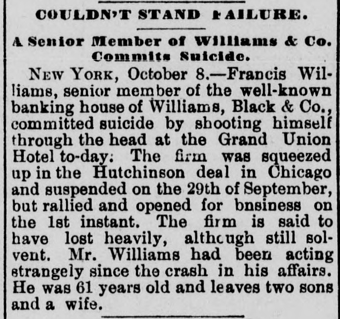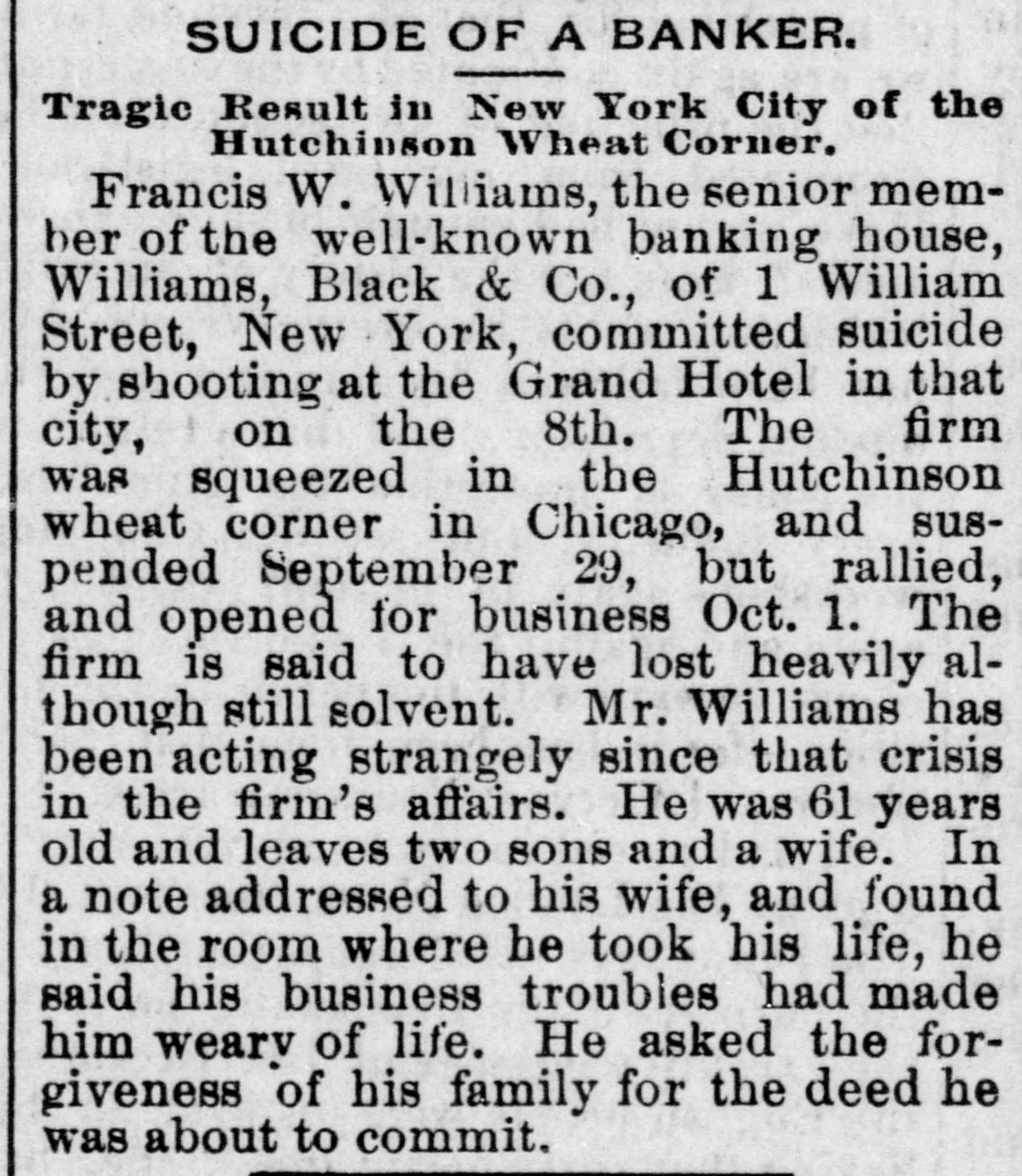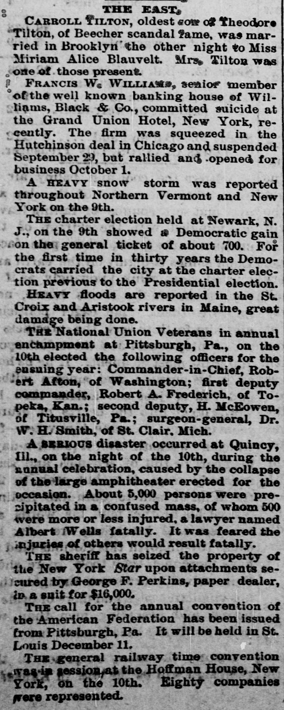 Scraps and facts. Within the past month nearly 4,000 persons of foreign birth have been naturalized at St. Louis. and the showing exceeds anything on record. It is believed that gigantic election frauds are contemplated and some startling developments are an ticipated. The longest through car service on any railroa line in the world is said to be on the Southern Pacific road between New Orleans and San Francisco, 2. 495 miles The fastest through train on this road is timed at 113 hours and twenty-five minutes, or at the rate of twenty-two miles per hour The Connecticut State prison at Weathersfield contains two wife murderers One of them. Jake Brown, who has been in the prison only a year, has gone crazy brooding over the crime The other, thirtyyears ago held his wife under water until she died. He seems to enjoy the life that he has been leading for over thirty years. grows fat on prison fare, and is a vigorous man of 60 years. Three months ago M. H. Wilson, of Marquette, Mich., was shot, the ball passa ing clear through his neck, tearing out portion of the vertebra and causing complete paralysis of the body below the neck The doctors don't know what to make of it He can't feel pins stuck anywhere in his body but retains his flesh and his appetite, and can talk and read. His flesh below the neck is descr ibed as "white as alabaster and nerveless as sponge. The coldest day will fall between January 20 and 30. according to Gen. Greely's prediction. According to his explanatic the coldest day does not occur at the winter solstice, but somewhat later, since the greatest cold must be experienced at that time of the year when the amount of heat received from the sun becomes equal to that lost by nocturnal radiation. As might be expected the coldest day falls earlier in the southern part of the country than in the northern. A citizen of Eatonton, Ga.. smokes about twelve pounds of tobacco yearly in a pipe that he declares is over two hundred years old. This leads a mathematical person to calculate that if that were the average amount used in the pipe since its first day. 2,400 pounds of the weed have been burned in its bowl and if the first $12 had been put out at compound interest at the rate of 10 per cent would now have grown to the sum of $1,755,443,200. Just how this would have benefitted the first owner of the pipe does not appear. In the two hospitals at Duluth, Minn. there are now over eighty cases of typhoid fever, and in all it is estimated that there are about 300 cases in the city Two prominent physicians, the health officer and many prominent merchants are ill, and some of the best known men in the town have died of the fever There is apparently no way to cheek the ravages of the disease, and new cases develop every day The cause is thought to be the tearing up of of the street paving and the existence numerous swampy spots along the railroad tracks. Settled after litigation of two centuries and half The case of the town of Mid dleburg (R. I.) vs. the Newport Hospital involving the right to take sand and gravel from Sachusett Beach, and which has been pending 250 years, has been decided in the Rhode Island Supreme Court, where Chief Justice Durfee read an opinion sustaining the rights of the inhabitants of Newport in the valuable product of the beach. The beach is in Newport but its owner dis posed of its product in such way that the Newport Hospital and Newport inhabitants were debarred from using it. Francis W. Villiams, sepior member of the well-known banking house of Williams Black & Co., of New York, committed suicide at the Grand Union Hotel on the 8th instant. The firm was squeezed in the recent wheat corner and suspended on the 29th of September, but rallied and opened for business on the 1st. The firm said to have lost hea although still solvent. Williams has been acting strangely since that crisis. He was 61 years old and leaves two sons and a wife. He shot himself with pistol and left a note addressed to his wife in which he said that business troubles had rendered life a burden to him. More than half of the liquor saloons in New York city are not paying expenses, and many of their keepers are constantly going out of the business. These facts were vouched for by Commissioner Stern at a recent meeting of the commission for the revision of the excise law The records of bankruptcy, the records of the board of excise. and the reports of the police confirm their truth. The losses of the saloon keepers from poor pay and otherwise are heav ier than those in any other line of business. Almost any one of them stands ready to tell how many customers seek to postpone payment, and how many friends try to get friendly drink and how many beats turn up at the bar. and how much blackmail is fevied under various pretexts, and how often it is necessary to take means of avoiding arrests and raids. During the eight months ending with August there came to the United States nearly 400.000 immigrants, (392.937,) or about 30,000 more than in the first eight months of last year It is worth noting that while England and Wales sent us 2.000 less than last year and Ireland only 700 more, Scotland sent 2.100 more. The Germans were slightly less, but in all other nationalties there was an increase. Of the total immigration for the eight months every 100 was made up substantially as follows: British, 31 German, 19 Bohemian, Austrian. Hungarian, Polish and Russian, 18: Scandinavian, 15 Italian, 10. and other countries, Of the British immigrants 43 per cent were Irish, 42percent English and Welsh, and 15 per cent Scotch. During the eight month the most remark able increase was in the Russian, Hungarian and Polish, which reached 75,000, an advance of 17,500 over last year. Of the gambling in wheat and the grain speculations of two weeks ago and their probable depressing effect upon legitimate business, Dun's review says: The great wheat speculation has been the osorbing feature this week. for, though th