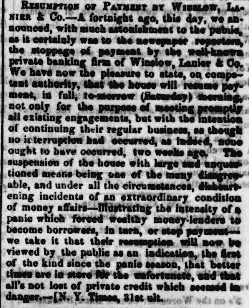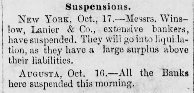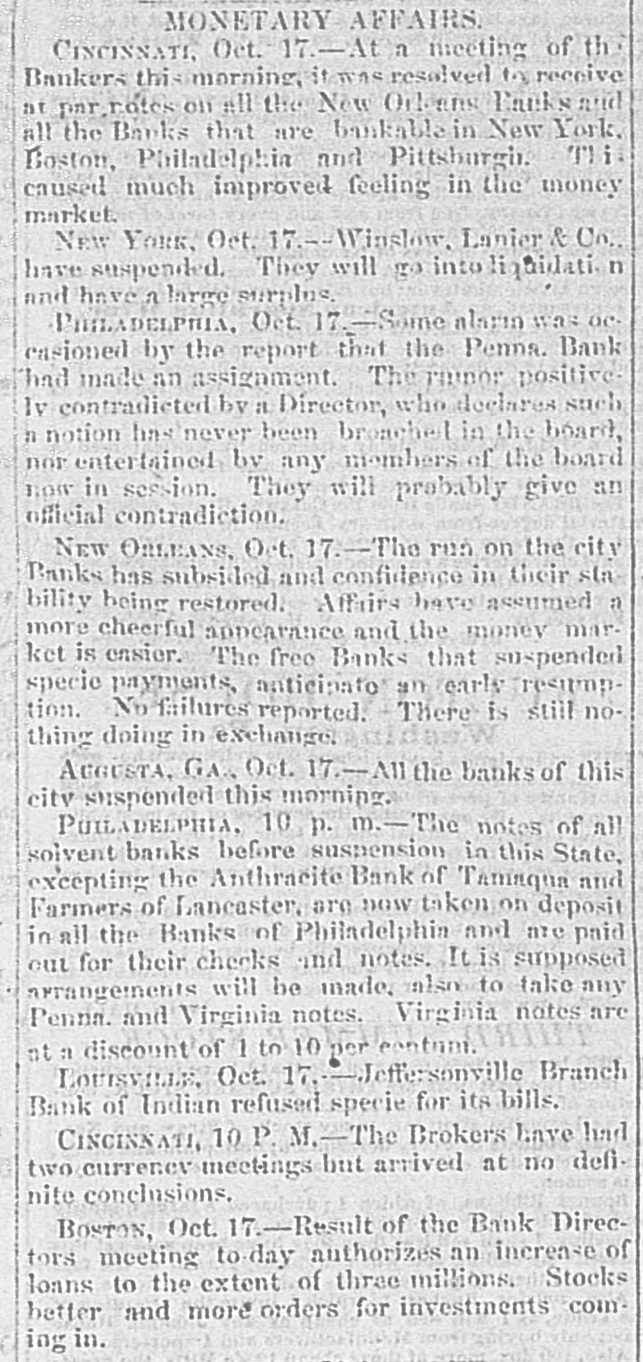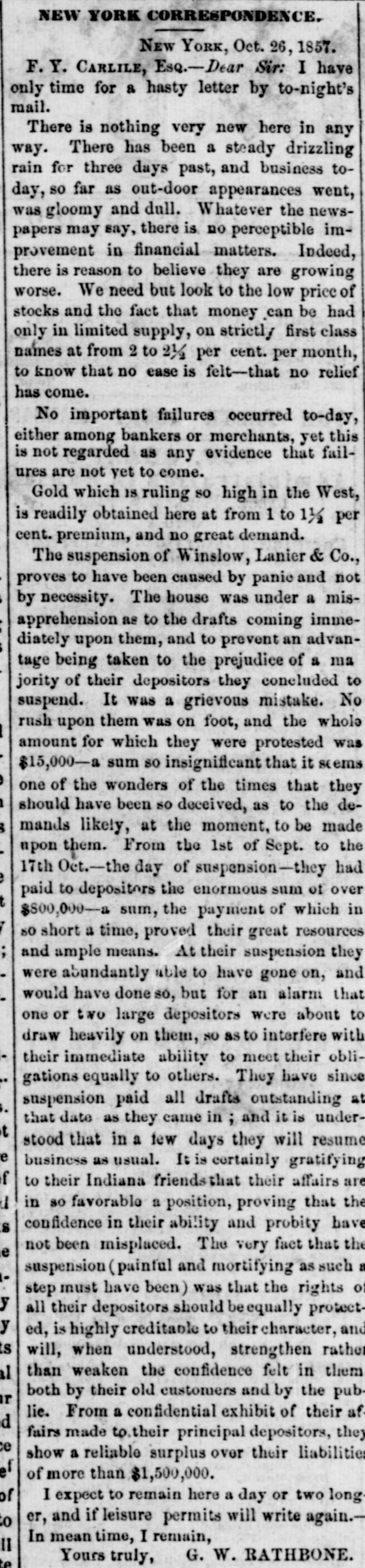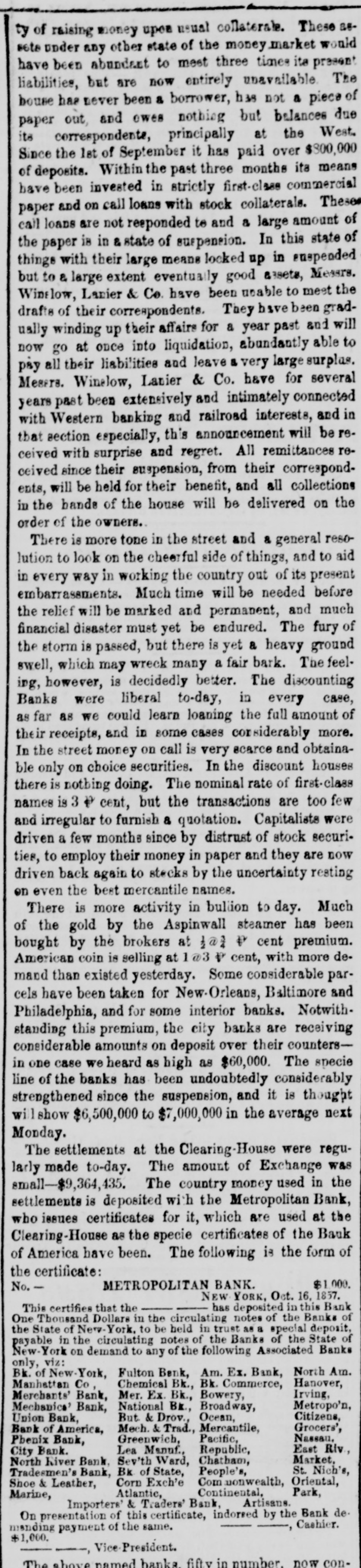 ty of raising money upon usual collaterate. These assets under any other state of the money market would have been abundant to meet three times its present liabilities, but are now entirely unavailable The house has never been a borrower, has not a piece of paper out and ewes nothing but balances due its correspondente, principally at the West. Since the 1st of September it has paid over $800,000 of deposits. Within the past three months its means have been invested in strictly first-class commercial paper and on call loans with stock collaterals. These call loans are not responded to and a large amount of the paper is in & state of surpension. In this state of things with their large means locked up in suspended but to & large extent eventually good assets, Measrs. Winslow, Lanier & Co. have been unable to meet the drafts of their correspondents. They have been gradually winding up their affairs for a year past and will now go at once into liquidation, abundantly able to pay all their liabilities and leave a very large surplas. Messrs. Winelow, Lanier & Co. have for several years past been extensively and intimately connected with Western banking and railroad interests, and in that section especially, this announcement will be received with surprise and regret. All remittances received since their suspension, from their correspondents, will be held for their benefit, and all collections in the bands of the house will be delivered on the order of the owners. There is more tone in the street and & general resolution to look on the cheerful side of things, and to aid in every way in working the country out of its present embarrasements. Much time will be needed before the relief will be marked and permanent, and much financial disaster must yet be endured. The fury of the storm is passed, but there is yet a heavy ground swell, which may wreck many a fair bark. The feeling, however, is decidedly better. The discounting Banks were liberal to-day, in every case, as far as we could learn loaning the full amount of their receipts, and in some cases considerably more. In the street money on call is very scarce and obtainable only on choice securities. In the discount houses there is nothing doing. The nominal rate of first-class names is 3 P cent, but the transactions are too few and irregular to furnish & quotation. Capitalists were driven a few months since by distrust of stock securities, to employ their money in paper and they are now driven back again to stocks by the uncertainty resting on even the best mercantile names. There is more activity in bulion to day. Much of the gold by the Aspinwall steamer has been bought by the brokers at 1@2 P cent premium. American coin is selling at 1@3 P cent, with more demand than existed yesterday. Some considerable parcels have been taken for New-Orleans, Baltimore and Philadelphia, and for some interior banks. Notwithstanding this premium, the city banks are receiving considerable amounts on deposit over their countersin one case we heard as high as $60,000. The specie line of the banks has been undoubtedly considerably strengthened since the suspension, and it is thought show $6,500,000 to $7,000,000 in the average next Monday. The settlements at the Clearing-House were regularly made to-day. The amount of Exchange was emall-$9,364,435. The country money used in the settlements is deposited with the Metropolitan Bank, who issues certificates for it, which are used at the Clearing-House as the specie certificates of the Bauk of America have been. The following is the form of the certificate: $1.000. METROPOLITAN BANK. No. NEW YORK, Oct. 16, 1857. This certifies that the has deposited in this Bank One Thousand Dollars in the circulating notes of the Banks of the State of New-York. to be held in trust as special deposit, payable in the circulating notes of the Banks of the State of New-York on demand to any of the following Associated Banks only, viz: Bk. of New-York, Fulton Bank, Am. Ex. Bank, North Am. Manhattan Co Chemical Bk., Bk. Commerce, Hanover, Irving, Merchants' Bank, Mer. Ex. Bk., Bowery, Metropo'n, Mechanica' Bank, National Br. Broadway, Citizens, But & Drov., Ocean, Union Bank, Grocer's Mech. & Trad., Mercantile, Bank of America, Nassau. Greenwich, Pacific, Phenix Bank, East Rlv., Lea Manuf., Republic, City Bank. Market, North Kiver Bank. Sev'th Ward, Chatham, Nich's, Tradesmen's Bank, Bk of State, People's, Corn Exch'e Comunowealth, Oriental, Shoe & Leather, Continental, Atlantic, Park, Marine, Importers' & Traders' Bank, Artisans. On presentation of this certificate, indoreed by the Bank de. Cashier. mending payment of the same. $1,000. Vice-President. The above named banks. number. now con-