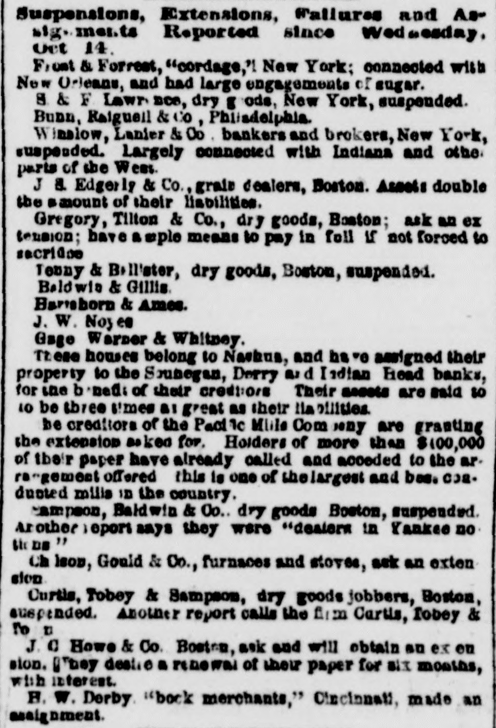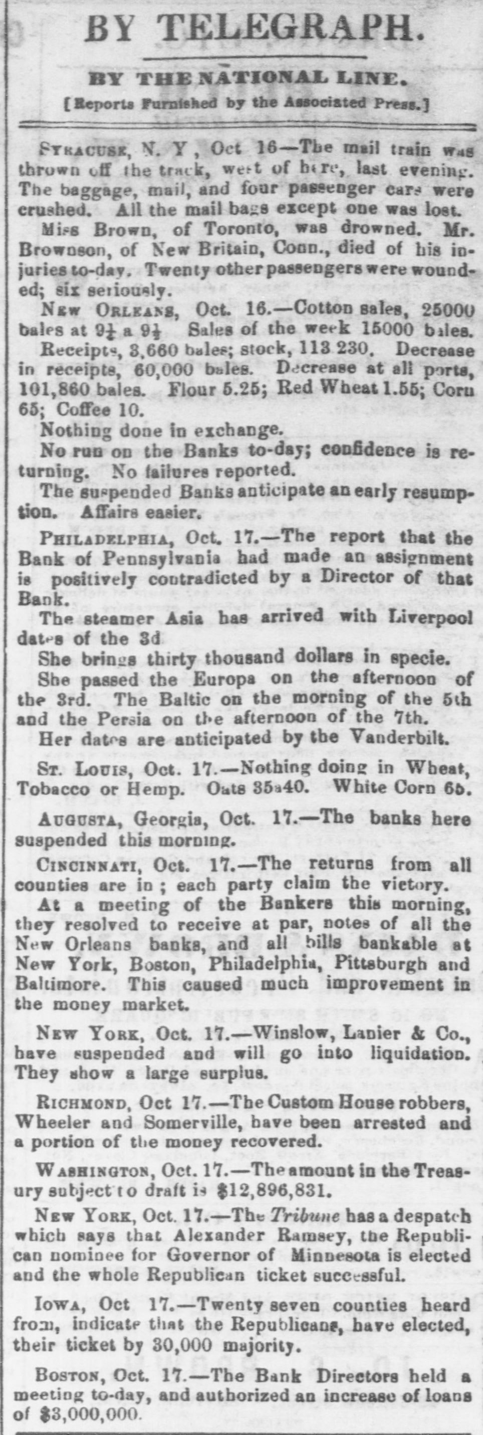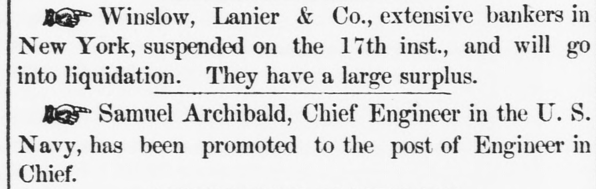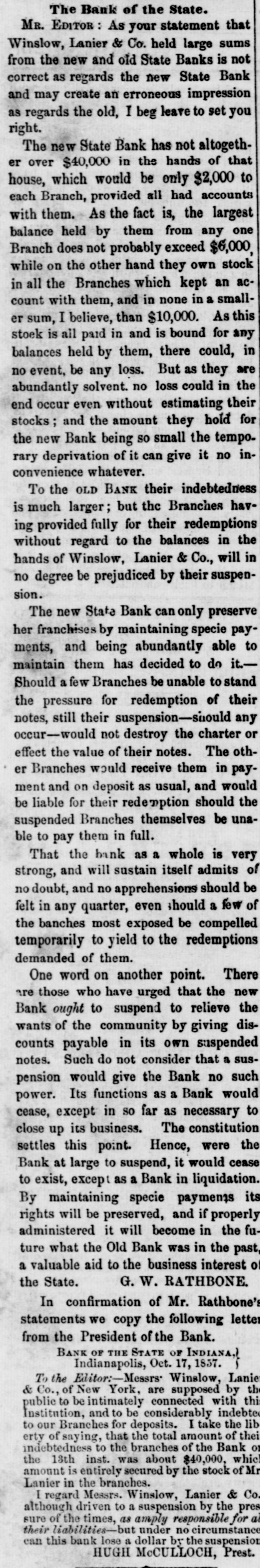 ty of raising money upon usual collaterate. These assets under any other state of the money market would have been abundant to meet three times its present liabilities, but are now entirely unavailable The house has never been a borrower, has not a piece of paper out and ewes nothing but balances due its correspondente, principally at the West. Since the 1st of September it has paid over $800,000 of deposits. Within the past three months its means have been invested in strictly first-class commercial paper and on call loans with stock collaterals. These call loans are not responded to and a large amount of the paper is in & state of surpension. In this state of things with their large means locked up in suspended but to & large extent eventually good assets, Measrs. Winslow, Lanier & Co. have been unable to meet the drafts of their correspondents. They have been gradually winding up their affairs for a year past and will now go at once into liquidation, abundantly able to pay all their liabilities and leave a very large surplas. Messrs. Winelow, Lanier & Co. have for several years past been extensively and intimately connected with Western banking and railroad interests, and in that section especially, this announcement will be received with surprise and regret. All remittances received since their suspension, from their correspondents, will be held for their benefit, and all collections in the bands of the house will be delivered on the order of the owners. There is more tone in the street and & general resolution to look on the cheerful side of things, and to aid in every way in working the country out of its present embarrasements. Much time will be needed before the relief will be marked and permanent, and much financial disaster must yet be endured. The fury of the storm is passed, but there is yet a heavy ground swell, which may wreck many a fair bark. The feeling, however, is decidedly better. The discounting Banks were liberal to-day, in every case, as far as we could learn loaning the full amount of their receipts, and in some cases considerably more. In the street money on call is very scarce and obtainable only on choice securities. In the discount houses there is nothing doing. The nominal rate of first-class names is 3 P cent, but the transactions are too few and irregular to furnish & quotation. Capitalists were driven a few months since by distrust of stock securities, to employ their money in paper and they are now driven back again to stocks by the uncertainty resting on even the best mercantile names. There is more activity in bulion to day. Much of the gold by the Aspinwall steamer has been bought by the brokers at 1@2 P cent premium. American coin is selling at 1@3 P cent, with more demand than existed yesterday. Some considerable parcels have been taken for New-Orleans, Baltimore and Philadelphia, and for some interior banks. Notwithstanding this premium, the city banks are receiving considerable amounts on deposit over their countersin one case we heard as high as $60,000. The specie line of the banks has been undoubtedly considerably strengthened since the suspension, and it is thought show $6,500,000 to $7,000,000 in the average next Monday. The settlements at the Clearing-House were regularly made to-day. The amount of Exchange was emall-$9,364,435. The country money used in the settlements is deposited with the Metropolitan Bank, who issues certificates for it, which are used at the Clearing-House as the specie certificates of the Bauk of America have been. The following is the form of the certificate: $1.000. METROPOLITAN BANK. No. NEW YORK, Oct. 16, 1857. This certifies that the has deposited in this Bank One Thousand Dollars in the circulating notes of the Banks of the State of New-York. to be held in trust as special deposit, payable in the circulating notes of the Banks of the State of New-York on demand to any of the following Associated Banks only, viz: Bk. of New-York, Fulton Bank, Am. Ex. Bank, North Am. Manhattan Co Chemical Bk., Bk. Commerce, Hanover, Irving, Merchants' Bank, Mer. Ex. Bk., Bowery, Metropo'n, Mechanica' Bank, National Br. Broadway, Citizens, But & Drov., Ocean, Union Bank, Grocer's Mech. & Trad., Mercantile, Bank of America, Nassau. Greenwich, Pacific, Phenix Bank, East Rlv., Lea Manuf., Republic, City Bank. Market, North Kiver Bank. Sev'th Ward, Chatham, Nich's, Tradesmen's Bank, Bk of State, People's, Corn Exch'e Comunowealth, Oriental, Shoe & Leather, Continental, Atlantic, Park, Marine, Importers' & Traders' Bank, Artisans. On presentation of this certificate, indoreed by the Bank de. Cashier. mending payment of the same. $1,000. Vice-President. The above named banks. number. now con-