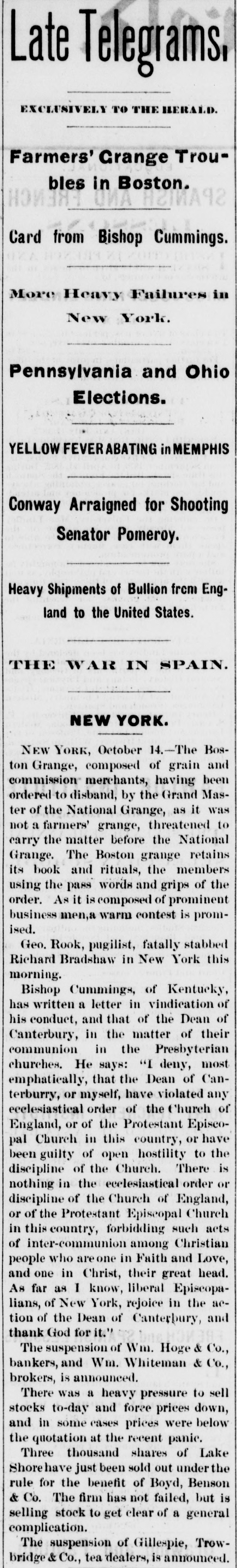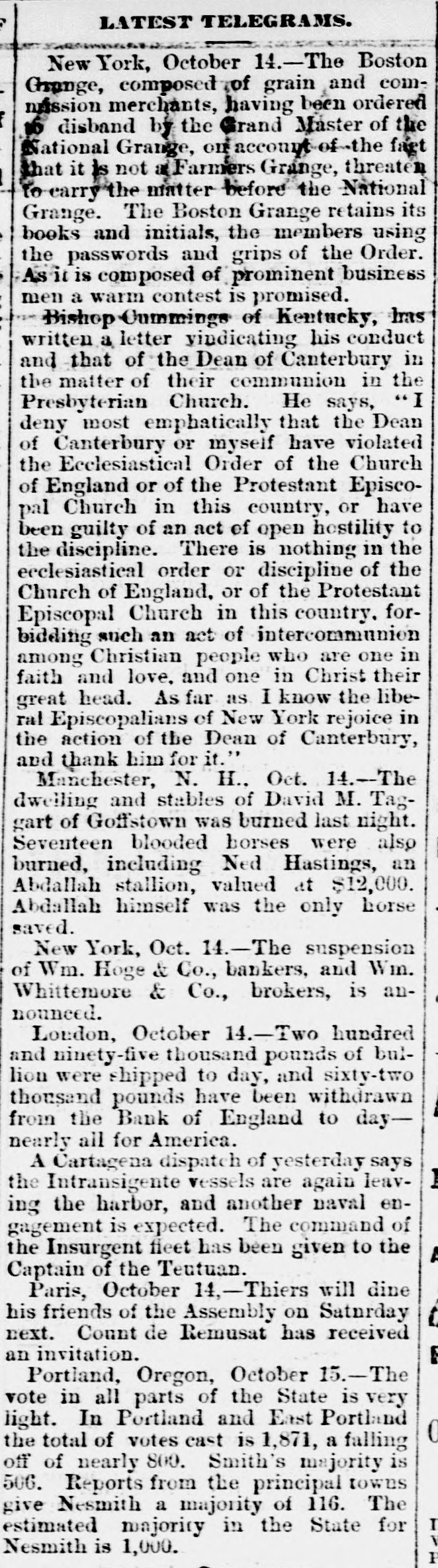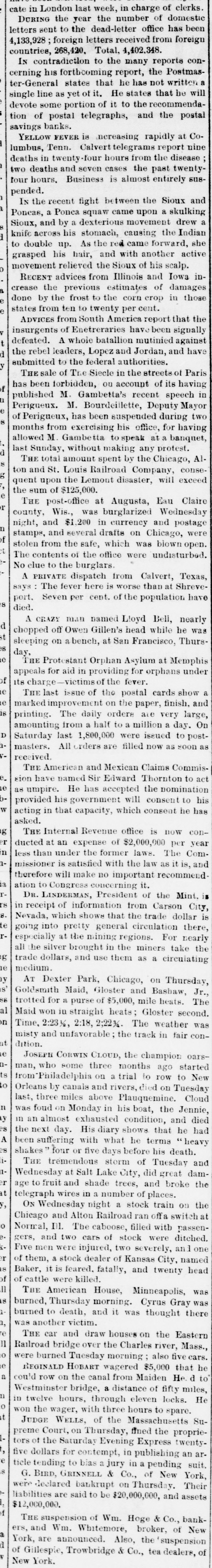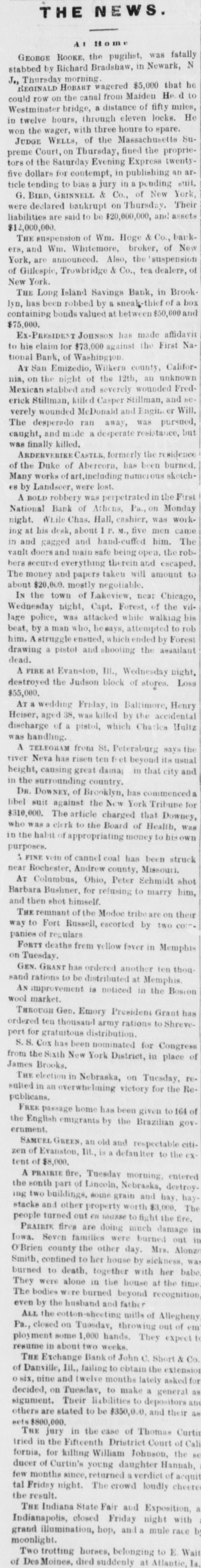 e AI Home GEORGE ROOKE. the pugilist, was fatally N stabbed by Richard Bradshaw, in Newark, J., Thursday morning. REGINALD HOBART wagered $5,000 that he could row on the canal from Maiden He d to Westminster bridge, a distance of fifty miles, in twelve hours, through eleven locks. He won the wager, with three hours to spare. JUDGE WELLS, of the Massachusetts Supreme Court, on Thursday, fined the proprietors of the Saturday Evening Express twentyfive dollars for contempt, in publishing an article tending to bias a jury in a pending suit. G. BIRD, GRINNELL & Co., of New York, were declared bankrupt on Thursday. Their liabilities are said to be $20,000,000, and assets $12,000,000. THE suspension of Wm. Hoge & Co., bankers, and Wm. Whitemore, broker, of New York, are announced. Also, the suspension of Gillespic, Trowbridge & Co., tea dealere, of New York. THE Long Island Savings Bank, in Brooklyn, has been robbed by & sneak-thief of a box containing bonds valued at between $50,000 and $75,000. Ex-PRESIDENT JOHNSON has made affidavit to his claim for $73,000 against the First National Bank, of Washington AT San Emizedio, Wilkern county, California, on the night of the 12th, an unknown Mexican stabbed and severely wounded Frederick Stillman, killed Casper Stillman, and se. verely wounded McDonald and Engine er Will, The desperado ran away, was pursued, caught, and made a desperate resistance, but was finally killed. ARDERVERIKE CASTLE, formerly the residence of the Duke of Abercorn, has been burned, Many works of art,including numerous sketches by Landscer, were lost. A BOLD robbery was perpetrated in the First National Bank of Athens, Pa., on Monday night. While Chas. Hall, cashier, was working at his desk, about 1 P. M., five men came in and gagged and hand-cuffed him. The vanit doors and main safe being opea. the robbers secured everything therein and escaped. The money and papers taken will amount to about $20,000. mostly negotiable. IN the town of Lakeview, near Chicago, Wednesday night, Capt. Forest, of the village police, was attacked while walking his beat, by a man who, he says, attempted to rob him. Astruggle ensued, which ended by Forest drawing a pistol and shooling the assailant dead. A FIRE at Evanston, III., Wednesday night, destroyed the Judson block of stores. Loss $55,000. AT a wedding Friday, in Baltimore, Henry Heiser, aged 38, was killed by the accidental discharge of a pistol, which Charles Hultz was handling. A TELEGRAM from St. Petersburg says the river Neva has risen ten feet beyond its usual height, causing great dama in that city and in the surrounding country. DR. DOWNEY, of Brooklyn, has commenced a libel suit against the New York Tribune for $310,000. The article charged that Downey, who was a clerk to the Board of Health, was in the habit of appropriating money to his own purposes. : FINE veiu of cannel coal has been struck near Rochester, Andrew county, Missouri. AT Columbus, Ohio, Peter Schmidt shot Barbara Bushner, for refusing to marry him, and then shot himself. THE remnant of the Modoe tribe are on their way to Fort Russell, escorted by two com panies of regulars FORTY deaths frem yellow fever in Memphis on Tuesday. GEN. GRANT has ordered another ten thousand rations to be distributed at Memphis. AN improvement is noticed in the Bosion wool market. THROUGH Gen. Emory President Grant has ordered ten thousand army rations to Shreveport for gratuitous distribution. S. .S. Cox has been nominated for Congress from the Sixth New York District, in place of James Brooks. THE election in Nebraska, on Tuesday, resulted in an overwhelming victory for the Republicans. FREE passage home has been given to 164 of the English emigrants by the Brazilian government. SAMUEL GREEN an old and respectable citizen of Evanston, III., is a defaulter to the extent of $8,000. A PRAIRIE fire, Tuesday morning, entered the sonth part of Lincoln, Nebraska, destroy. ing two buildings, some grain and hay, haystacks and other property worth $3,000. The people turned out en masse to fight the fire. PRAIRIK fires are doing much damage in Iowa. Seven families were burned out in O'Brien county the other day. Mrs. Alonz Smith. contined to her house by sickness, was burned to death. together with her babe. They were alone in the house at the time The bodies were burned beyond recognition even by the husband and father ALL the cotton-sheeting mills of Allegheny Pa., closed on Tuesday, throwing out of em ployment some 1,000 hands, They expect to resume in about two weeks. THE Exchange Bank of John C. Short & Co of Danville, III., failing to obtain the extension six, nine and twelve months lately asked for decided, on Tuesday, to make a general as signment. Their liabilities to depositors and others are stated to be $350,000. and their as sets 8800,000. THE jury in the case of Thomas Curtir tried in the Fifteenth Dristrict Court of Cali fornia, for killing William Johnson, the se ducer of Curtin's young daughter Hannah, few months since, returned a verdict of acquit tal Friday night. The crowd loudly cheere the result. THE Indiana State Fair and Exposition, a Indianapolis, closed Friday night with grand illumination, hop, and a mule race b moonlight. Two trotting horses, belonging to E. Wait of Des Moines, died suddenly at Atlantic. Is