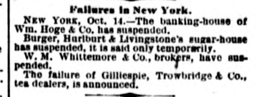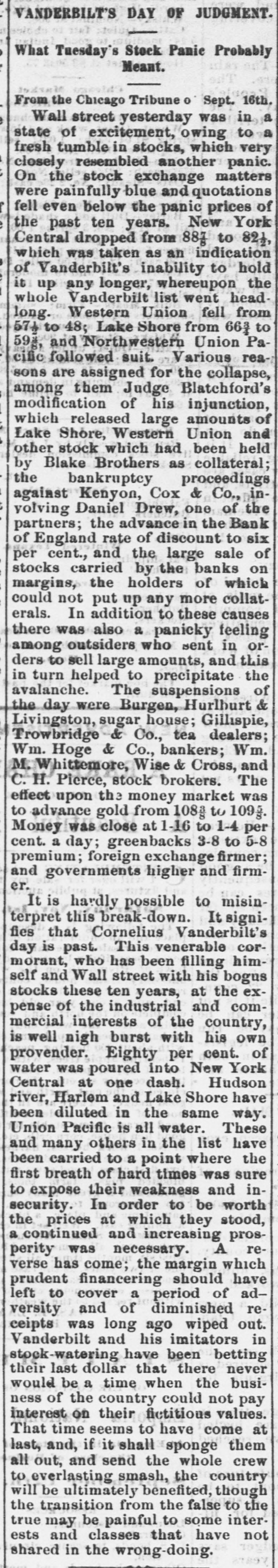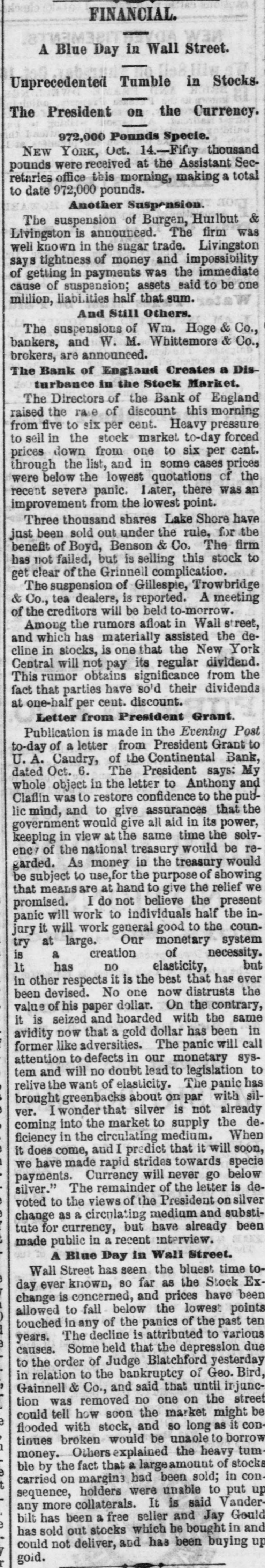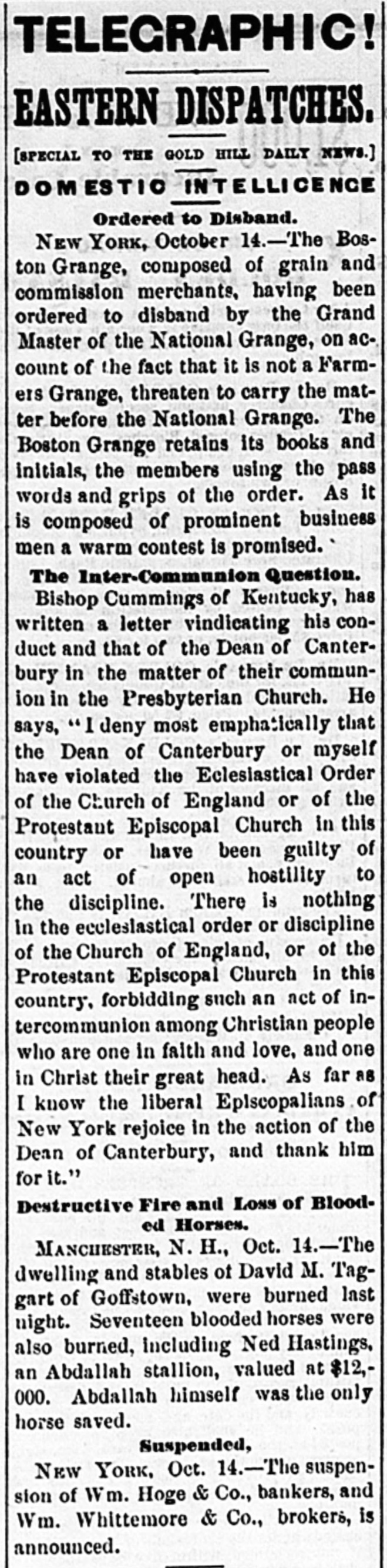 e AI Home GEORGE ROOKE. the pugilist, was fatally N stabbed by Richard Bradshaw, in Newark, J., Thursday morning. REGINALD HOBART wagered $5,000 that he could row on the canal from Maiden He d to Westminster bridge, a distance of fifty miles, in twelve hours, through eleven locks. He won the wager, with three hours to spare. JUDGE WELLS, of the Massachusetts Supreme Court, on Thursday, fined the proprietors of the Saturday Evening Express twentyfive dollars for contempt, in publishing an article tending to bias a jury in a pending suit. G. BIRD, GRINNELL & Co., of New York, were declared bankrupt on Thursday. Their liabilities are said to be $20,000,000, and assets $12,000,000. THE suspension of Wm. Hoge & Co., bankers, and Wm. Whitemore, broker, of New York, are announced. Also, the suspension of Gillespic, Trowbridge & Co., tea dealere, of New York. THE Long Island Savings Bank, in Brooklyn, has been robbed by & sneak-thief of a box containing bonds valued at between $50,000 and $75,000. Ex-PRESIDENT JOHNSON has made affidavit to his claim for $73,000 against the First National Bank, of Washington AT San Emizedio, Wilkern county, California, on the night of the 12th, an unknown Mexican stabbed and severely wounded Frederick Stillman, killed Casper Stillman, and se. verely wounded McDonald and Engine er Will, The desperado ran away, was pursued, caught, and made a desperate resistance, but was finally killed. ARDERVERIKE CASTLE, formerly the residence of the Duke of Abercorn, has been burned, Many works of art,including numerous sketches by Landscer, were lost. A BOLD robbery was perpetrated in the First National Bank of Athens, Pa., on Monday night. While Chas. Hall, cashier, was working at his desk, about 1 P. M., five men came in and gagged and hand-cuffed him. The vanit doors and main safe being opea. the robbers secured everything therein and escaped. The money and papers taken will amount to about $20,000. mostly negotiable. IN the town of Lakeview, near Chicago, Wednesday night, Capt. Forest, of the village police, was attacked while walking his beat, by a man who, he says, attempted to rob him. Astruggle ensued, which ended by Forest drawing a pistol and shooling the assailant dead. A FIRE at Evanston, III., Wednesday night, destroyed the Judson block of stores. Loss $55,000. AT a wedding Friday, in Baltimore, Henry Heiser, aged 38, was killed by the accidental discharge of a pistol, which Charles Hultz was handling. A TELEGRAM from St. Petersburg says the river Neva has risen ten feet beyond its usual height, causing great dama in that city and in the surrounding country. DR. DOWNEY, of Brooklyn, has commenced a libel suit against the New York Tribune for $310,000. The article charged that Downey, who was a clerk to the Board of Health, was in the habit of appropriating money to his own purposes. : FINE veiu of cannel coal has been struck near Rochester, Andrew county, Missouri. AT Columbus, Ohio, Peter Schmidt shot Barbara Bushner, for refusing to marry him, and then shot himself. THE remnant of the Modoe tribe are on their way to Fort Russell, escorted by two com panies of regulars FORTY deaths frem yellow fever in Memphis on Tuesday. GEN. GRANT has ordered another ten thousand rations to be distributed at Memphis. AN improvement is noticed in the Bosion wool market. THROUGH Gen. Emory President Grant has ordered ten thousand army rations to Shreveport for gratuitous distribution. S. .S. Cox has been nominated for Congress from the Sixth New York District, in place of James Brooks. THE election in Nebraska, on Tuesday, resulted in an overwhelming victory for the Republicans. FREE passage home has been given to 164 of the English emigrants by the Brazilian government. SAMUEL GREEN an old and respectable citizen of Evanston, III., is a defaulter to the extent of $8,000. A PRAIRIE fire, Tuesday morning, entered the sonth part of Lincoln, Nebraska, destroy. ing two buildings, some grain and hay, haystacks and other property worth $3,000. The people turned out en masse to fight the fire. PRAIRIK fires are doing much damage in Iowa. Seven families were burned out in O'Brien county the other day. Mrs. Alonz Smith. contined to her house by sickness, was burned to death. together with her babe. They were alone in the house at the time The bodies were burned beyond recognition even by the husband and father ALL the cotton-sheeting mills of Allegheny Pa., closed on Tuesday, throwing out of em ployment some 1,000 hands, They expect to resume in about two weeks. THE Exchange Bank of John C. Short & Co of Danville, III., failing to obtain the extension six, nine and twelve months lately asked for decided, on Tuesday, to make a general as signment. Their liabilities to depositors and others are stated to be $350,000. and their as sets 8800,000. THE jury in the case of Thomas Curtir tried in the Fifteenth Dristrict Court of Cali fornia, for killing William Johnson, the se ducer of Curtin's young daughter Hannah, few months since, returned a verdict of acquit tal Friday night. The crowd loudly cheere the result. THE Indiana State Fair and Exposition, a Indianapolis, closed Friday night with grand illumination, hop, and a mule race b moonlight. Two trotting horses, belonging to E. Wait of Des Moines, died suddenly at Atlantic. Is