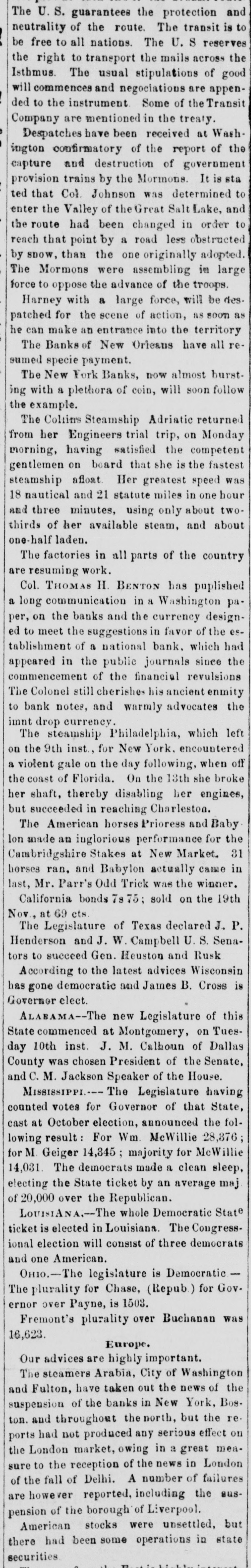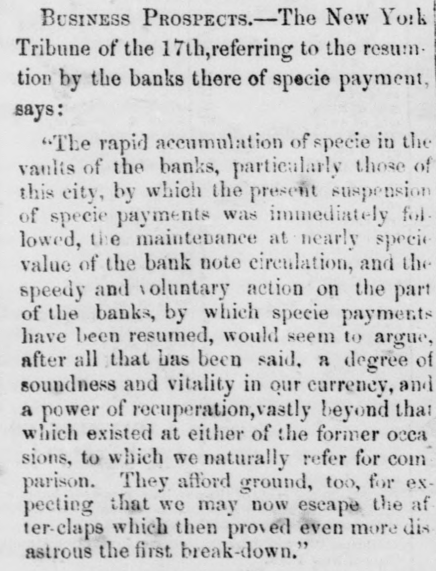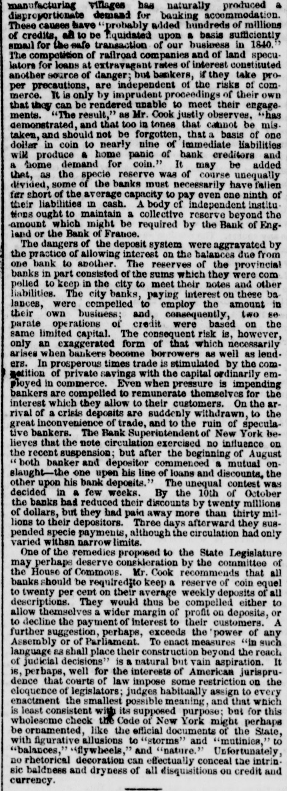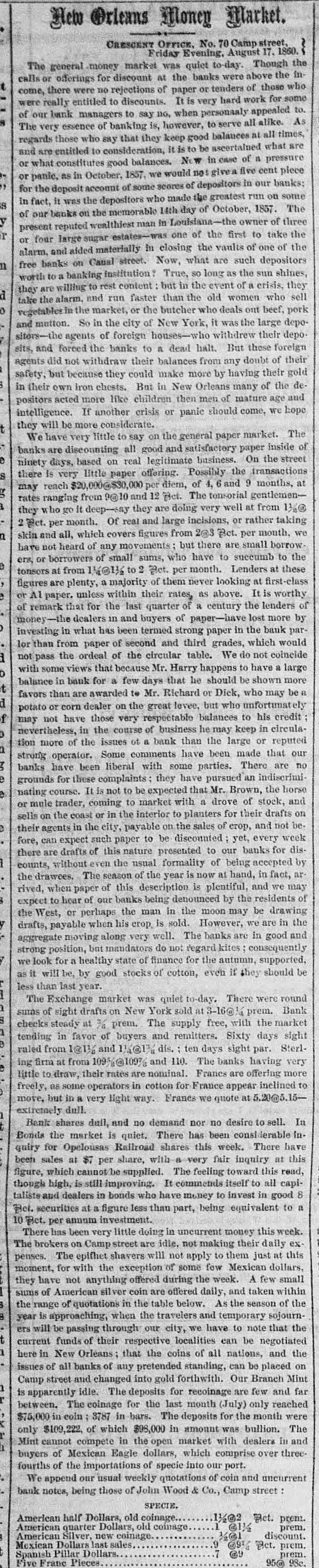 impossible to negotiate any paper both upon foreign the almost Exchanges continue unsettled, banks street. domestic. The stockholders of most of when the they and hoid their annual meeting next month, regard to a will e what course will be pursued in laid down determ: of specie payment at the time number of the resemption recent act of the Legislature. A and we unin the of the interior banks are here, hose of this Presidents will hold a conference to day with will be derstand when their course of action for the future there city, At the Stock Board this morning City decided little upon. more firmness, but without activity. The Sixes was & are heavy, but State Fives have improved. fancies attract but little attention. From The Toledo Blade Yester." 'ay a drove of cattle passed through our city cuto the Eastern markets which were all & the on their way They numbered 280 head, and came northern riority. from Texas. They were gathered in the forward way of Texas late last Fall, and driven Illinois, part Kansas and Missouri to Jacksonville, and Sumthrough where they were kept through the Winter From that to be fattened and prepared for market. Road, mer they came forward on the Wabash Valley in point will soon be on the tables of the gentlemen ten New. and York, after an adventurous journey of over order, They are all nearly of a size, in good length months. not heavy. and are remarkable for the from of but horns. In this respect they differ materially and their cattle. Their hores are, in fact. enormous, have our particularly dangerous and pokish appearance. our We cannot & help noticing in this connection how railroads are changing the course of trade, and drawing supplies for the East from the most remote regions. of the the Wabash Road, this destination has Without of the far West could not be. But this road made cattle it possible for New-York to draw supplies of beef from Texas, and we shall doubtless have many examples of what is now & novelty. The Portsmouth (N.H.) Gazette says: Business appears to be going on in a quiet which safe and there has not been a single failure Our would way, not have occurred in ordinary times. banks are managed with judgement, and have as good first & specie basis as any in the country. On the the Monday in September the liabilities, including capital stock, of the four banks of deposit and discount which in this city amounted to $1,281,032 16, to meet there were assets to the amount of $1,363,290 36, having a surplus of $82,258 20. On Monday last, October 12, the four banks of this city presented & statement, by which it appears that at that time the liabilities were $1,159,582.69, being a redu tion of $121,449 47 since September; $101,and the assets, $1,261,154 59-8 reduction of 635 77. Of these liabilities, the sum of $691,000 composes the capital stock of the banks. On Wednesday morning, intelligence having been received by telegraph of the suspension of specie payments of the banks in Boston and New York, the officers of the several banks immediately convened, to and unanimously resolved to cease for the present specie for their liabilities, and to use their exer- as tions pay to resume specie payments at as early day possible." From The St. Paul Minnesotian, Oet.14. The markets have presented no material Business change since last week, except in some particulars. and has seems be again resuming & better state, trade. become quite brisk in several departments their of Fall Many of our merchants have now received supply of goods. There is not, however, that liveliness and activity which would be prevalent at this season of the year were the money market in better condition. Though business has revived from the dull state of Summer necessarily, yet & general stagnation and pressure affairsseem to pervade it. As soon as the financial the derangement of which has caused this temporary embarraesment and apathy-become in & better state, which will doubtless be ere long, the markets will pre- is sent some features of interest. At present there scarcely enough doing to make a report on. From The St. Louis Democrat Oct. 16 was marked by some little excitement State in Yesterday mattere, growing out of a run upon the money Bank of Missouri. The demands upon the other chartered banks were not very unusual. The State Bank sustained the rush made upon her counters with a great deal of composure; and to show what she could do, her doors were kept open until one-half or threequarters of an hour beyond the usual time. The run will probably be entirely exhausted to-morrow, for im- the test made to day upon her specie seems to have parted a great desl of confidence regarding her Our re. sources and her real gold and gilver strength. business men feel more confident, too, and are pleased to contemplate the prospect of our banks going entirely through the mill, and sustaining their credit as specie paying concerns, while other banks in the country have been obliged to succumb. As business is almost at a dead stand-still, we have nothing at all to say of exchange. It is almost impossible to sell or buy bills at any price. Currency is unchanged. Illinois bills are getting scarcer, and in the retail circles are received with more favor, being preferred in many instances to Kentusky and other East. ern money, about which there is just now 80 much uncertsinty. No change to be noticed in currency. Illinois money is scarce, and is still passing freely among retail traders at to 15 P cent discount. A few trans. on actions for currency *ock place this morning change. It will not buy wheat or flour. From The Cleveland (Ohio) Herald, Oct. 16. We are hourly strengthened in our belief of the abundant solvency of our city banks. We have. in the last few issues. given facts, too, upon which our confidence is grounded. and mean neither to deceive ourselves nor our readers.