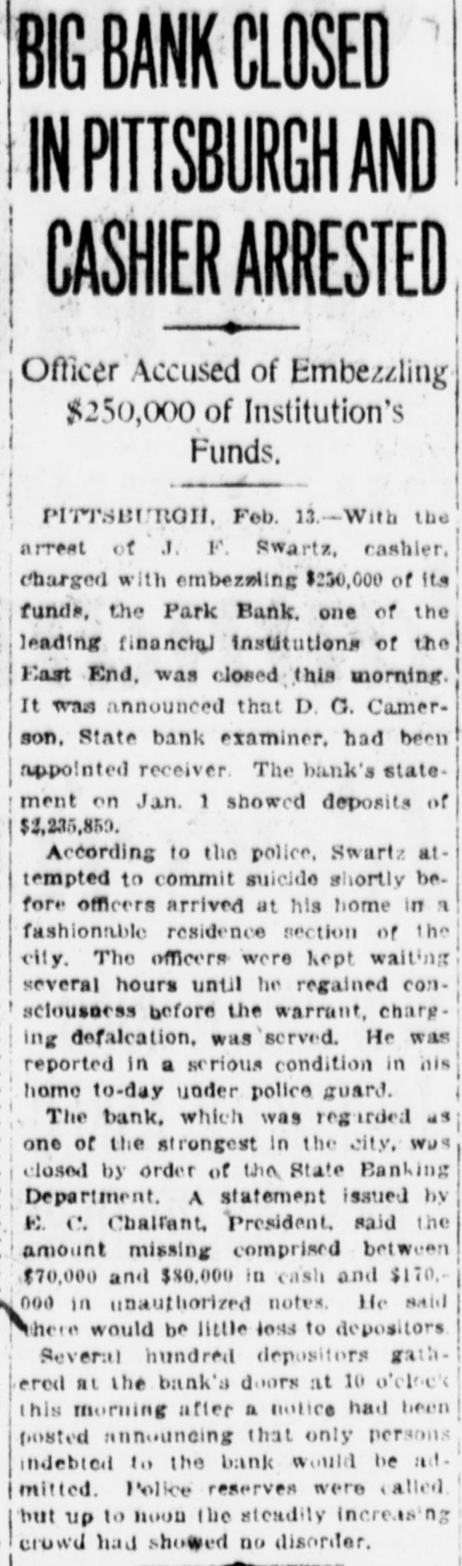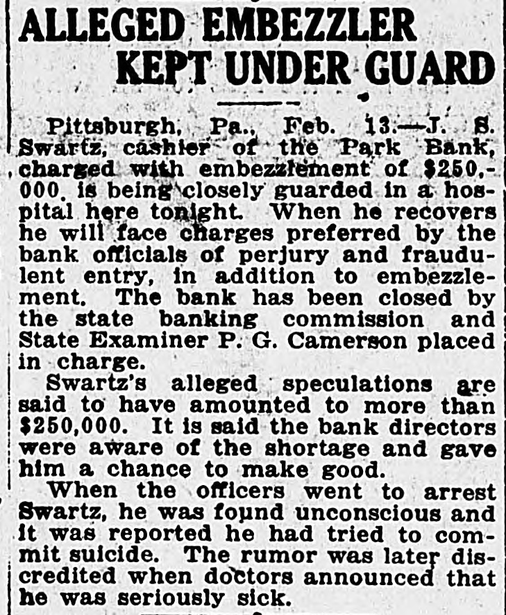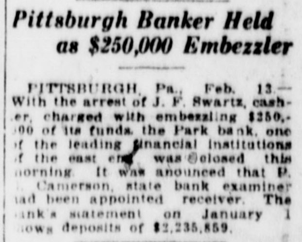 Commonwealth of Pennsylvania, ex rel. William I. Schaffer, Attorney General, vs. The Park Bank. No. 4, Commonwealth Docket, 1919, Court of Common Pleas of Dauphin County, Pennsylvania. To the creditors, stockholders and persons otherwise interested in The Park Bank. NOTICE is hereby given that at 10 o'clock A. M., on Saturday, June 28th, 1919, there will be presented to the Court of Common Pleas of Dauphin County, Pennsylvania, at Harrisburg, Pa., the petition of G. H. Getty, Receiver of The Park Bank, asking for authorization to sell to Hunt B. Miller of Pittsburgh, Pa., the real estate hereinafter described, on the following terms: For the sum or price of $160,000.00, of which $8,000.000 cash has already been received by petitioner as hand money, subject to the confirmation of the sale by the said court; $17,000.00 to be paid upon the said court confirming the said sale; $60,000.00 cash upon delivery of deed; the balance of $75,000.00 by the said purchaser assuming a mortgage of $75,000.00, to which the said property is now subject. The said property is all that certain lot or piece of ground situate in the Seventh Ward of the City of Pittsburgh, County of Allegheny and State of Pennsylvania. Beginning on the southerly side of Penn avenue at the corner of an alley twelve (12) feet wide and said corner being one hundred and twentytwo and eighty-six hundredths (122.86) feet westward from the southwest corner of Shady and Penn avenues; thence along said alley south twenty-six degrees thirty-one minutes, forty-five seconds west two hundreds feet (S. 26 deg. 31 min. 45 sec. W. 200 ft.) to Shakespeare street; thence along said Shakespeare street, north sixty-three degrees, forty-five minutes west thirty-five and twenty-two hundredths feet (N. 63 deg. 45 min. W. 35.22 ft.) to property now of Carl G. Vilsack; thence north twenty-five degrees three minutes east fifty-three and twentytwo hundredths feet (N. 25 deg. 03 min. E. 53.22 feet); thence north sixty-three degrees, forty-five minutes west, forty hundredths feet (N. 63 deg. 45 min. W. 0.40 ft.); thence along property of Carl G. Vilsack north twenty-six degrees thirty-one minutes forty-five seconds east one hundred forty-six and seventy-nine hundredths feet (N. 26 deg. 31 min. 45 sec. E. 146.79 ft.) to Penn avenue; thence along Penn avenue south sixty-three degrees, forty-five minutes east, thirty-seven feet (S. 63 deg. 45 min. E. 37 ft.) to the place of beginning. Having erected thereon a three-story brick building, which was used by the said Park Bank as its place of business. G. H. GETTY, Receiver of The Park Bank. NOTICE is hereby given that Letters of Administration have been granted to the undersigned on the Estate of Grace T. Daniels, late of Harrisburg. Dauphin County, Pa., deceased. All persons being indebted to said Estate are requested to make payment and those having claims against the Estate will presen* them to FRANCIS E. DANIELS, Administrator, 126 State Street, Harrisburg, Pa.