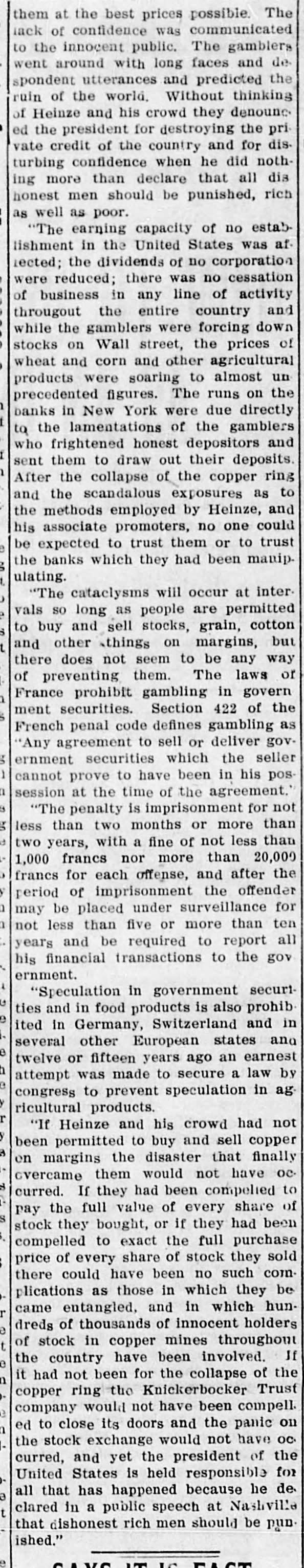 president destroying the private credit of the country and for dis. turbing confidence when he did nothing more than declare that all dis honest men should be punished, rich as well as poor. "The earning capacity of no establishment in the United States was atlected; the dividends of no corporation were reduced; there was no cessation of business in any line of activity througout the entire country and while the gamblers were forcing down stocks on Wall street, the prices of wheat and corn and other agricultural products were soaring to almost un precedented figures. The runs on the banks in New York were due directly to the lamentations of the gamblers who frightened honest depositors and sent them to draw out their deposits. After the collapse of the copper ring and the scandalous exposures as to the methods employed by Heinze, and his associate promoters, no one could be expected to trust them or to trust the banks which they had been manipulating. "The cataclysms will occur at intervals so long as people are permitted to buy and sell stocks, grain, cotton and other things on margins, but there does not seem to be any way of preventing them. The laws of France prohibit gambling in govern ment securities. Section 422 of the French penal code defines gambling as "Any agreement to sell or deliver government securities which the seller cannot prove to have been in his possession at the time of the agreement." "The penalty is imprisonment for not less than two months or more than two years, with a fine of not less than 1,000 francs nor more than 20,000 francs for each offense, and after the period of imprisonment the offender may be placed under surveillance for not less than five or more than ten years and be required to report all his financial transactions to the gov ernment. "Speculation in government securities and in food products is also prohib. ited in Germany, Switzerland and in several other European states and twelve or fifteen years ago an earnest attempt was made to secure a law by congress to prevent speculation in ag. ricultural products. "If Heinze and his crowd had not been permitted to buy and sell copper on margins the disaster that finally overcame them would not have occurred. If they had been compelied to pay the full value of every share of stock they bought, or if they had been compelled to exact the full purchase price of every share of stock they sold there could have been no such complications as those in which they be came entangled, and in which hundreds of thousands of innocent holders of stock in copper mines throughout the country have been involved. If it had not been for the collapse of the copper ring the Knickerbocker Trust company would not have been compell. ed to close its doors and the panic on the stock exchange would not have OC. curred, and yet the president of the