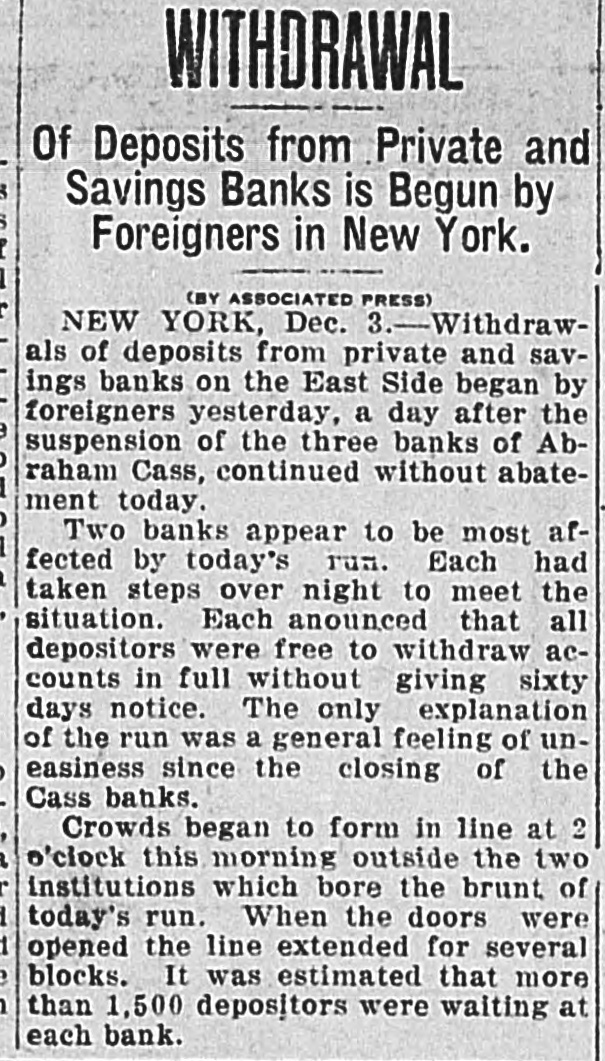 WITHDRAWAL Of Deposits from Private and Savings Banks is Begun by Foreigners in New York. (BY ASSOCIATED PRESS) NEW YORK, Dec. 3.-Withdrawals of deposits from private and savings banks on the East Side began by foreigners yesterday, a day after the suspension of the three banks of Abraham Cass, continued without abatement today. Two banks appear to be most affected by today's run. Each had taken steps over night to meet the situation. Each anounced that all depositors were free to withdraw accounts in full without giving sixty days notice. The only explanation of the run was a general feeling of uneasiness since the closing of the Cass banks. Crowds began to form in line at 2 o'clock this morning outside the two institutions which bore the brunt of today's run. When the doors were opened the line extended for several blocks. It was estimated that more than 1,500 depositors were waiting at each bank.