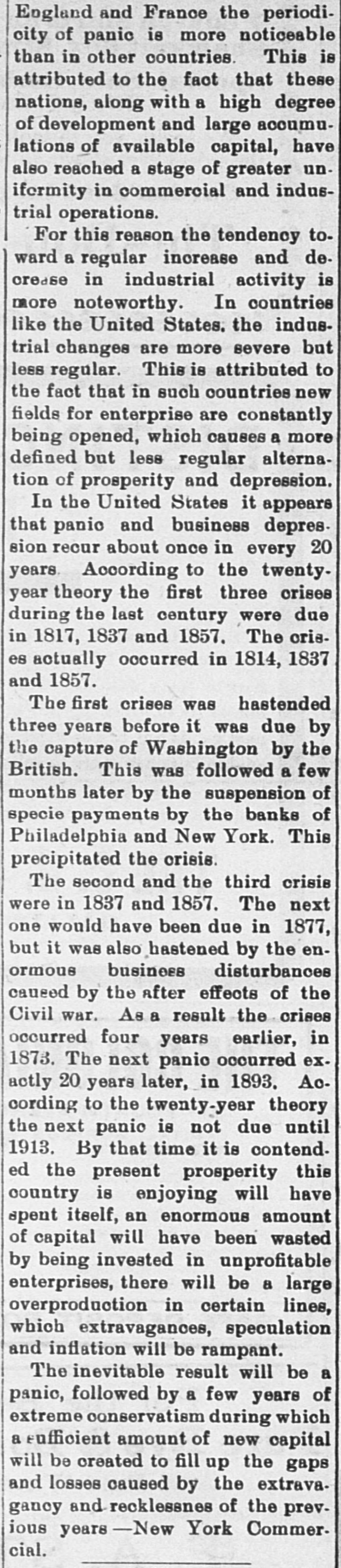 FORMER BANK SUSPENSIONS.-The first general suspension of specie payments by banks, occurred in 1814, immediately after the capture of the city of Washington by the British. The banks of New York and all South and West suspended, and did not resume for three or four years. The general suspension, in 1837, began at New York, May 10, and the next day the banks of Boston, Philadelphia and Baltimore followed. The banks of Cincinnati suspended on the 17th. A general resumption of specie payments was attempted in 1839, but a large proportion of the banks did not succeed in the operation, and a universal resumption was not effected until 1843 and 1844. The suspension in New York, in 1837, was preceded by a period of unprecedented commercial distress. Three hundred heavy firms failed there that spring, with liabilities estimated at forty millions of dollars, and it was said that two thousand men, dependent on their daily labor for their support, were thrown of employment. The pressure was equally severe in other places -one hundred and sixty-eight firms failed in Boston during the six months preceding the suspension.-Er. Paper.