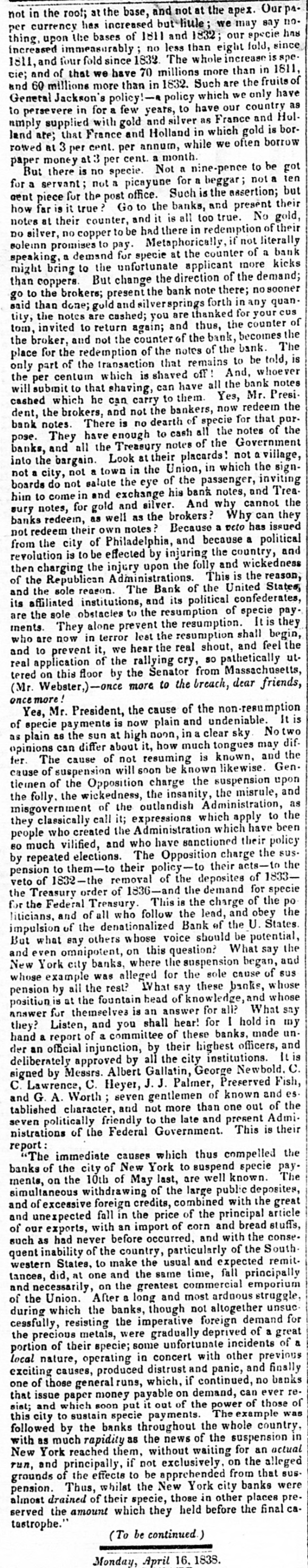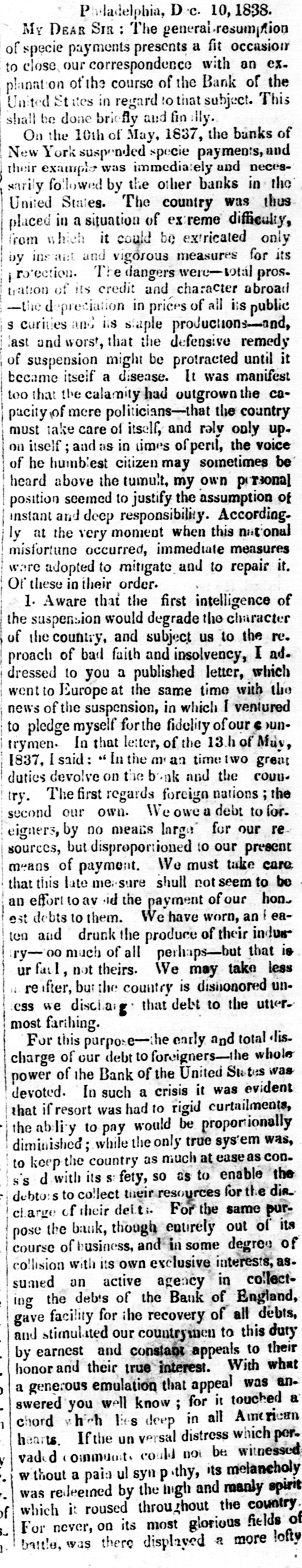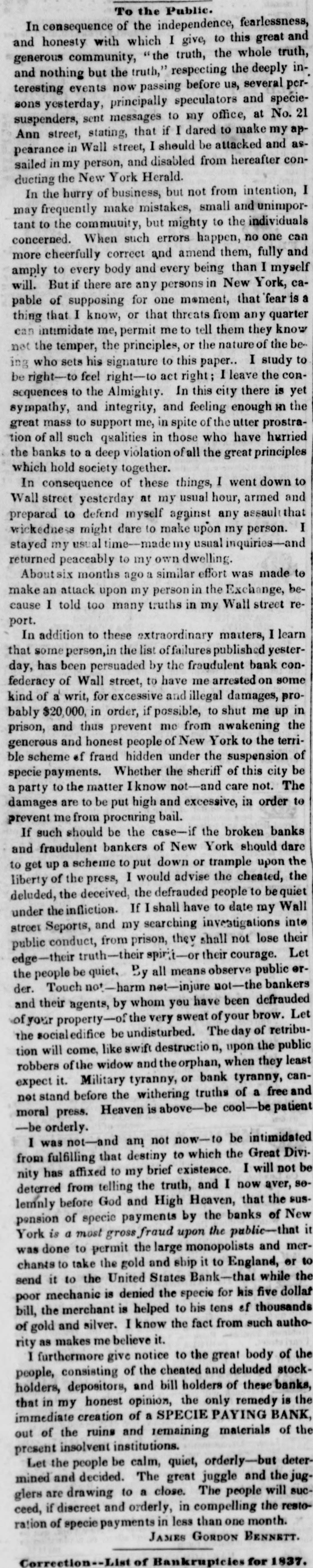 To the Public. In consequence of the independence, fearlessness, and honesty with which I give, to this great and generous community, the truth, the whole truth, and nothing but the truth," respecting the deeply interesting events now passing before us, several perprincipally speculators and speciesent messages to my that if I to my in Wall street, I should pearance suspenders, sons Ann yesterday, street, stating, dared be office, attacked make at and No. ap- as- 21 sailed in my person, and disabled from hereafter conducting the New York Herald. In the hurry of business, but not from intention, I may frequently make mistakes, small and unimportant to the community, but mighty to the individuals concerned. When such errors happen, no one can more cheerfully correct and amend them, fully and amply to every body and every being than I myself will. But if there are any persons in New York, capable of supposing for one moment, that fear is a thing that I know, or that threats from any quarter can intimidate me, permit me to tell them they know not the temper, the principles, or the nature of the being who sets his signature to this paper.. I study to be right-to feel right-to act right; I leave the consequences to the Almighty. In this city there is yet sympathy, and integrity, and feeling enough in the great mass to support me, in spite of the utter prostration of all such qualities in those who have hurried the banks to a deep violation of all the great principles which hold society together. In consequence of these things, I went down to Wall street yesterday at my usual hour, armed and prepared to defend myself against any assault that I wickedness might dare to make upon my person. stayed my usual time-made my usual inquiries-and returned peaceably to my own dwelling. Aboutsix months ago a similar effort was made to make an attack upon my person in the Exchange, because I told too many truths in my Wall street report. In addition to these extraordinary marters, I learn that some person, in the list of failures published yesterday, has been persuaded by the fraudulent bank confederacy of Wall street, to have me arrested on some kind of a writ, for excessive and illegal damages, probably $20,000, in order, if possible, to shut me up in prison, and thus prevent me from awakening the generous and honest people of New York to the terrible scheme of fraud hidden under the suspension of specie payments. Whether the sheriff of this city be a party to the matter Iknow not-and care not. The damages are to be put high and excessive, in order to prevent me from procuring bail. If such should be the case-if the broken banks and fraudulent bankers of New York should dare to get up a scheme to put down or trample upon the liberty of the press, I would advise the cheated, the deluded, the deceived, the defrauded people to be quiet under the infliction. If I shall have to date my Wall street Seports, and my searching investigations into conduct, from prison, they not public shall their lose their Let edge-their truth-their spirit-or courage. the people be quiet, By all means observe public erder. Touch not-harm net-injure not-the bankers and their agents, by whom you have been defrauded of your property-of the very sweat of your brow. Let the socialedifice be undisturbed. The day of retribution will come, like swift destruction, upon the public robbers of the widow and theorphan, when they least expect it. Military tyranny, or bank tyranny, cannet stand before the withering truths of a free and moral press. Heaven is above-be cool-be patient -be orderly. I was not-and am not now-to be intimidated from fulfilling that destiny to which the Great Divinity has affixed to my brief existence. I will not be from the truth, now aver, before God and High lemnly deterred telling Heaven, and I that the sus- sopension of specie payments by the banks of New York is a most gross fraud upon the public-that it was done to permit the large monopolists and merchants to take the gold and ship it to England, or to send it to the United States Bank-that while the poor mechanic is denied the specie for his five dollar bill, the merchant is helped to his tens ef thousands of gold and silver. I know the fact from such authority as makes me believe it. I furthermore give notice to the great body of the of the cheated and deluded stockand holders, people, consisting depositors, bill holders of these banks, that in my honest opinion, the only remedy is the immediate creation of a SPECIE PAYING BANK, out of the ruins and remaining materials of the present insolvent institutions. Let the people be calm, quiet, orderly-but determined and decided. The great juggle and the jug glers are drawing to a close. The people will succeed, if discreet and orderly, in compelling the restoration of specie payments in less than one month. JAMES GORDON BENNETT. Correction--ListofHankruptcies for 1837.