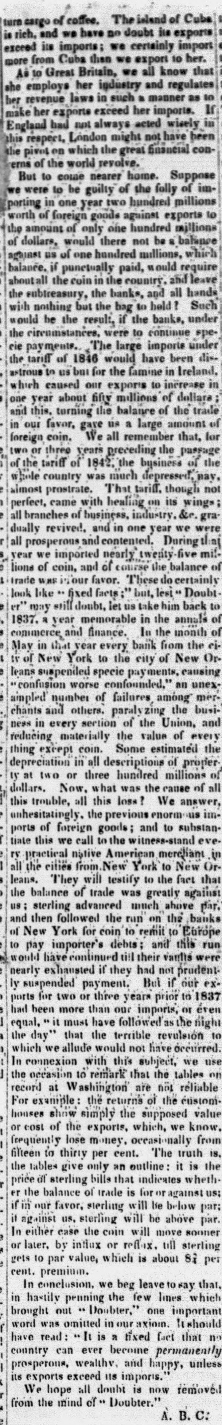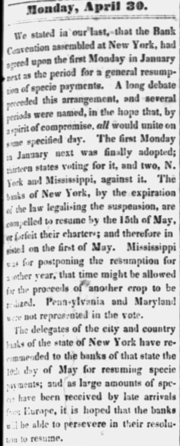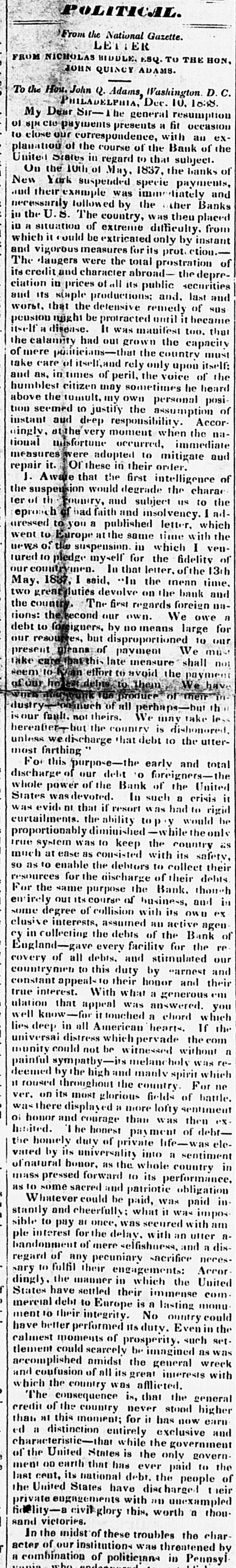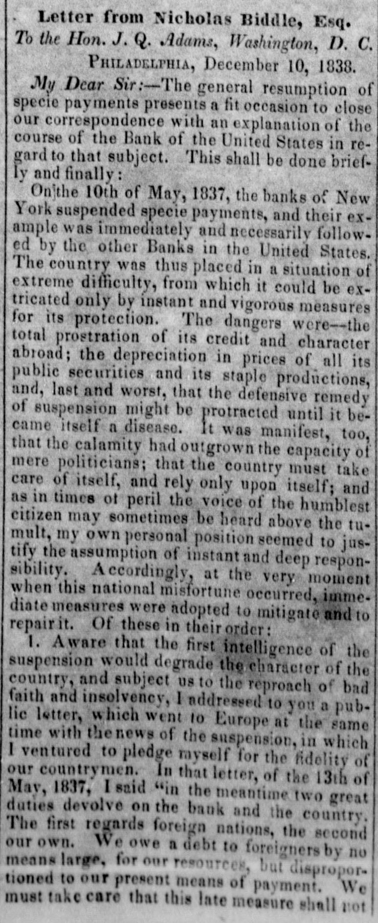 To the Public. In consequence of the independence, fearlessness, and honesty with which I give, to this great and generous community, the truth, the whole truth, and nothing but the truth," respecting the deeply interesting events now passing before us, several perprincipally speculators and speciesent messages to my that if I to my in Wall street, I should pearance suspenders, sons Ann yesterday, street, stating, dared be office, attacked make at and No. ap- as- 21 sailed in my person, and disabled from hereafter conducting the New York Herald. In the hurry of business, but not from intention, I may frequently make mistakes, small and unimportant to the community, but mighty to the individuals concerned. When such errors happen, no one can more cheerfully correct and amend them, fully and amply to every body and every being than I myself will. But if there are any persons in New York, capable of supposing for one moment, that fear is a thing that I know, or that threats from any quarter can intimidate me, permit me to tell them they know not the temper, the principles, or the nature of the being who sets his signature to this paper.. I study to be right-to feel right-to act right; I leave the consequences to the Almighty. In this city there is yet sympathy, and integrity, and feeling enough in the great mass to support me, in spite of the utter prostration of all such qualities in those who have hurried the banks to a deep violation of all the great principles which hold society together. In consequence of these things, I went down to Wall street yesterday at my usual hour, armed and prepared to defend myself against any assault that I wickedness might dare to make upon my person. stayed my usual time-made my usual inquiries-and returned peaceably to my own dwelling. Aboutsix months ago a similar effort was made to make an attack upon my person in the Exchange, because I told too many truths in my Wall street report. In addition to these extraordinary marters, I learn that some person, in the list of failures published yesterday, has been persuaded by the fraudulent bank confederacy of Wall street, to have me arrested on some kind of a writ, for excessive and illegal damages, probably $20,000, in order, if possible, to shut me up in prison, and thus prevent me from awakening the generous and honest people of New York to the terrible scheme of fraud hidden under the suspension of specie payments. Whether the sheriff of this city be a party to the matter Iknow not-and care not. The damages are to be put high and excessive, in order to prevent me from procuring bail. If such should be the case-if the broken banks and fraudulent bankers of New York should dare to get up a scheme to put down or trample upon the liberty of the press, I would advise the cheated, the deluded, the deceived, the defrauded people to be quiet under the infliction. If I shall have to date my Wall street Seports, and my searching investigations into conduct, from prison, they not public shall their lose their Let edge-their truth-their spirit-or courage. the people be quiet, By all means observe public erder. Touch not-harm net-injure not-the bankers and their agents, by whom you have been defrauded of your property-of the very sweat of your brow. Let the socialedifice be undisturbed. The day of retribution will come, like swift destruction, upon the public robbers of the widow and theorphan, when they least expect it. Military tyranny, or bank tyranny, cannet stand before the withering truths of a free and moral press. Heaven is above-be cool-be patient -be orderly. I was not-and am not now-to be intimidated from fulfilling that destiny to which the Great Divinity has affixed to my brief existence. I will not be from the truth, now aver, before God and High lemnly deterred telling Heaven, and I that the sus- sopension of specie payments by the banks of New York is a most gross fraud upon the public-that it was done to permit the large monopolists and merchants to take the gold and ship it to England, or to send it to the United States Bank-that while the poor mechanic is denied the specie for his five dollar bill, the merchant is helped to his tens ef thousands of gold and silver. I know the fact from such authority as makes me believe it. I furthermore give notice to the great body of the of the cheated and deluded stockand holders, people, consisting depositors, bill holders of these banks, that in my honest opinion, the only remedy is the immediate creation of a SPECIE PAYING BANK, out of the ruins and remaining materials of the present insolvent institutions. Let the people be calm, quiet, orderly-but determined and decided. The great juggle and the jug glers are drawing to a close. The people will succeed, if discreet and orderly, in compelling the restoration of specie payments in less than one month. JAMES GORDON BENNETT. Correction--ListofHankruptcies for 1837.
