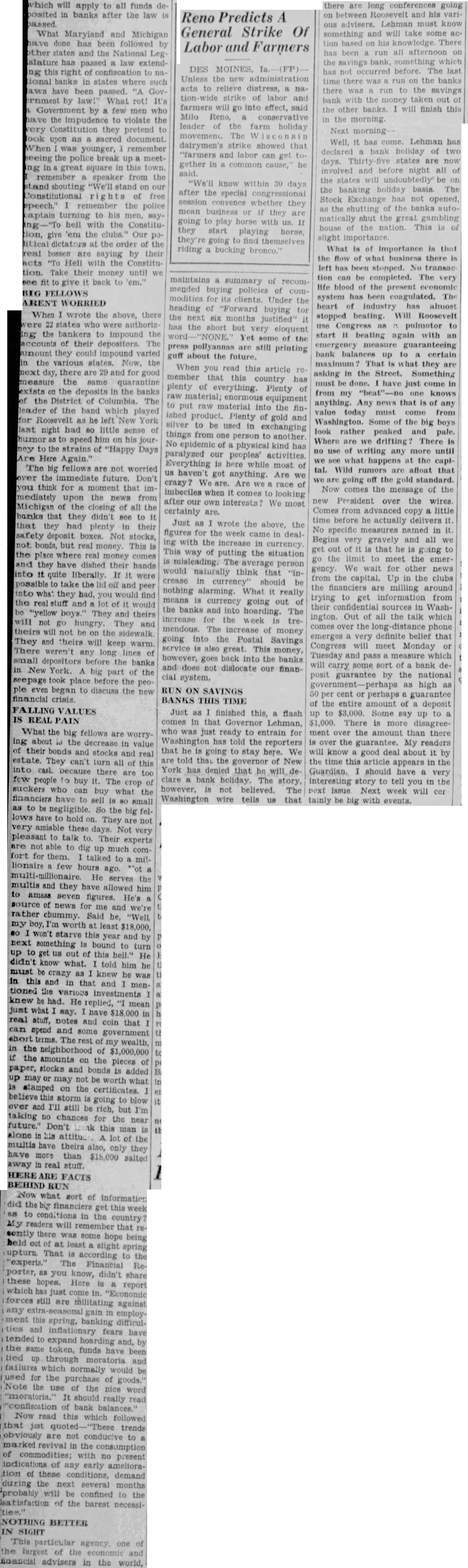 will apply to all funds in banks after the law What Maryiand and Michigan done has been followed by states and the National slature has passed law extendthis right of confiscation to banks states where such have been passed. Government by What rot! It's by few men who the impudence to violate the Constitution they pretend to upon as sacred document. was younger, remember the police break meetgreat square in this town. remember speaker from the shouting on our of free remember the police captain turning to his men, hell with the Constitugive 'em the Our the order of the bosses are saying by their Hell with the ConstituTake their money until back to FELLOWS ARENT WORRIED When wrote the above, there states who were authorizthe bankers impound the of their depositors. The they could impound varied the various states. Now, the there and for good measure the same the deposits in the banks the District Columbia. The leader of the band which played Roosevelt he left New York night had so little sense him his jourthe strains of Days "Happy Here Again." big fellows are not worried immediate future. Don't think for moment that mediately upon the news from Michigan of the closing of the banks that they didn't see had plenty their deposit boxes. Not stocks, bonds, but real money. This the place where real comes money they have dished their hands liberally. If take the and peer they had, you would find and of would They and theirs not hungry They and theirs will not be on the They theirs will keep warm. There weren't any long lines small depositors before the banks New York. big part of the seepage took place before the even began to discuss the financial crisis. VALUES What the big fellows about the decrease value their bonds and stocks and real estate. They turn all of this cash because there are too few people to buy The crop suckers who can buy what financiers have to sell small negligible. So the lows have hold They very amiable these Not days. very pleasant talk Their experts not able to dig up much comfor them. talked to lionaire few hours ago. He serves the multis and they have allowed him to seven figures. source news for and rather chummy. Said he, worth least won't starve this year and next something bound turn up out this He didn't know what. told him must crazy knew he this and in that and tioned the investments knew had. replied, mean just have real stuff, notes and coin that spend and some my the neighborhood of the amounts the pieces paper, stocks and bonds added may may not be worth stamped on the certificates. believe this storm going to over and I'll still but taking chances for the near future.' Don't this alone attitud lot of the multis have theirs also, only they have more than $18,000 salted away real stuff. HERE FACTS BEHIND RUN Now what sort of information financiers this week to in the readers will remember country: that there was some hope being held least slight spring That according to the "experts." The Financial porter, as you know, didn't share these hopes. Here report has forces are militating against employthis spring, banking inflationary fears have tended expand hoarding and, same token, funds have been tied through moratoria failures which normally would for the purchase of goods." Note the use of the nice word should really read of bank balances." Now read this which followed that just trends obviously are not conducive to marked revival the consumption commodities; with no present indications any early amelioration these conditions, demand during the next several months "probably will be confined the Isatisfaction of the barest necessi- NOTHING BETTER SIGHT This particular largest of the economic and financial advisers in the world, Reno Predicts General Strike Of Labor Farmers DES Unless the administration acts relieve distress, strike of labor and farmers will into effect, said Milo Reno, conservative leader of the farm holiday movement. The dairymen's strike showed that "farmers and labor can gether in common know days after the special congressional session whether they mean business they are going to play horse with they start playing horse, find themselves riding bucking bronco." maintains summary of recommended policies of modities clients. Under the heading "Forward buying tor the next six months justified" has the short but very eloquent some of the pollyannas still printing guff about the future. When you read this article member that this country plenty everything. Plenty raw material; equipment put material into the finished product. Plenty of gold and silver be used in exchanging things from one person to No physical kind has paralyzed our peoples' activities. Everything is here while most us haven't got anything. Are we crazy? Are of race imbeciles when comes to looking after interests? We most certainly are. Just wrote the above, the figures for the week came in dealwith the increase in currency. This way putting the situation misleading. person would naturally think that crease in should be nothing alarming. What it really means currency going out the banks and into hoarding. The increase for the week tremendous. The increase of money going into the Postal Savings service is also great. This money, however, goes back into the banks dislocate our financial system. RUN ON SAVINGS BANKS THIS TIME Just finished this, flash comes in that Governor Lehman, who was just ready to entrain for Washington has told the reporters that going to stay here. We that the governor of New York denied that he clare bank holiday. The story, however, not believed. Washington wire tells that there are long conferences going between Roosevelt and advisers. Lehman must know something and will take some his There has been run all afternoon the savings bank, something which occurred before. The last time there run the banks there was the savings bank the money taken out the other banks. will finish this the Next Well, has come. Lehman has declared bank holiday of two days. st