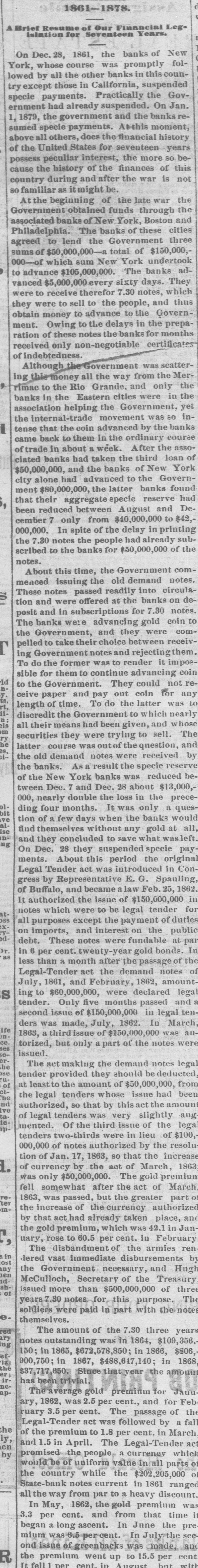 # 1861-1878. # A Brief Resume of Our Financial Legislation for Seventeen Years. On Dec. 28, 1861, the banks of New York, whose course was promptly followed by all the other banks in this country except those in California, suspended specie payments. Practically the Government had already suspended. On Jan. 1, 1879, the government and the banks resumed specie payments. At this moment, above all others, does the financial history of the United States for seventeen years possess peculiar interest, the more so because the history of the finances of this country during and after the war is not so familiar as it might be. At the beginning of the late war the Government obtained funds through the associated banks of New York, Boston and Philadelphia. The banks of these cities agreed to lend the Government three sums of $50,000,000-a total of $150,000,000-of which sum New York undertook to advance $105,000,000. The banks advanced $5,000,000 every sixty days. They were to receive therefor 7.30 notes, which they were to sell to the people, and thus obtain money to advance to the Government. Owing to the delays in the preparation of these notes the banks for months received only non-negotiable certificates of indebtedness. Although the Government was scattering thie money all the way from the Merrimac to the Rio Grande, and only the banks in the Eastern cities were in the association helping the Government, yet the internal-trade movement was so intense that the coin advanced by the banks came back to them in the ordinary course of trade in about a week. After the associated banks had taken the third loan of $50,000,000, and the banks of New York city alone had advanced to the Government $80,000,000, the latter banks found that their aggregate specie reserve had been reduced between August and December 7 only from $40,000,000 to $42,000,000. In spite of the delay in printing the 7.30 notes the people had already subscribed to the banks for $50,000,000 of the notes. About this time, the Government commenced issuing the old demand notes. These notes passed readily into circulation and were offered at the banks on deposit and in subscriptions for 7.30 notes. The banks were advancing gold coin to the Government, and they were compelled to take their choice between receiving Government notes and rejecting them. To do the former was to render it impossible for them to continue advancing coin to the Government. They could not receive paper and pay out coin for any length of time. To do the latter was to discredit the Government to which nearly all their means had been given, and whose securities they were trying to sell. The latter course was out of the question, and the old demand notes were received by the banks. As a result the specie reserve of the New York banks was reduced between Dec. 7 and Dec. 28 about $13,000,000, nearly double the loss in the preceding four months. It was only a question of a few days when the banks would find themselves without any gold at all, and they concluded to save what was left. On Dec. 28 they suspended specie payments. About this period the original Legal Tender act was introduced in Congress by Representative E. G. Spauling, of Buffalo, and became a law Feb. 25, 1862. It authorized the issue of $150,000,000 in notes which were to be legal tender for all purposes except the payment of duties on imports, and interest on the public debt. These notes were fundable at par in 6 per cent. twenty-year gold bonds. In less than a month after the passage of the Legal-Tender act the demand notes of July, 1861, and February, 1862, amounting to $60,000,000, were declared legal tender. Only five months passed and a second issue of $150,000,000 in legal tenders was made, July, 1862. In March, 1863, a third issue of $150,000,000 was authorized, but only a part of the notes were issued. The act making the demand notes legal tender provided they should be deducted at least to the amount of $50,000,000, from the legal tenders whose issue had been authorized, so that by this act the amount of legal tenders was very slightly augmented. Of the third issue of the legal tenders two-thirds were in lieu of $100,000,000 of notes authorized by the resolution of Jan. 17, 1863, so that the increase of currency by the act of March, 1863 was only $50,000,000. The gold premium fell somewhat after the act of March, 1863, was passed, but the greater part of the increase of the currency authorized by that act had already taken place, and the gold premium, which was 42.1 in January, rose to 60.5 per cent. in February. The disbandment of the armies rendered vast immediate disbursements by the Government necessary, and Hugh McCulloch, Secretary of the Treasury, issued more than $500,000,000 of three years 7.30 notes for this purpose. The soldiers were paid in part with the notes themselves. The amount of the 7.30 three years notes outstanding was in 1864, $109,356,150; in 1865, $672,578,850; in 1866, $806,900,750; in 1867, $488,647,140; in 1868, $37,717,650. Since that year the amount has been trivial. The average gold premium for January, 1862, was 2.5 per cent., and for February 3.5 per cent. The passage of the Legal-Tender act was followed by a fall of the premium to 1.8 per cent. in March, and 1.5 in April. The Legal-Tender act promised the people a currency which would be of uniform value in all parts of the country while the $202,205,000 of State-bank notes current in 1861 ranged all the way from par to a heavy discount. In May, 1862, the gold premium was 3.3 per cent. and from that time it began a long ascent. In June the premium was 6.5 per cent. In July the second issue of greenbacks was made, and the premium went up to 15.5 per cent. It fell 1 per cent. in August. ant with