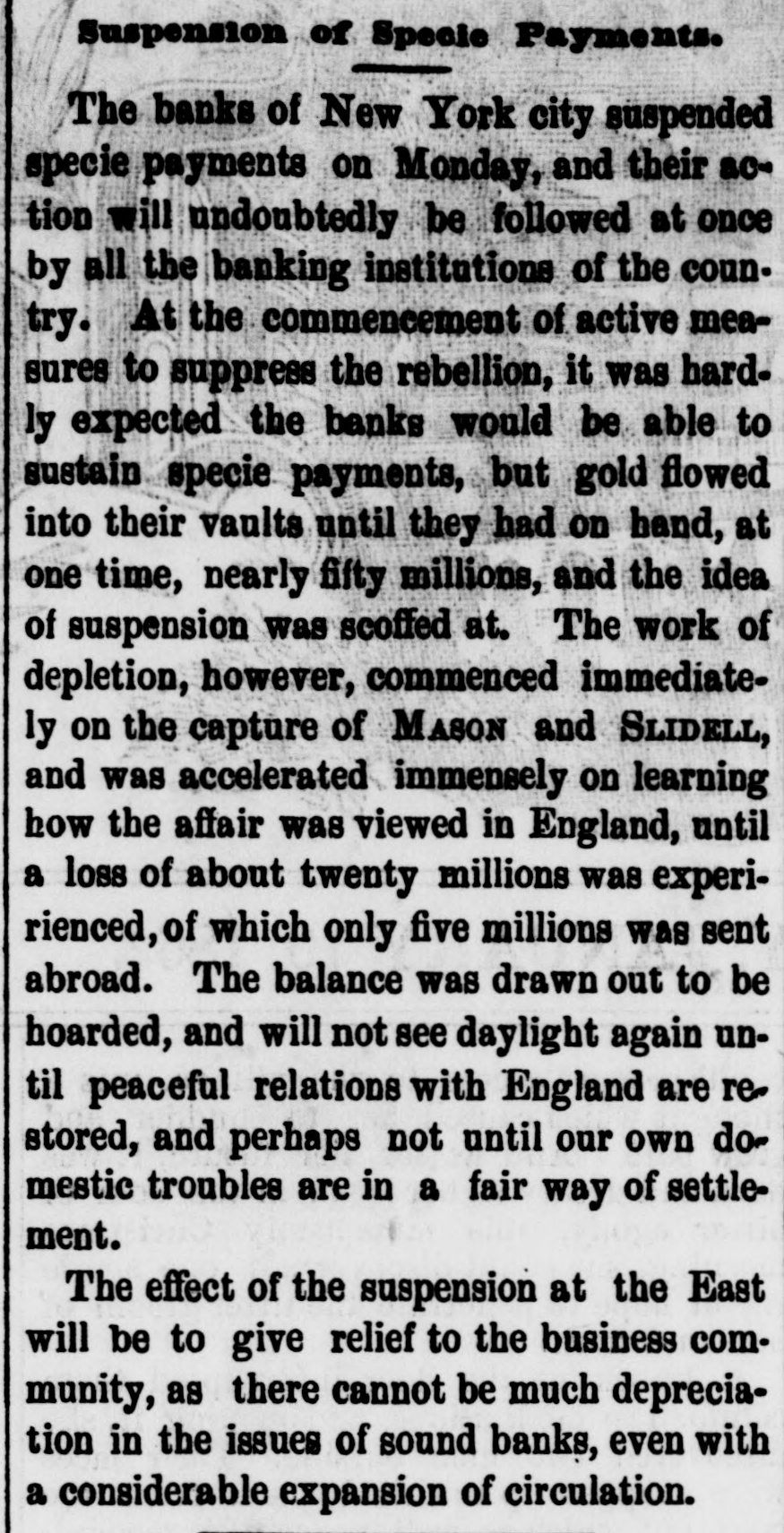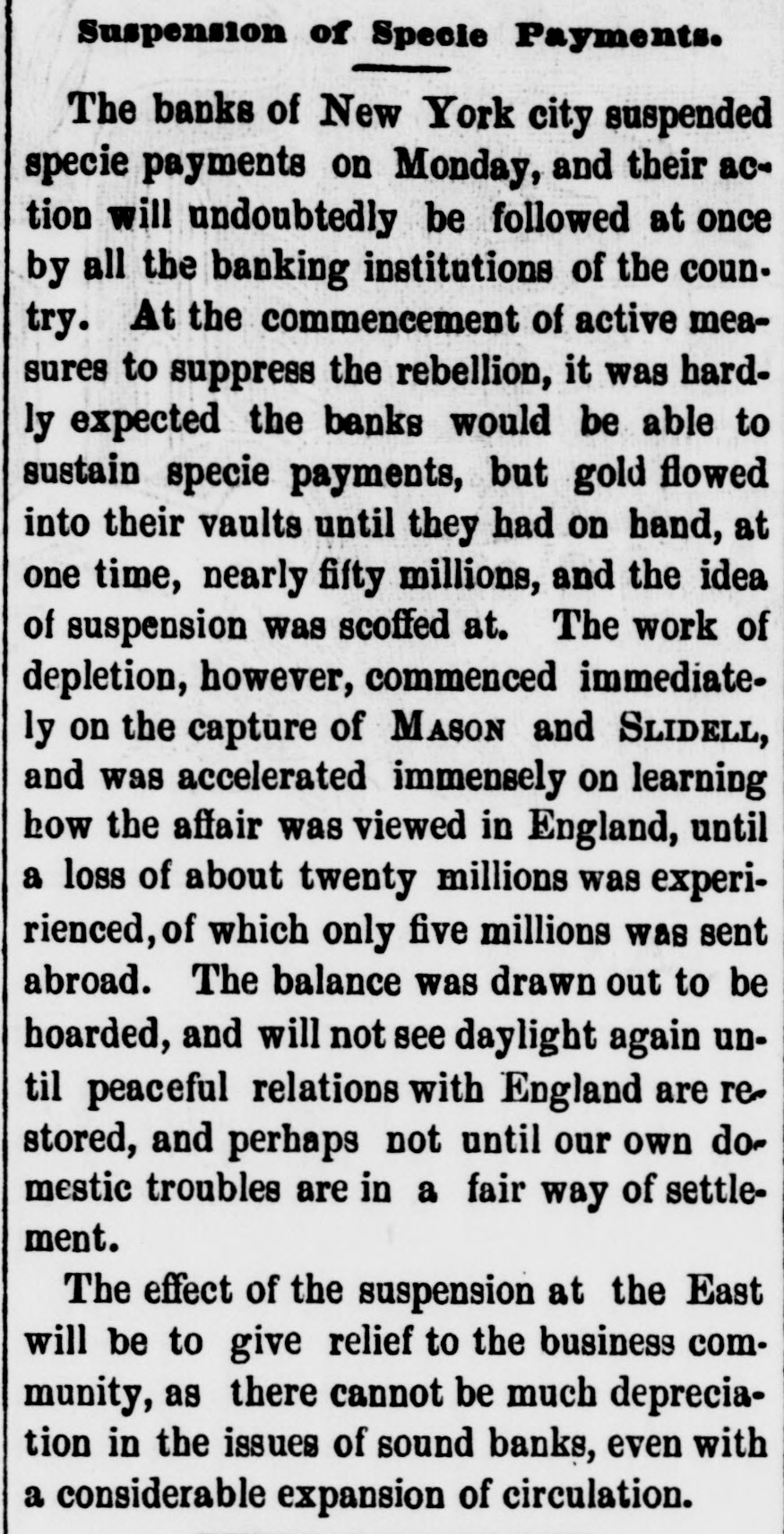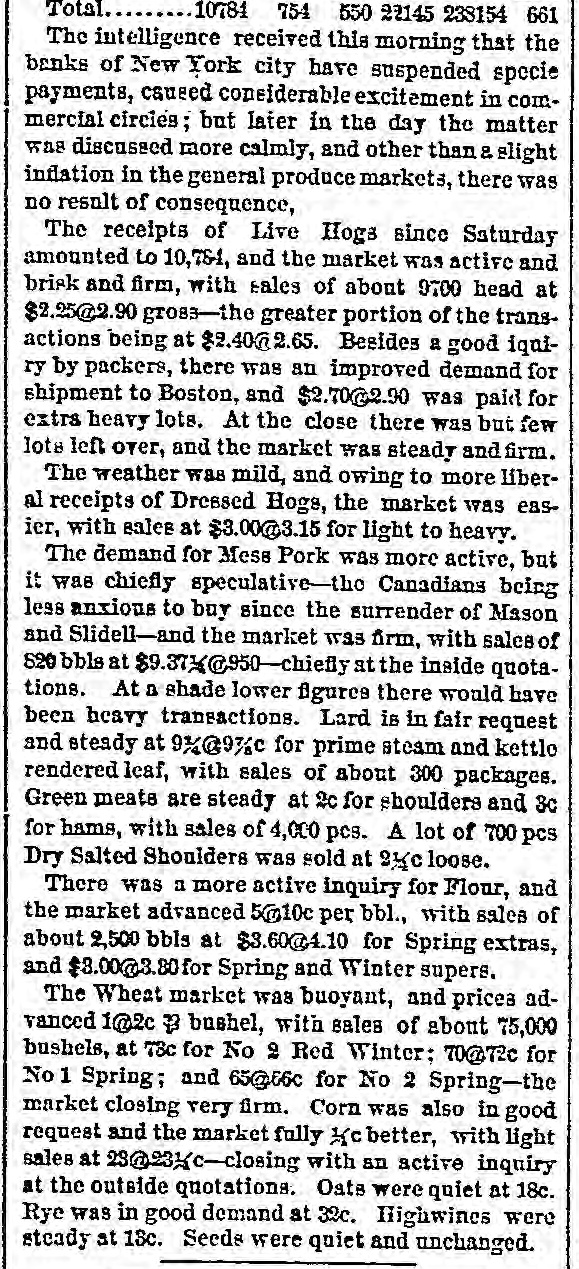 # Total 10781 754 550 22145 233154 661 The intelligence received this morning that the banks of New York city have suspended specie payments, caused considerable excitement in commercial circies; but later in the day the matter was discussed more calmly, and other than a slight inflation in the general produce markets, there was no result of consequence, The receipts of Live Hogs since Saturday amounted to 10,781, and the market was active and brisk and firm, with sales of about 9700 head at $2.25@2.90 gross—the greater portion of the transactions being at $2.40@2.65. Besides a good iqui-ry by packers, there was an improved demand for shipment to Boston, and $2.70@2.90 was paid for extra heavy lots. At the close there was but few lots left over, and the market was steady and firm. The weather was mild, and owing to more liberal receipts of Dressed Hogs, the market was easier, with sales at $3.00@3.15 for light to heavy. The demand for Mess Pork was more active, but it was chiefly speculative—the Canadians being less anxious to buy since the surrender of Mason and Slidell—and the market was firm, with sales of 820 bbls at $9.37@950—chiefly at the inside quota-tions. At a shade lower figures there would have been heavy transactions. Lard is in fair request and steady at 9%@9%c for prime steam and kettle rendered leaf, with sales of about 300 packages. Green meats are steady at 2c for shoulders and 3c for hams, with sales of 4,000 pcs. A lot of 700 pcs Dry Salted Shoulders was sold at 24c loose. There was a more active inquiry for Flour, and the market advanced 5@10c per bbl., with sales of about 2,500 bbls at $3.60@4.10 for Spring extras, and $3.00@3.80 for Spring and Winter supers. The Wheat market was buoyant, and prices advanced 1@2c bushel, with sales of about 75,000 bushels, at 78c for No 2 Red Winter; 70@72c for No 1 Spring; and 65@66c for No 2 Spring—the market closing very firm. Corn was also in good request and the market fully Ac better, with light sales at 23@234c—closing with an active inquiry at the outside quotations. Oats were quiet at 18c. Rye was in good demand at 32c. Highwines were steady at 18c. Seeds were quiet and unchanged.