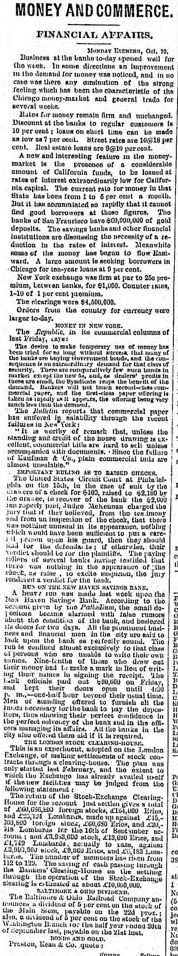 MONEY AND COMMERCE. FINANCIAL AFFAIRS. MONDAY EVENING, Oct. 10. Business at the banka-to-day opened well for the week. In some directions an improvement 111 the domand for money was noticed, and in no case was there any diminution of the strong feeling which hns been the characteristic of the Chicago money-market and goneral trado for several weeks. Rates for money remain firm and unchanged. Discount at the banks to regular customers is 10 per cent ; loans on short time can be made as low as7 per cont. Street rates are 10@18 per cent. Real estato loans are 9@10 per cent. A now and interesting feature In the moneymarket is the presence of a considerable amount of California funds, to be lonned at rates of interest extraordioarily low for Callfornia capital. The current rate for money in that State has been from 1 to 6 per cent a month. But it has accumminted BO rapidly that it caunot find good borrowers at those figures. The banks of San Francisco have $00,000,000 of gold deposits. The savings banks and other fluancial institutions are disoussing the necessity of n reduction in the rates of Interest. Meanwhile вошо of the monoy has begun to flow Enstward. A large amount is seeking borrowers in Chicago for ten-year loans at 9 per cent. Now York exchange was firm at par to 25c promium, between banks, for $1,000. Counter intos, 1-10 of 1 per cent premium. The clearings wore $4,500,000. Ordors from the country for currency were larger to-day. MONEY IN NEW YORK. The Republic, in its commercial columns of last Friday, Eays: The desire to make temporary use of money bas been tried for BO long without success that many of the banks are boying Government bonds. and the consequence In nu extraordinary demand for that class in of security. There are comparatively few such bonds in market except the new On, and, ns dealers' profits the tuese are small, the Syndicate reaps the benefit of demand. Bankers will not tonch second-class commercial paper, and the first-cluss paper offering is taken ns impidly as It appears, the offering being very much less than the demand. The Bulletin reports that commercial paper has suffored in salability through the recent failures in New York: It 18 wortby of remark that, unloss the standing and credit of the house drawing 18 EX$ collent, commercial bills are hard to sell unless accompanied with documents. Since the failure Я of Kaufman & Co., plain commercial bills are almost unsulable." IMPORTANT RULING AB TO RAISED CHECKS. The United States Circuit Court at PhiladelI phis on the 15th, in the case of suit by the of a check for $100, raised to $2,100 by I the drawee, to recover of the bank the $2,000 reperly paid, Judge Mckennan charged the jury that it they believed, from the imony and from un inspection of the check, that there was nothing unusual in its appearance. nothing which would have been sufficient to put a careint person upon his guard, then they should n Had for the defends to if otherwise. their et verdict should Le for the plaintiffs. The paying 11 reflers of several banks having testitied that there was nothing in the appearatico of the check, ns raine to excite suspicion, the jury rendered a verdict for the bank. RUN ON THE NEW HAVEN SAVINGS BANK. F A heav run was made last wook upon the 11 New Haven Savings Bank. According to the c account given by the Pallulium, the small do0 ositors became alarmed with false rumors R about the condition of the bank, and besieved B 118 doors for two days. All the prominent busi(1 1' neks and financial men in the city are said to B look upon the bank ns perfectly sound. The o run is confined almost exclusively to that class B of persons who are unable to write their own I'd minics. Nine-tenths of those who drew out L their money had to make a mark in lion of writT. 11 mg their names in signing the receipt. The D. bank officials paid out $90,000 on Friday, 1, and Lept their doors opun until 4:30 C. p. m.,-one-half hour beyond their usual time. SI Men of standing offered to furnish all the It hunds necessary for the bank to pay the depos= W itors, thus showing their perfect confidence in l'd the perfect nolvency of the bank and in the offiLa cers managing its affairs. All the banks in the HI city also offered them aid if it is required. L.t THE LONDON STOCK CLEARING-HOUSE. S. This IB nn experiment, adopted on the London Exchange, of making settlements of stock contracts through a clearing-honso. The plan was only started last February, and the extent to Po which the Exchange has already availed Holf G: of the new facilities may be jndged from the E following statement : (1 D. The return of the Stock-Exchange Clearinga House for the account just sottled gives a total DE of 200,086,800 foreign stocks, £164,000 Eries, H. and 223,134 Lombarus, made up against £45,H 003,800 foreign block, 100,090 Erics, and 230,Fl 018 Lombards for the 10th of September ncDi count and £3,958,000 stock, £13,690 Erics, and 21,749 Lombards. accually to cass, against CO £3,900,000 steck, £9,000 Enes, and £6,183 Lom3S baros. The number of members line risen from 112 to 120. The saving of cash passing through the Bankers' Clearing-House on the setting st through the operation of the Stock-Exehange 1 clearing is estimated at about £10,000,000. BALTIMORE & OHIO DIVIDEND. No The Baltimore & Ohio Railroad Company an(5 CO nounces it dividend of 5 per cent on the stock of the Main Stem, payable ou the 22d prox. jee wl also. 22 dividend of 5 per cent on the stock of the ro Washington Branch 102 the half your ended 30th No of September last, payable on the 21st last. BONDS AND GOLD. do Preston, Kean & Co. quoto 00