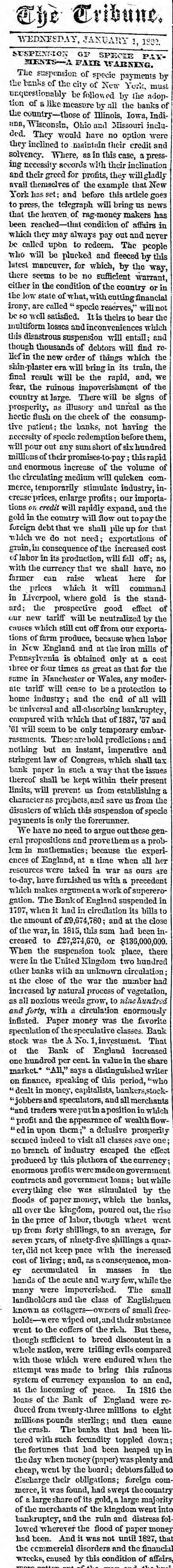 The Tribune. WEDNESDAY, JANUARY 1, 1902. # SUSPENSION OF SPECIE PAYMENTS-A FAIR WARNING. The suspension of specie payments by the banks of the city of New York, must unquestionably be followed by the adoption of a like measure by all the banks of the country-those of Illinois, Iowa, Indiana, Wisconsin, Ohio and Missouri included. They would have no option were they inclined to maintain their credit and solvency. Where, as in this case, a pressing necessity accords with their inclination and their greed for profits, they will gladly avail themselves of the example that New York has set; and before this article goes to press, the telegraph will bring us news that the heaven, of rag-money makers has been reached-that condition of affairs in which they may always pay out and never be called upon to redeem. The people who will be plucked and fleeced by this latest mancuver, for which, by the way, there seems to be no sufficient warrant, either in the condition of the country or in the low state of what, with cutting financial irony, are called "specie reserves," will not be so well satisfied. It is theirs to bear the multiform losses and inconveniences which this disastrous suspension will entail; and though thousands of debtors will find relief in the new order of things which the shin-plaster era will bring in its train, the final result will be the rapid, and, we fear, the ruinous impoverishment of the country at large. There will be signs of prosperity, as illusory and unreal as the hectic flush on the check of the consumptive patient; the banks, not having the necessity of specie redemption before them, will pour out any sum short of six hundred millions of their promises-to-pay; this rapid and enormous increase of the volume of the circulating medium will quicken commerce, temporarily stimulate industry, increase prices, enlarge profits; our importations on credit will rapidly expand, and the gold in the country will flow out to pay the foreign debt that we shall pile up for that which we do not need; exportations of grain, in consequence of the increased cost of labor in its production, will fell off; as, with the currency that we shall have, no farmer can raise wheat here for the prices which it will command in Liverpool, where gold is the standard; the prospective good effect of our new tariff will be neutralized by the causes which still cut off from our exportations of farm produce, because when labor in New England and at the iron mills of Pennsylvania is obtained only at a cost three or four times as great as that for the same in Manchester or Wales, any moderate tariff will cease to be a protection to home industry; and the end of all will be universal and all-absorbing bankruptcy, compared with which that of 1837, '57 and '61 will seem to be only temporary embarrassments. These are bold predictions: and nothing but an instant, imperative and stringent law of Congress, which shall tax bank paper in such a way that the issues thereof shall be kept within their present limits, will prevent us from establishing a character as prophets, and save us from the disasters of which this suspension of specie payments is only the forerunner. We have no need to argue out these general propositions and prove them as a problem in mathematics; because the experiences of England, at a time when all her resources were taxed in war as ours are to-day, have furnished us with a precedent which makes argument a work of supererogation. The Bank of England suspended in 1797, when it had in circulation its bills to the amount of £9,674,780; and at the close of the war, in 1815, this sum had been increased to £27,274,670, or $136,000,000. When the suspension took place, there were in the United Kingdom two hundred other banks with an unknown circulation; at the close of the war the number had increased by natural process of vegetation, as all noxious weeds grow, to nine hundred and forty, with a circulation enormously inflated. Paper money was the favorite speculation of the speculative classes. Bank stock was the A No. 1, investment. That of the Bank of England increased one hundred per cent. in value in the share market. "All," says a distinguished writer on finance, speaking of this period, "who "dealt in money, capitalists, bankers, stock-“jobbers and speculators, and all merchants "and traders were put in a position in which "profit and the appearance of wealth flowed in upon them;" a delusive prosperity seemed indeed to visit all classes save one; no branch of industry escaped the effect produced by this plethora of the currency; enormous profits were made on government contracts and government loans; but while everything else was stimulated by the floods of paper money, which the banks, all over the kingdom, poured out, the rise in the price of labor, though wheat went up from forty shillings, to an average, for seven years, of ninety-five shillings a quarter, did not keep pace with the increased cost of living; and, as a consequence, money accumulated in masses in the hands of the acute and wary few, while the many were impoverished. The small landholders and the class of Englishmen known as cottagers-owners of small freeholds-were wiped out, and their substance went to the coffers of the rich. But these, though sufficient to breed discontent in a whole nation, were trifling evils compared with those which were endured when the attempt was made to bring this ruinous system of currency expansion to an end, at the incoming of peace. In 1816 the loans of the Bank of England were reduced from twenty-three millions to eight millions pounds sterling; and then came the crash. The banks that had been littered with such fecundity toppled down; the fortunes that had been heaped up in the day when money (paper) was plenty and cheap, went by the board; debtors failed to discharge their obligations; foreign commerce, it was found, had swept the country of a large share of its gold, a large majority of the