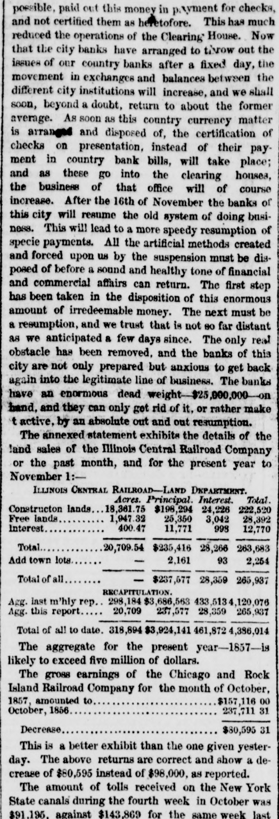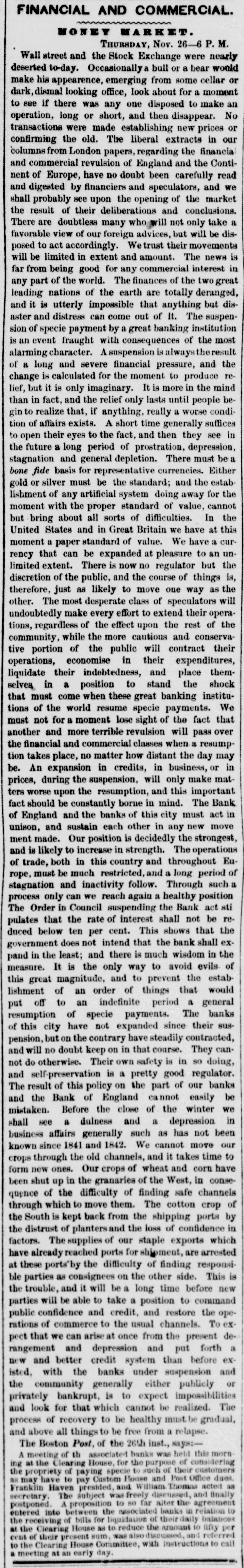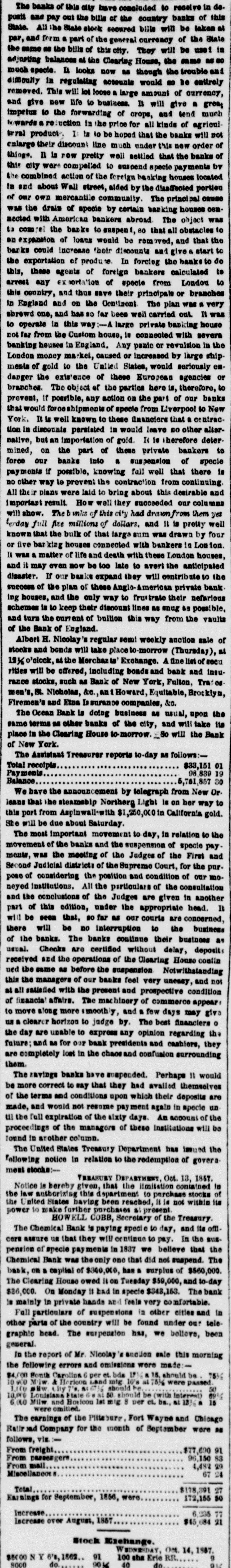 State. All the State stock secured bills will be taken at par, and form a part of the general currency of the State the same - the bills of this city. They will be use 1 in adjusting balances at the Clearing House, the same as so much specie. It looks now as though the trouble and difficulty in regulating accounts would so be entirely removed. This will let loose large amount of currency, and give new life to business. It will give a great impetus to the forwarding of crops, and tend much towards a reduction in he price for all kinds of agricul tryal product I is to be hoped that the banks will not enlarge their discount line much under this new order of things. It is now pretty well settled that the banks of this city were compelled to suspend specie payments by the combined action of the foreign backing houses located in and about Wall street, alded by the disaffected portion of our own mercantile community. The princip cause was the drain of specie by certain backing houses cenmeeted with American bankers abroad The object was to comrel the banks to suspent, 60 that all obstacles to an expansion of loans would be removed, and that the barks could increase their discounts and give & start to the exportation of produce In forcing the banks to do this, these agents of foreign bankers calculated to arrest any exportation of specie from London to this country, and thus save their principals or branches in England and on the Continent The plan was a very sbrewd one, and has so far been well carried out. It was to operate in this way :-A large private banking house not far from the Custom house, is connected with severa banking heuses in England, Any panic or revulsion in the London money market, caused or increased by large shipments of gold to the United States, would seriously emdanger the existence of these Europeas agencies or branches. The object of the parties here is, therefore, to prevent, If possible, any action on the part of our banks that would shipments of specie from Liverpool to New York, It is well known to these disanciers that a centrac. tion in discounts persisted in would leave no other alternative, but an importation of gold. It is herefore deter. mined, on the part of these private bankers to force our banks into a suspension of specie payments if possible, knowing fall well that there is no other way to prevent the contraction from continuing All their plans were laid to bring about this desirable and important result. How well they succeeded our columns will show. The walcs of this city had drawnfrom them yes terday full five millions of dollars. and It is pretty well known that the bulk of that large sum was drawn by four or five bar king houses connected with bankers in Lon ion. It was a matter of life and death with these London houses, and it may even now be too late to avert the anticipated disaster. If our banks expand they will contribute to the success of the plan of these Anglo- American private bank ing houses, and the only way to fruitrate their nefarious schemes is to keep their discount lines as snug as possible. and turn the current of bullion this way from the vaults of the Bank of England. Albert H. Nicolay's regular semi weekly anotion sale of stocks and bonds will take e to-morrow (Thursday), at 19½ o'cleck, at the Merchaz Exchange. A fine list of secu rities will be offered, including bonds and bank and Insuracce stocks, such as Bank of New York, Fulton, Trates men's, St. Nicholas, &c., an Howard, Equitable, Brocklyn, Firemen's and Etna surance companies, &o. The Ocean Bank is doing business as usual, upon the same terms as other banks of the city, and will take its place in the Clearing House to-morrow. So will the Bank of New York. The Assistant Treasurer reports to-day as follows:Total receipts $33,151 01 Payments 98 839 19 Balance 5,761 30 We have the announcement by telegraph from New Or. leans that the steamsbip Northerg Light is on her way to this port from Aspinwall-with $1,250,000 in California gold. She will be due about Saturday. The most important movement to day, in relation to the movement of the banks and the suspension of specie pay. ments, was the meeting of the Judges of the First and Second Judicial districts of the Supreme Court, for the pur. pose of considering the position and condition of our moneyed Institutions. All the particulars of the consultation and the conclusions of the Judges are given in another part of this edition, under the appropriate head. It will be seen that, so far as our courts are concerned, there will be no interruption to the business of the banks. The banks continue their business as usual. Checks are certified without delay, deposits received and the operations of the Clearing House contin ued the same as before the suspension Netwithstanding this the managers of our banks feel very uneasy, and not at all satisfied with the present and prospective condition of financial affairs. The machinery of commerce appear to move along more smoothly, and a few days may give us a clearer horizon to judge by. The best financiers 0 the day are unable to express any opinion regarding the future; and as for OUR bank presidents and cashiers, they are completely lost in the chaos and confusion surrounding them. The savings banks have suspended. Perhaps 11 would be more correct to say that they had availed themselves of the terms and conditions upon which their deposits are made, and would not resume pay ment again in specie un til the full expiration of the sixty days. An account of the proceedings of the managers of these institutions will be found in another column. The United States Treasury Department has issued the following notice in relation to the redemption of govera ment stocks:TREASURY DEPARTMENT, Oct. 13, 1867. Notice is bereby given, that the limitation contained in the law authorizing this spartment to purchase stocks of the United States having been reached, It is not within its power to make further p