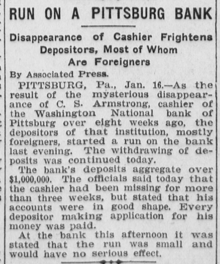 DEPOSITORS AWED BY PILES OF GOLD IT STOPS RUN ON BANK OF PITTSBURG FOLLOWING FLIGHT OF CASHIER. THE STORY IS DENIED By President That Missing Man Ab. sconded With Sum Rumored From $50,000 to $100,000. Pitsburg, Pa. Jan. -The run on the Washington National bank of Pittsburg, which began yesterday afternoon, continued throughout all today, but tonight it is thought the run has been broken. The sight of immense piles of gold, silver and bank notes piled inside the bank railings all days appears to have a good effect on the army of depositors, who dash. ed for the bank at all hours today, bank book in hand. The run was brought about by infor mation coming to depositors of the bank that Cashier S. C. Armstrong had disappeared some time ago and that every effort had ben made by the officers of the bank to keep this from the public. Th's was true. It developed that Cashier Armstrong mysteriously disappeared from the bank on the aftternoon of January 2. Since that time the authorities in different parts of the country have been loking for him. A poster with his picture and description has been sent out by Super intendent of Detectives McQuade, who tonight offered $200 reward for information regarding his whereabouts. Defalcation Rumored. The information also came to the stockholders that Armstrong had absconded with from $50,000 to $100,000 of the bank's money and it was this that started the run. When President Reilly tonight reached a spot where he could breathe he denied that Armstrong had taken one cent of the bank's money. He said the cashier had simply di sappeared mysteriously and that his accounts were found to be in the best of shape. President Reilly admitted that he had suppressed the news of the cashier's disappearance to prevent a run. When the run opened shortly after noon yesterday there were scores of depositors who drew their money be fore time for closing the bank. It was seen that the reaf trouble would come this morning when those who had heard the story of the missing cashier and the rumor of defalcation had time to scatter the inf rmation and the bank people made haste to get in shape to meet any contingency It is tonight claimed that as early as noon yesterday word was sent to New York for a consignment of money to be rushed to Pritsburg to meet the expected run. When the doors of the bank swung open at 9 o'clock this morning to ad mit about 100 scired depositors the counters simply groaned under the weight of gold and silver. One of the bank employes admitted tonight that there was just $700,000 in sight when the bank opened. The story that the bank was re-inforced by almost $1,000. 000 during the night finds credence in Pittsburg. Awed By Piles of Money. The money in sight seemed to have a good effect on the depositors, and the line soon fell off. but depositors kept coming all the day in little knots. One Hebrew merchant had been out of town when he heard of the cashier having gone, and he ran all the way from the country, almost dropping from exhaustion as he landed in the bank with his book. He took it all out and had to have three friends help him carry the money home. for his account netted $14,000. It was said at the bank this evening that as soon as the same merchant got his breath he came back with the money There were several scenes like this. but by the time to close the bank this even ing the scare seemed to have sub idea The Washington National Bank is considered one of the best banks in the vicinity of Pittsburg though a comnaratively young affair. It was organ ized in April, 1903. with a capital of $200,000. In connection with a trust company operated by the bank it has on deposit. according to last reports $1,250,000. John C. Reilly, the prestdent. is one of the city's most substan tial men and John Larkin city com troller, is one of the directors. There are no city or state funds in the bank