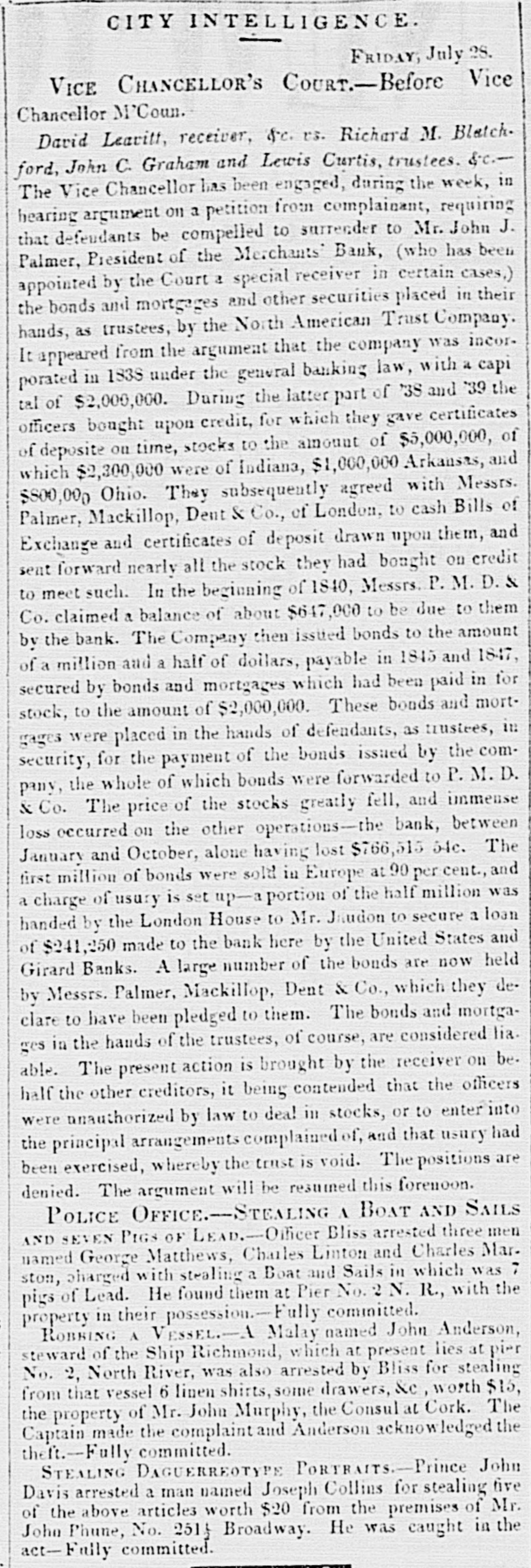 CITY INTELLIGENCE FRIDAY, July 28. VICE CHANCELLOR'S COURT.-Before Vice Chancellor M'Coun. David Leavitt, receiver, &c. US. Richard M. Bletch. ford, John C. Graham and Lewis Curtis, trustees. Sc. The Vice Chancellor has been engaged, during the week, in hearing argument on a petition from complainant, requiring that defendants be compelled to surrender to Mr. John J. Palmer, President of the Merchants' Bank, (who has been appointed by the Court a special receiver in certain cases,) and and other as the North American the hands, bonds trustees, mortgages by securities Trust placed Company. in their It appeared from the argument that the company was incorporated in 183S under the general banking law, with a capi tal of $2,000,000. During the latter part of 38 and '39 the officers bought upon credit, for which they gave certificates of deposite ou time, stocks to the amount of $5,000,000, of which $2,300,000 were of Indiana, $1,000,000 Arkansas, and $500,000 Ohio. They subsequently agreed with Messrs. Palmer, Mackillop, Dent & Co., of London, to cash Bills of Exchange and certificates of deposit drawn upon them, and sent forward nearly all the stock they had bought on credit to meet such. In the beginning of 1840, Messrs. P. M. D. & Co. claimed a balance of about $647,000 to be due to them by the bank. The Company then issued bonds to the amount of a million and a half of dollars, payable in 1815 and 1847, secured by bonds and mortgages which had been paid in for stock, to the amount of $2,000,000. These bonds and mortgages were placed in the hands of defendants, as trustees, in security, for the payment of the bonds issaed by the company, the whole of which bonds were forwarded to P. M. D. & Co. The price of the stocks greatly fell, and immense loss occurred on the other operations-the bank, between January and October, alone having lost $766,515 54c. The first million of bonds were sold in Europe at 90 per cent., and a charge of usury is set up-aportion of the half million was handed by the London House to Mr. Jaudon to secure a loan of $241,250 made to the bank here by the United States and Girard Banks. A large number of the bonds are now held by Messrs. Palmer, Mackillop, Dent & Co., which they declare to have been pledged to them. The bonds and mortgages in the hands of the trustees, of course, are considered lia. able. The present action is brought by the receiver on be. half the other creditors, it being contended that the officers were unauthorized by law to dea! in stocks, or to enter into the principal arrangements complained of, and that usury had been exercised, whereby the trust is void. The positions are denied. The argument will be resumed this forenoon. POLICE OFFICE.-STEALING A BOAT AND SAILS AND SEVEN PIGS OF LEAD.-Officer Bliss arrested three men named George Matthews, Charles Linton and Charles Mar. ston, charged with stealing a Boat and Sails in which was 7 pigs of Lead. He found them at Pier No. 2 N. R., with the property in their possession.-Fully committed. ROBBING A VESSEL-A Malay named John Anderson, steward of the Ship Richmond, which at present lies at pier No. 2, North River, was also arrested by Bliss for stealing from that vessel 6 linen shirts, some drawers, &c, worth $15, the property of Mr. John Murphy, the Consul at Cork. The Captain made the complaint and Anderson acknowledged the theft.-Fully committed. STEALING DAGUERREOTYPE PORTRAITS.-Prince John Davis arrested a man named Joseph Collins for stealing five of the above articles worth $20 from the premises of Mr. John Phune, No. 251 Broadway. He was caught in the act-Faily committed.
