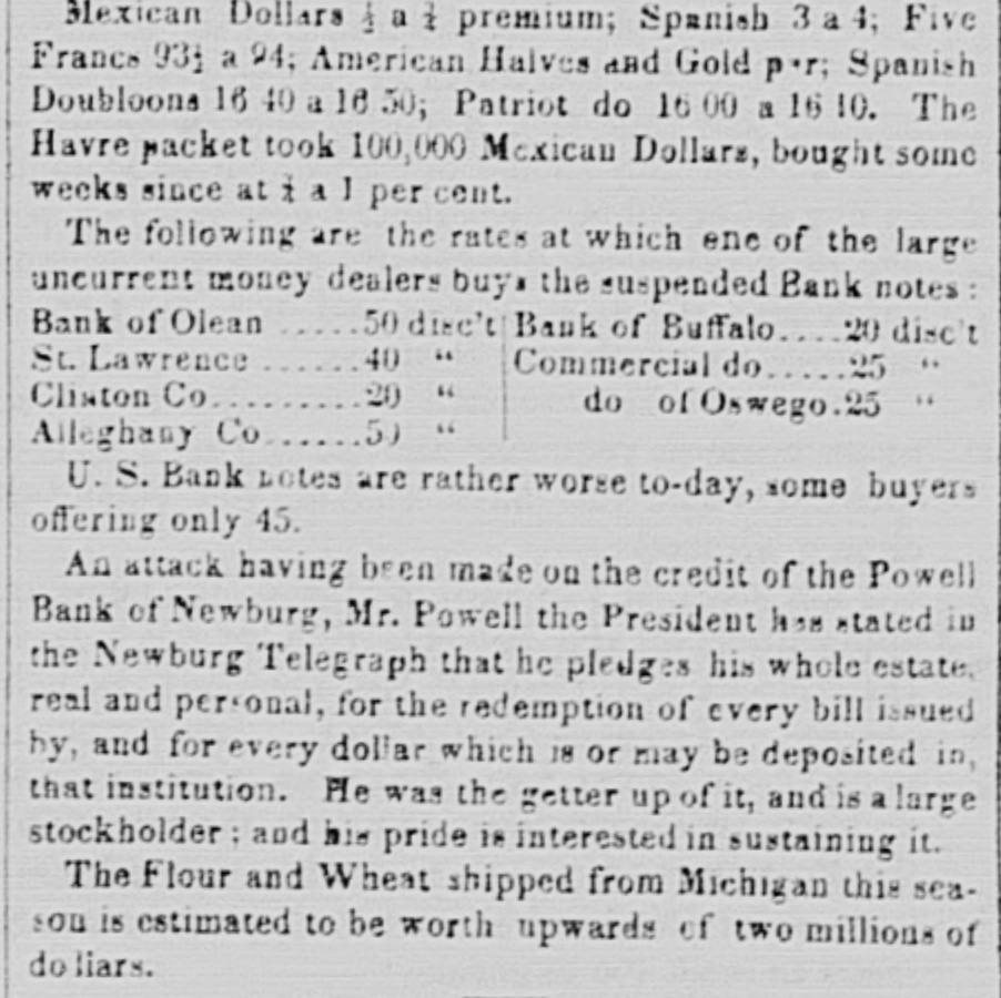 Mexican Dollars a & premium; Spanish 3 a 4; Five France 931 a 24, American Halves and Gold p r Spanish Doubloons 16 40 a 10 50; Patriot do 16.00 a 16 10. The Havre packet took 100,000 Mexican Dollars, bought some weeks since at it a I per cent. The following are the rates at which one of the large uncurrent money dealers buy: the suspended Bank notes: Bank of Olean 50 disc't Bank of Buffalo 20 discit .. 40 St. Lawrence Commercial do 20 " Cliston Co do of Oswego 25 50 " Alleghany Co U. S. Bank notes are rather worse to-day, some buyers offering only 45. An attack having been made on the credit of the Powell Bank of Newburg, Mr. Powell the President has stated in the Newburg Telegraph that he pledges his whole estate, real and personal, for the redemption of every bill issued by, and for every dollar which 18 or may be deposited in, that institution. He was the getter up of it, and is a large stockholder: and his pride is interested in sustaining it. The Flour and Wheat shipped from Michigan this seasou 15 estimated to be worth upwards of two millions of dollars.