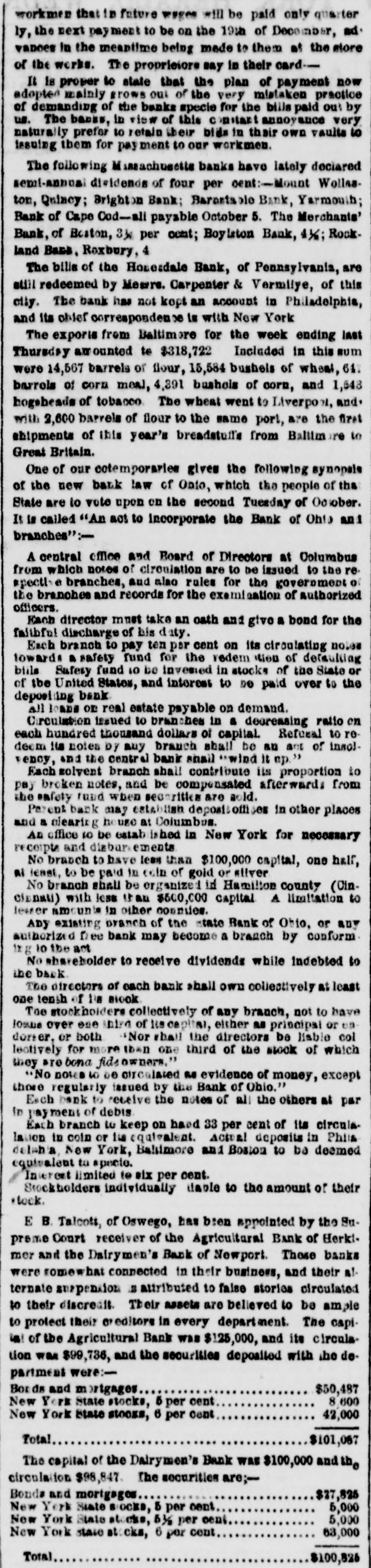 workmen that in future wages will be paid only quarter ly, the next payment to be on the 19th of December, advances in the meantime being made to them at the store of the works. The proprisiors say in their cardIt Is proper to state that the plan of payment now adopted mainly grows out of the very mistaken practice of demanding of the banks specie for the bills paid out by us. The barss, in view of this constant annoyance very naturally prefer to retain their bids in thair own vaults to issuing them for ment to our workmen. The following issachusetts banks have lately declared semi-annual dividends of four per oent:-Mount Wollaston, Quincy; Brighton Bank; Barastable Bank, Yarmouth; Bank of Cape Cod-ali payable October 5. The Merchants' Bank, of Boston, 3½ per cent; Boylston Bank, 1½; Rockland Bans. Roxbury, 4 The bills of the Honerdale Bank, of Pennsylvania, are still redeemed by Mewrs. Carpenter & Vermilye, of this city. The bank has not kept an account in Philadelphia, and its objef correspondence is with New York The exports from Baltimore for the week ending last Thursday amounted te $318,722 Included in this sum were 14,567 barrels of flour, 15,584 bushels of wheat, 64. barrels of corn meal, 4,391 bushels of corn, and 1,543 hogeheads of tobacco. The wheat went to Liverpool, and. with 2,600 barrels of flour to the same port, are the first shipments of this year's breadstuils from Baltim to Great Britain. One of our cotemporaries gives the following synopsis of the new bank law of Onio, which the people of the State are to vote upon on the second Tuesday of October. It is called "An act to incorporate the Bank of Ohio and branches":A central office and Board of Directors at Columbus from which notes of circulation are to be issued to the re. spective branches, and also rules for the government of the branches and records for the exemination of authorized officers. Each director must take an oath and give a bond for the faitbful discharge of his daty. Each branch to pay ten par cent on its circulating no.es towards a safety fund for the redem tion of detaulting bils Safety fund 10 be invemed in stocks of the State or of the United States, and interest to DO paid over to the depositing bank all loans OR real estate payable on demand. Circulation issued to branches in a decreasing ratio on each hundred thousand dollars of capital. Refusal to redeem its notes by any branch shall be an ant of insolvency, and the central bank shall "wind it np." Each solvent branch shall contribute its proportion to pay broken notes, and be compensated afterwards from the safety fund when securities are sold. Parent bank may establish depositoffices in other places and a clearing house at Columbus. An office 10 be estab ished in New York for necessary receipts and disbursements No branch to have less than $100,000 capital, one half, at least, to be paid In coin of gold or silver No branch shall be organized in Hamilton county (CinCinnati) with less an $500,000 capital A limitation to lewser amounts in other connies. ADY existing branch of the state Bank of Ohio, or any authorized free bank may become a branch by conform ing 10 the act No wharebolder to receive dividends while indebted to the bank The directors or each bank shall own collectively at least one tenth of is stock Toe stockholders collectively of any branch, not to have lossue over one third of Receptial, either as principal or ondorser, or both "Nor shall the directors be liable col lectively for more than one third of the stock of which they are bona fidsowners." "No notes to 00 circulated as evidence of money, except those regularly issued by the Bank of Ohio." Each bank to receive the notes of all the others at par in payment of debis Each branch to keep on hand 33 per cent of its circulalation in coin or its equivalent. Actual deposits in Phis deleha, New York, Bahimore and Boston to be deemed equivalent to specie. Interest limited to six per cent. Stockholders individually dable to the amount of their *tock. E B. Talcott, of Oswego, has been appointed by the Supreme Court receiver of the Agricultural Bank of Herkimer and the Dairymen's Bank of Newport. These banks were somewhat connected in their business, and their alternate surpension # attributed to false stories circulated to their discredit. Their assets are believed to be ample to protect their creditors in every department. The capiis! of the Agricultural Bank was $125,000, and its circulation was $99,736, and the securities deposited with the department were:Bor and ortgages $50,487 8,600 New York State stocks, 5 per cent 42,000 New York State stocks, 6 per cent Total $101,067 The capital of the Dairymen's Bank was $100,000 and circulation $98,847. The securities are;Bonds and mortgages $27,825 New York State BIOCKS, 5 per cent 5,000 New York State stocks, 6½ per cent 5,000 New York state stocks, 6 per cent 63,000 Total $100,826