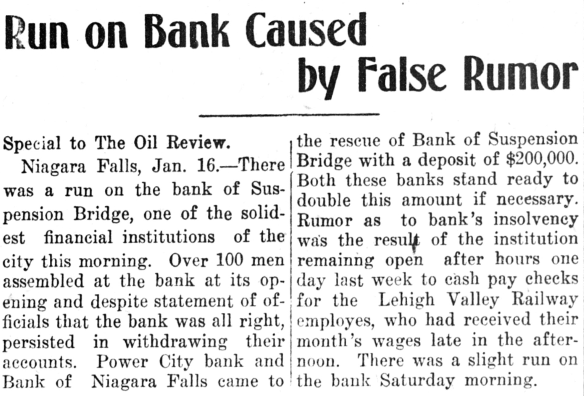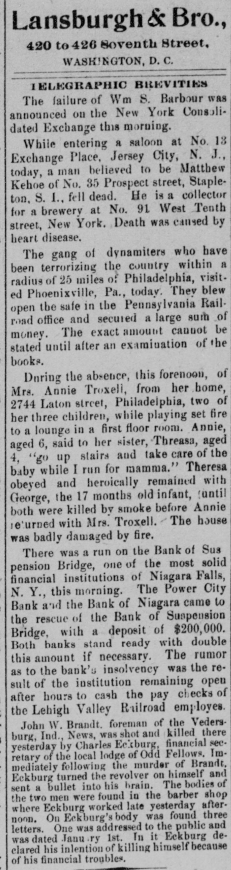 Lansburgh & Bro., 420 to 426 Soventh Street, WASHINGTON, D.C. IELEGRAPHIC BREVITIES The failure of Wm S. Barbour was announced on the New York Consolidated Exchange this morning. While entering a saloon at No. 13 Exchange Place, Jersey City, N. J., today, a man believed to be Matthew Kehoe of No. 35 Prospect street, Stapleton, S. 1., fell dead. He is a collector for a brewery at No. 91 West Tenth street, New York. Death was caused by heart disease. The gang of dynamiters who have been terrorizing the country within a radius of 25 miles of Philadelphia, visited Phoenixville, Pa., today. They blew open the safe in the Pennsylvania Railroad office and secured a large sum of money. The exact amount cannot be stated until after an examination of the books. During the absence, this forenoon, of Mrs. Annie Troxell, from her home, 2744 Laton street, Philadelphia, two of her three children, while playing set fire to a lounge in a first floor room. Annie, aged 6, said to her sister, Threasa, aged 4, "go up stairs and take care of the baby while I run for mamma." Theresa obeyed and heroically remained with George, the 17 months old infant, (until both were killed by smoke before Annie returned with Mrs. Troxell. The house was badly damaged by fire. There was a run on the Bank of Sus pension Bridge, one of the most solid financial institutions of Niagara Falls, N. Y., this morning. The Power City Bank and the Bank of Niagara came to the rescue of the Bank of Suspension Bridge, with a deposit of $200,000. Both banks stand ready with double this amount if necessary. The rumor as to the bank's insolvency was the result of the institution remaining open after hours to cash the pay checks of the Lehigh Valley Railroad employes. John W. Brandt. foreman of the Vedersburg, Ind., News, was shot and killed there yesterday by Charles Eckburg, financial secretary of the local lodge of Odd Fellows. Immediately following the murder of Brandt, Eckburg turned the revolver on himself and sent a bullet into his brain. The bodies of the two men were found in the barber shop where Eckburg worked late yesterday afternoon. On Eckburg's body was found three letters. One was addressed to the public and was dated Janu ry 1st. In it Eckburg declared his inlention of killing himself because of his financial troubles.