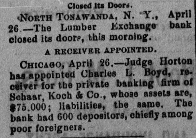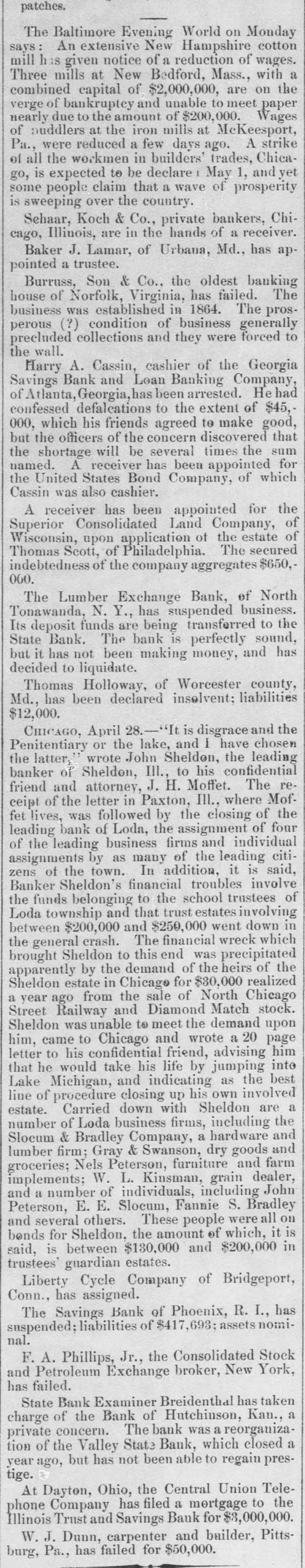nearly due to the amount of $200,000. Wages of ouddlers at the iron mills at McKeesport, Pa., were reduced a few days ago. A strike of all the workmen in builders' trades, Chicago, is expected to be declare 1 May 1, and yet some people claim that a wave of prosperity is sweeping over the country. Schaar, Koch & Co., private bankers, Chicago, Illinois, are in the hands of a receiver. Baker J. Lamar, of Urbana, Md., has appointed a trustee. Burruss, Son & Co., the oldest banking house of Norfolk, Virginia, has failed. The business was established in 1864. The prosperous (?) condition of business generally precluded collections and they were forced to the wall. Harry A. Cassin, cashier of the Georgia Savings Bank and Loan Banking Company, of Atlanta, Georgia, has been arrested. He had confessed defalcations to the extent of $45,000, which his friends agreed to make good, but the officers of the concern discovered that the shortage will be several times the sum named. A receiver has been appointed for the United States Bond Company, of which Cassin was also cashier. A receiver has been appointed for the Superior Consolidated Land Company, of Wisconsin, upon application of the estate of Thomas Scott, of Philadelphia. The secured indebtedness of the company aggregates $650,000. The Lumber Exchange Bank, of North Tonawanda, N. Y., has suspended business. Its deposit funds are being transferred to the State Bank. The bank is perfectly sound, but it has not been making money, and has decided to liquidate. Thomas Holloway, of Worcester county, Md., has been declared insolvent; liabilities $12,000. Chicago, April 28.-"It is disgrace and the Penitentiary or the lake, and I have chosen the latter,' wrote John Sheldon, the leading banker of Sheldon, III., to his confidential friend and attorney, J. H. Moffet. The receipt of the letter in Paxton, III., where Moffet lives, was followed by the closing of the leading bank of Loda, the assignment of four of the leading business firms and individual assignments by as many of the leading citizens of the town. In addition, it is said, Banker Sheldon's financial troubles involve the funds belonging to the school trustees of Loda township and that trust estates involving between $200,000 and $250,000 went down in the general erash. The financial wreck which brought Sheldon to this end was precipitated apparently by the demand of the heirs of the Sheldon estate in Chicago for $30,000 realized a year ago from the sale of North Chicago Street Railway and Diamond Match stock. Sheldon was unable to meet the demand upon him, came to Chicago and wrote a 20 page letter to his confidential friend, advising him that he would take his life by jumping into Lake Michigan, and indicating as the best line of procedure closing up his own involved estate. Carried down with Sheldon are a number of Loda business firms, including the Slocum & Bradley Company, a hardware and lumber firm; Gray & Swanson, dry goods and groceries; Nels Peterson, furniture and farm implements; W. L. Kinsman, grain dealer, and a number of individuals, including John Peterson, E. E. Slocum, Fannie S. Bradley and several others. These people were all on bonds for Sheldon. the amount of which, it is said, is between $130,000 and $200,000 in trustees' guardian estates. Liberty Cycle Company of Bridgeport, Conn., has assigned. The Savings Bank of Phoenix, R. I., has suspended; liabilities of $417,693; assets nominal. F. A. Phillips, Jr., the Consolidated Stock