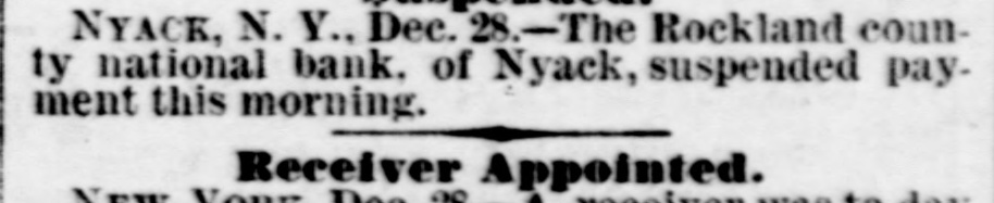NYACK, N. Y., Dec. 28.-The Rockland county national bank. of Nyack, suspended payment this morning. Receiver Appointed. New Vonr Doe n to der