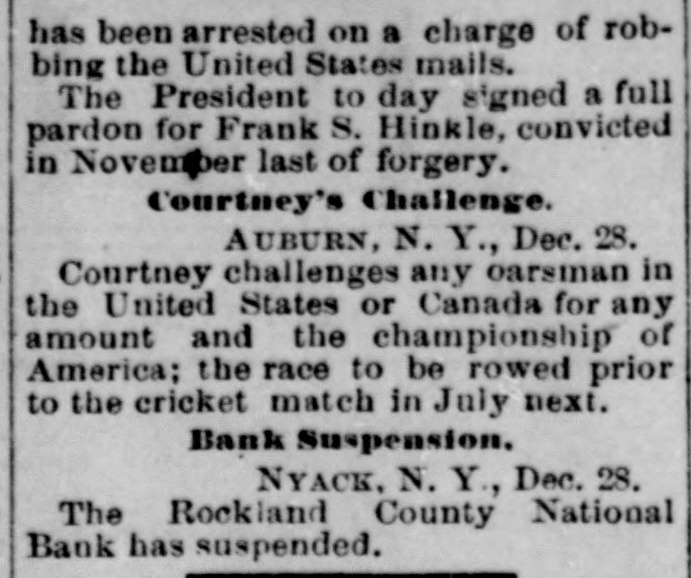 has been arrested on a charge of robbing the United States mails. The President to day signed a full pardon for Frank S. Hinkle, convicted in November last of forgery. Courtney's Challenge. AUBURN, N. Y., Dec. 28. Courtney challenges any oarsman in the United States or Canada for any amount and the championship of America; the race to be rowed prior to the cricket match in July next. Bank Suspension. NYACK, N. Y., Dec. 28. The Rockland County National Bank has suspended.