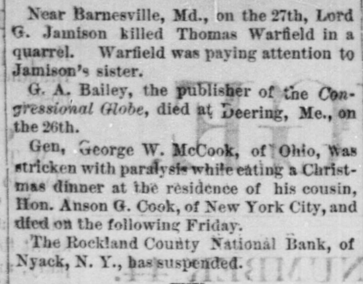 Near Barnesville, Md., on the 27th, Lord G. Jamison killed Thomas Warfield in a quarrel. Warfield was paying attention to Jamison's sister. G. A. Bailey, the publisher of the Congressional Globe, died at Deering, Me., on the 26th. Gen, George W. McCook, of Ohio, was stricken with paralysis while eating a Christ-mas dinner at the residence of his cousin, Hon. Anson G. Cook, of New York City, and died on the following Friday. The Rockland County National Bank, of Nyack, N. Y., has suspended.