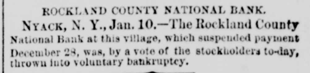 ROCKLAND COUNTY NATIONAL BANK. NYACK, N. Y., Jan. 10.-The Rockland County National Bank at this village, which suspended payment December 28, was, by a vote of the stockholders to-day, thrown into voluntary bankruptcy.