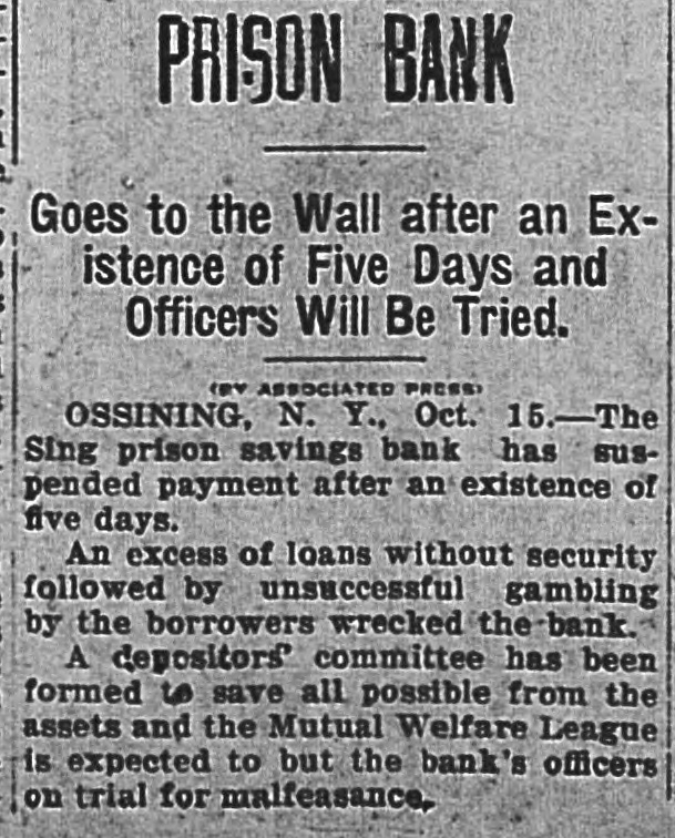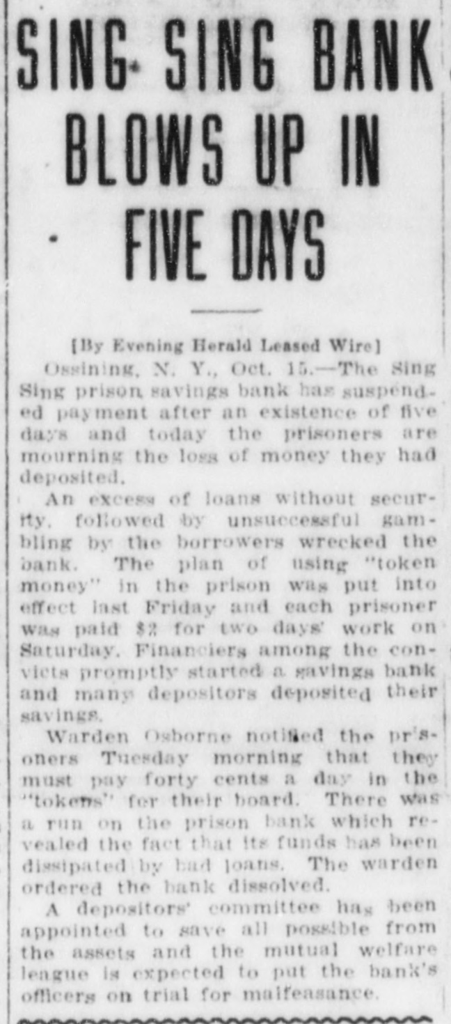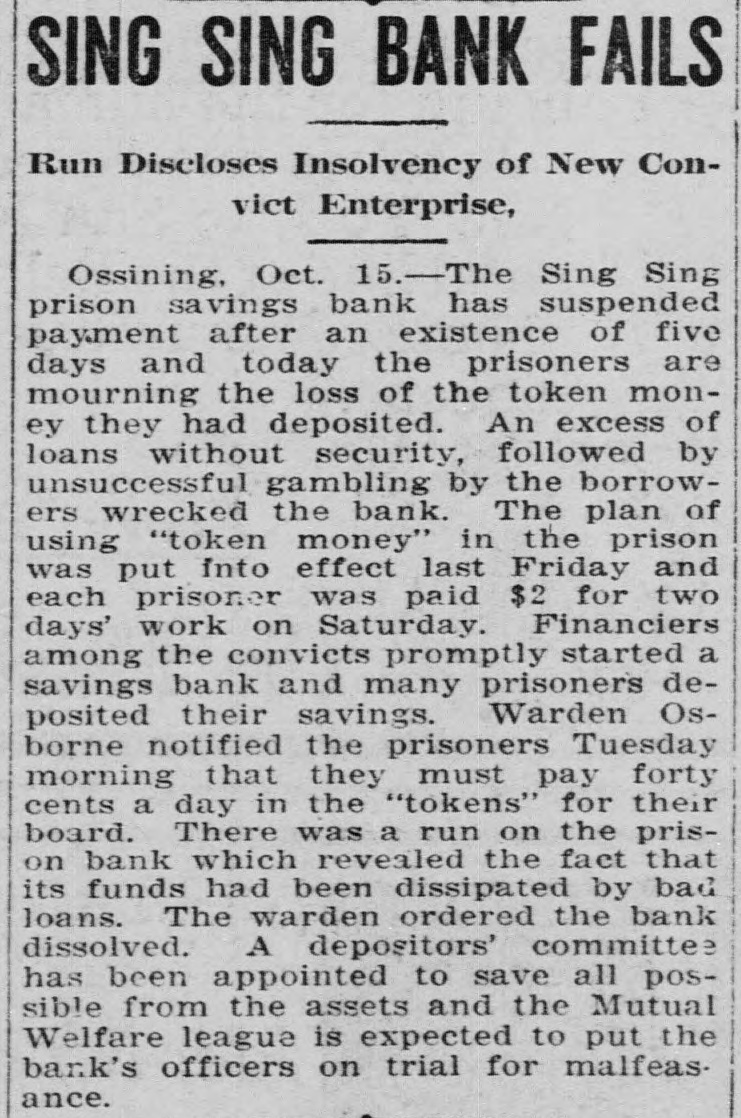 SING SING BANK FAILS Run Discloses Insolvency of New Convict Enterprise, Ossining, Oct. 15.-The Sing Sing prison savings bank has suspended payment after an existence of five days and today the prisoners are mourning the loss of the token money they had deposited. An excess of loans without security, followed by unsuccessful gambling by the borrowers wrecked the bank. The plan of using "token money" in the prison was put into effect last Friday and each prisoner was paid $2 for two days' work on Saturday. Financiers among the convicts promptly started a savings bank and many prisoners deposited their savings. Warden Osborne notified the prisoners Tuesday morning that they must pay forty cents a day in the "tokens" for their board. There was a run on the prison bank which revealed the fact that its funds had been dissipated by bad loans. The warden ordered the bank dissolved. A depositors' committee has been appointed to save all possible from the assets and the Mutual Welfare league is expected to put the bank's officers on trial for malfeasance.