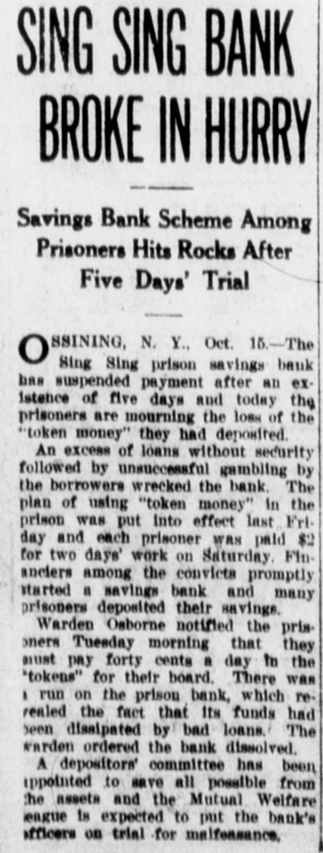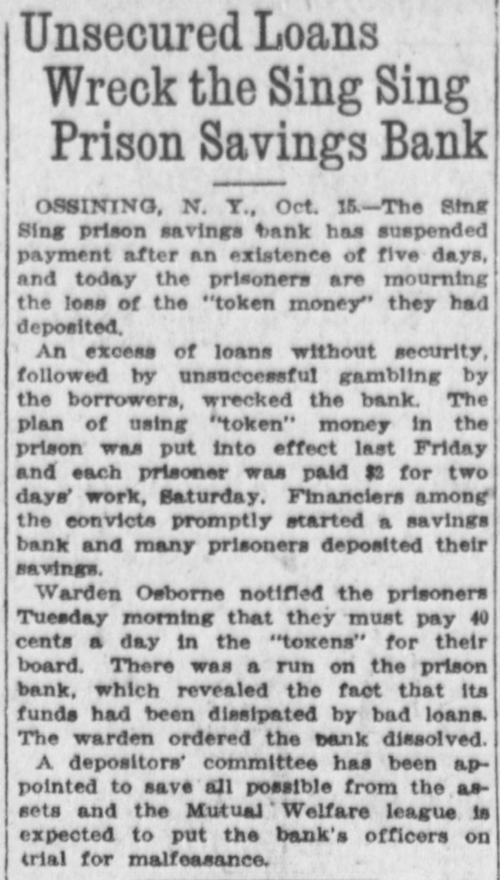 Unsecured Loans Wreck the Sing Sing Prison Savings Bank OSSINING, N. Y., Oct. 15.-The Sing Sing prison savings bank has suspended payment after an existence of five days, and today the prisoners are mourning the loss of the "token money" they had deposited. An excess of loans without security, followed by unsuccessful gambling by the borrowers, wrecked the bank. The plan of using "token" money in the prison was put into effect last Friday and each prisoner was paid $2 for two days' work, Saturday. Financiers among the convicts promptly started a savings bank and many prisoners deposited their savings. Warden Osborne notified the prisoners Tuesday morning that they must pay 40 cents a day in the "tokens" for their board. There was a run on the prison bank, which revealed the fact that its funds had been dissipated by bad loans. The warden ordered the bank dissolved. A depositors' committee has been appointed to save all possible from the assets and the Mutual Welfare league is expected to put the bank's officers on trial for malfeasance.