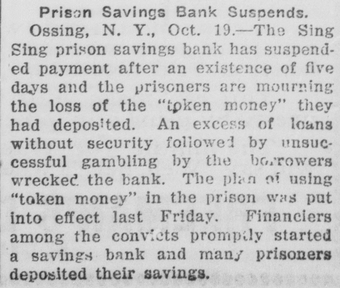 Prison Savings Bank Suspends. Ossing, N. Y., Oct. 19.-The Sing Sing prison savings bank has suspended payment after an existence of five days and the prisoners are mourning the loss of the "token money" they had deposited. An excess of loans without security followed by unsuccessful gambling by the borrowers wrecked the bank. The plan of using "token money" in the prison Was put into effect last Friday. Financiers among the convicts promptly started a savings bank and many prisoners deposited their savings.