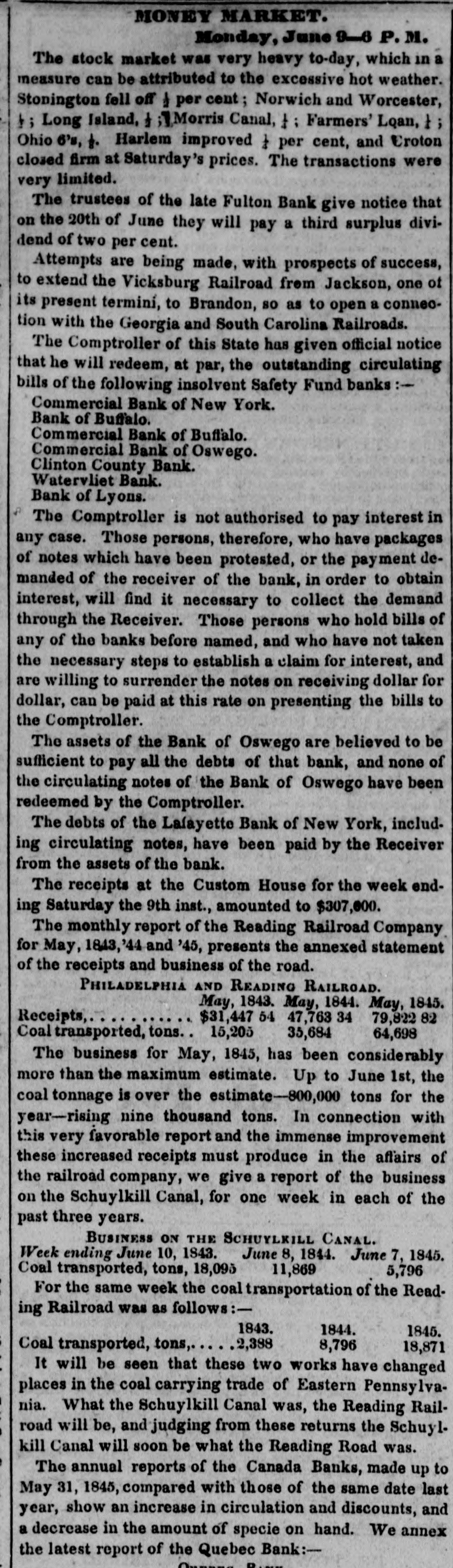 MONEY MARKET. Monday, June 9-6 P.M. The stock market was very heavy to-day, which in a measure can be attributed to the excessive hot weather. Stonington fell off 1 per cent; Norwich and Worcester, 1; Long Island, I Morris Canal, 1; Farmers' Lqan, Ohio 6's, 1. Harlem improved 1 per cent, and Eroton closed firm at Saturday's prices. The transactions were very limited. The trustees of the late Fulton Bank give notice that on the 20th of June they will pay a third surplus dividend of two per cent. Attempts are being made, with prospects of success, to extend the Vicksburg Railroad from Jackson, one of its present termini, to Brandon, so as to open a conneotion with the Georgia and South Carolina Railroads. The Comptroller of this State has given official notice that he will redeem, at par, the outstanding circulating bills of the following insolvent Safety Fund banks:Commercial Bank of New York. Bank of Buffalo. Commercial Bank of Buffalo. Commercial Bank of Oswego. Clinton County Bank. Watervliet Bank. Bank of Lyons. The Comptroller is not authorised to pay interest in any case. Those persons, therefore, who have packages of notes which have been protested, or the payment demanded of the receiver of the bank, in order to obtain interest, will find it necessary to collect the demand through the Receiver. Those persons who hold bills of any of the banks before named, and who have not taken the necessary steps to establish a claim for interest, and are willing to surrender the notes on receiving dollar for dollar, can be paid at this rate on presenting the bills to the Comptroller. The assets of the Bank of Oswego are believed to be sufficient to pay all the debts of that bank, and none of the circulating notes of the Bank of Oswego have been redeemed by the Comptroller. The debts of the Lafayette Bank of New York, includ. ing circulating notes, have been paid by the Receiver from the assets of the bank. The receipts at the Custom House for the week ending Saturday the 9th inst., amounted to $307,000. The monthly report of the Reading Railroad Company for May, 1843,44 and '45, presents the annexed statement of the receipts and business of the road. PHILADELPHIA AND READING RAILROAD. May, 1843. May, 1844. May, 1845. Receipts $31,447 47,763 34 79,822 82 15,205 Coal transported, tons. 35,684 64,698 The business for May, 1845, has been considerably more than the maximum estimate. Up to June 1st, the coal tonnage is over the estimate-800,000 tons for the year-rising nine thousand tons. In connection with this very favorable report and the immense improvement these increased receipts must produce in the affairs of the railroad company, we give a report of the business on the Schuylkill Canal, for one week in each of the past three years. BUSINESS ON THE SCHUYLKILL CANAL. Week ending June 10, 1843. June 8, 1844. June 7, 1845. Coal transported, tons, 18,095 11,869 5,796 For the same week the coal transportation of the Reading Railroad was as follows:1843. 1844. 1845. 2,388 Coal transported, tons, 8,796 18,871 It will be seen that these two works have changed places in the coal carrying trade of Eastern Pennsylvania. What the Schuylkill Canal was, the Reading Railroad will be, and judging from these returns the Schuyl. kill Canal will soon be what the Reading Road was. The annual reports of the Canada Banks, made up to May 31, 1845, compared with those of the same date last year, show an increase in circulation and discounts, and a decrease in the amount of specie on hand. We annex the latest report of the Quebec Bank:-
