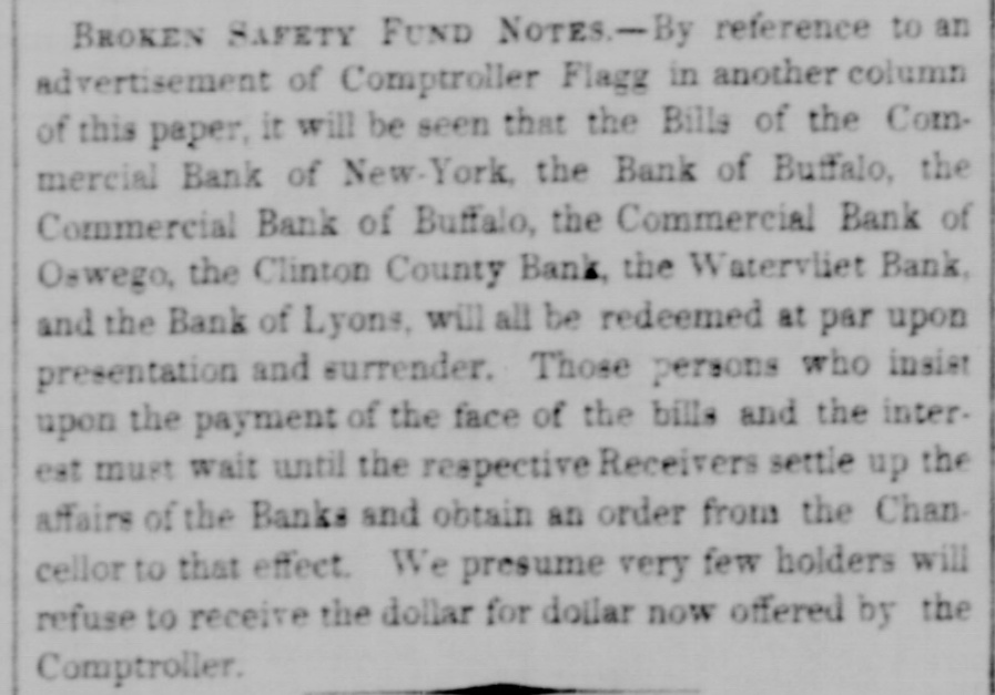 BROKEN SAFETY FUND NOTES. - By reference to an advertisement of Comptroller Flagg in another column of this paper, it will be seen that the Bills of the Commercial Bank of New-York, the Bank of Buffalo, the Commercial Bank of Buffalo, the Commercial Bank of Oswego, the Clinton County Bank the Watervliet Bank, and the Bank of Lyons, will all be redeemed at par upon presentation and surrender. Those persons who insist upon the payment of the face of the bills and the inter. est must wait until the respective Receivers settle up the affairs of the Banks and obtain an order from the Chan cellor to that effect. We presume very few holders will refuse to receive the dollar for dollar now offered by the Comptroller.