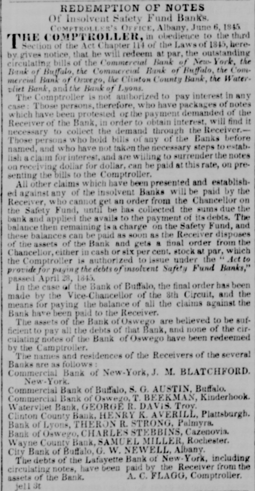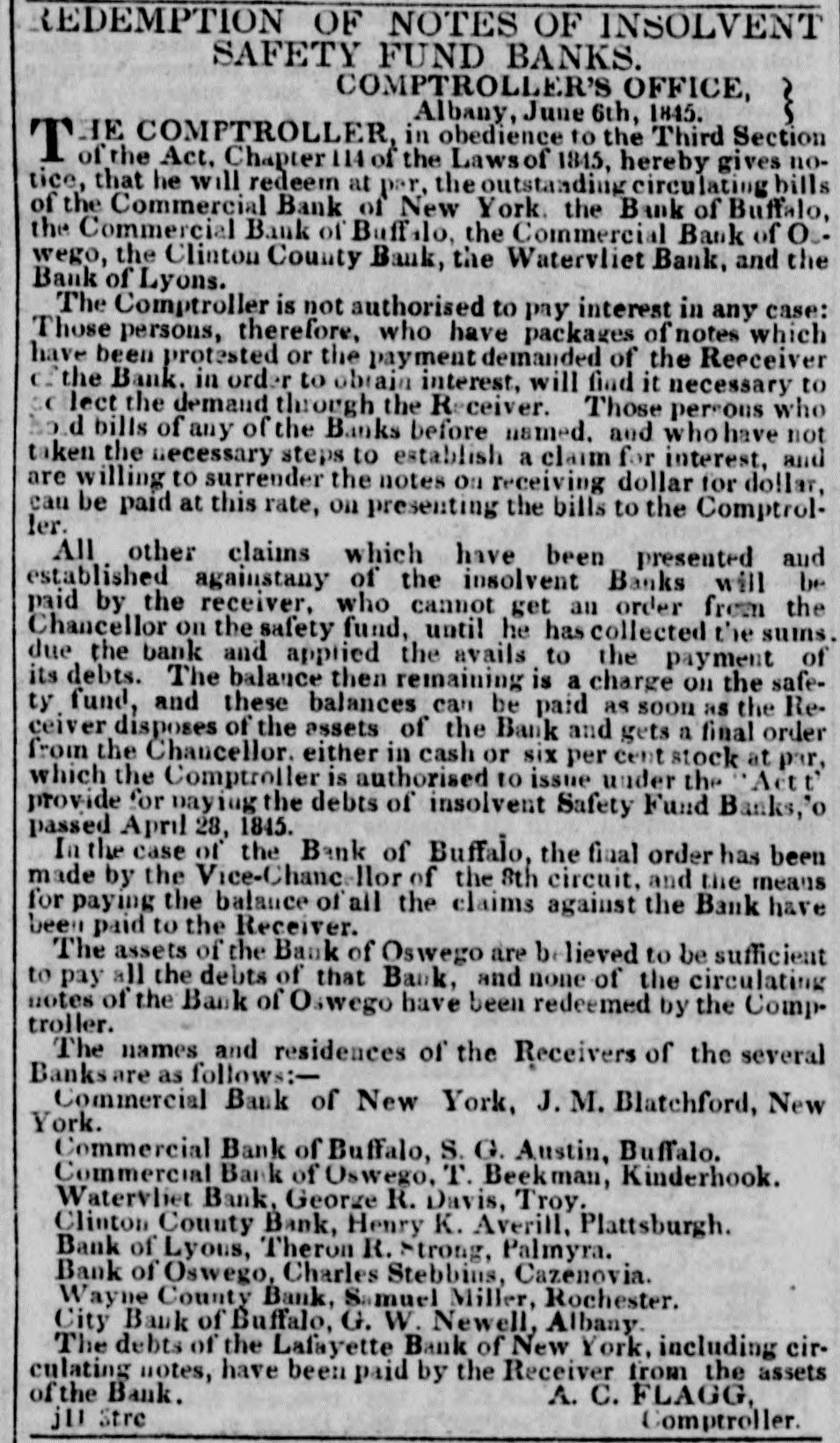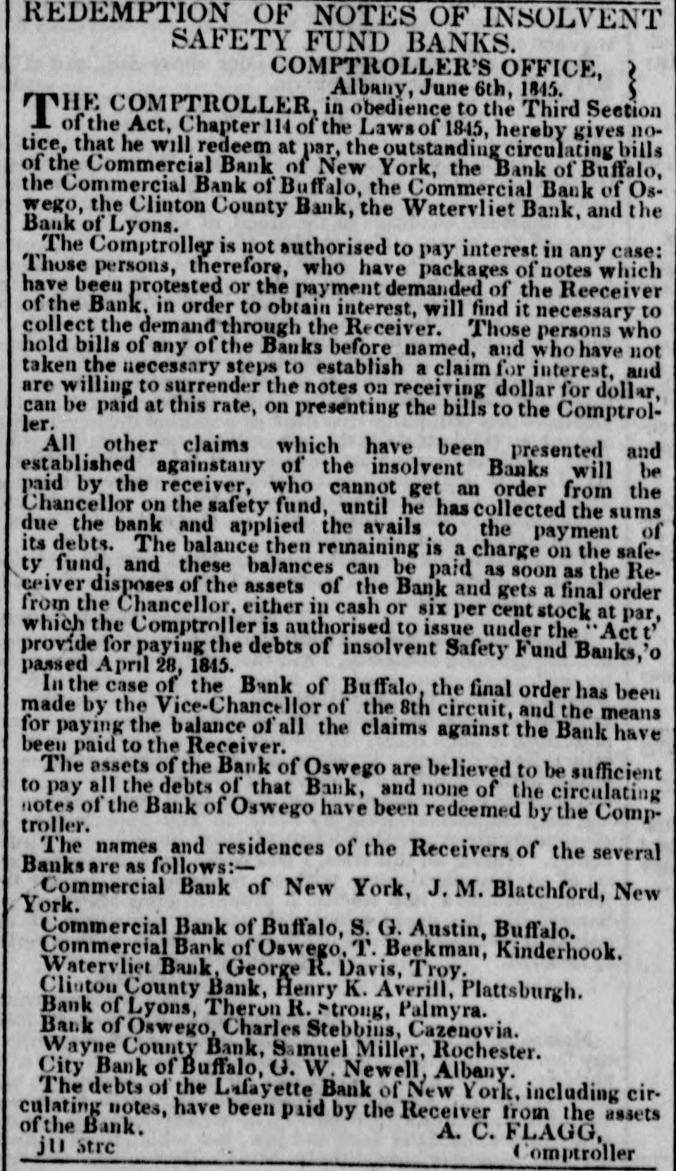 REDEMPTION OF NOTES OF INSOLVENT SAFETY FUND BANKS. COMPTROLLER'S OFFICE, Albany, June 6th, 1845. COMPTROLLER, in obedience to the Third Section THE of the Act, Chapter 114 of the Laws of 1845, hereby gives notice, that he will redeem at par, the outstanding circulating bills of the Commercial Bank of New York, the Bank of Buffalo, the Commercial Bank of Buffalo, the Commercial Bank of Oswego, the Clinton County Bank, the Watervliet Bank, and the Bank of Lyons. The Comptroller is not authorised to pay interest in any case: Those persons, therefore, who have packages of notes which have been protested or the payment demanded of the Reeceiver of the Bank. in order to obtain interest, will find it necessary to collect the demand through the Receiver. Those persons who hold bills of any of the Banks before named, and who have not taken the necessary steps to establish a claim for interest, and are willing to surrender the notes on receiving dollar for dollar, can be paid at this rate, on presenting the bills to the Comptroller. All other claims which have been presented and established againstany of the insolvent Banks will be paid by the receiver, who cannot get an order from the Chancellor on the safety fund, until he has collected the sums due the bank and applied the avails to the payment of its debts. The balance then remaining is a charge on the safety fund, and these balances can be paid as soon as the Receiver disposes of the assets of the Bank and gets a final order from the Chancellor. either in cash or six per cent stock at par, which the Comptroller is authorised to issue under the 'Act t' provide for paying the debts of insolvent Safety Fund Banks,'o passed April 28, 1845. In the case of the Bank of Buffalo, the final order has been made by the Vice-Chancellor of the 8th circuit, and the means for paying the balance of all the claims against the Bank have been paid to the Receiver. The assets of the Bank of Oswego are believed to be sufficient to pay all the debts of that Bank, and none of the circulating notes of the Bank of Oswego have been redeemed by the Comptroller. The names and residences of the Receivers of the several Banks are as follows:Commercial Bank of New York, J. M. Blatchford, New York. Commercial Bank of Buffalo, S. G. Austin, Buffalo. Commercial Bank of Oswego, T. Beekman, Kinderhook. Watervliet Bank, George R. Davis, Troy. Clipton County Bank, Henry K. Averill, Plattsburgh. Bank of Lyons, Theron R. >trong, Palmyra. Bank of Oswego, Charles Stebbins, Cazenovia. Wayne County Bank, Samuel Miller, Rochester. City Bank of Buffalo, G. W. Newell, Albany. The debts of the Lafayette Bank of New York, including circulating notes, have been paid by the Receiver from the assets of the Bank. A. C. FLAGG, jll Stre Comptroller