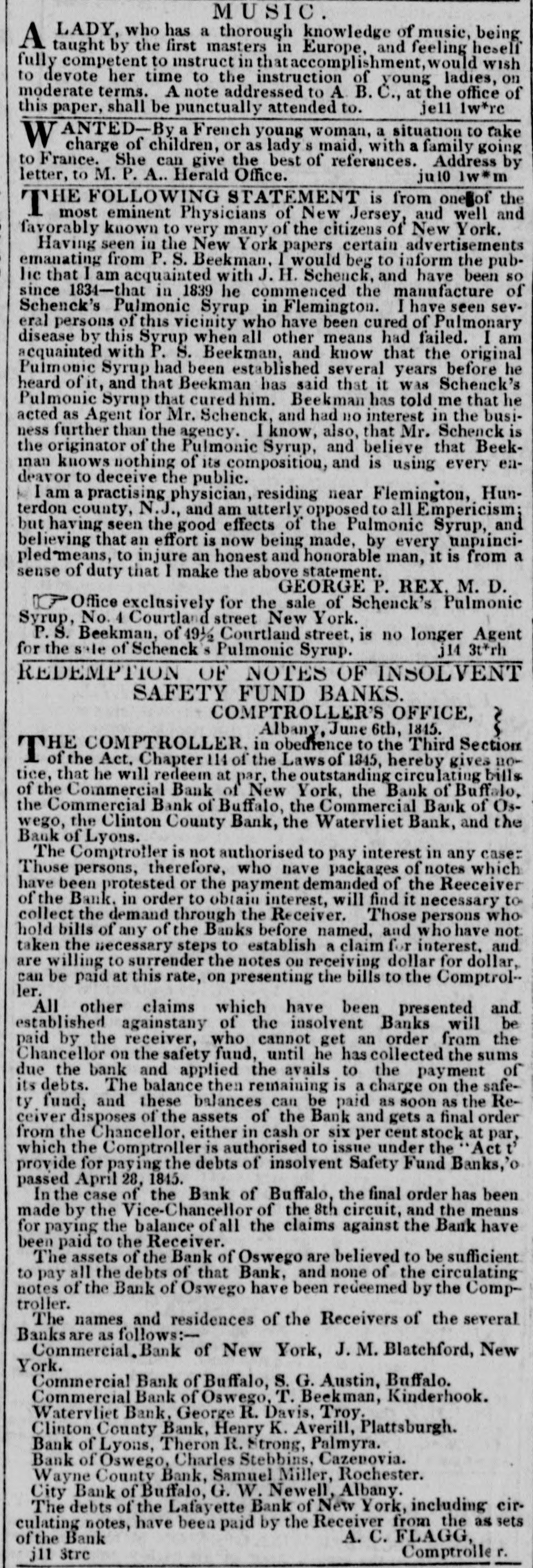 MUSIC. LADY, who has a thorough knowledge of music, being A taught by the first masters in Europe, and feeling heself fully competent to instruct in thataccomplishment, would wish to devote her time to the instruction of young ladies, on moderate terms. A note addressed to A B. C., at the office of jell 1w*re this paper, shall be punctually attended to. ANTED-By a French young woman, a situation to take W charge of children, or as lady S maid, with a family going to France. She can give the best of references. Address by letter, to M. P. A.. Herald Office. ju10 lw*m FOLLOWING STATEMENT is from one lof the THE most eminent Physicians of New Jersey, and well and favorably known to very many of the citizens of New York. Having seen in the New York papers certain advertisements emanating from P. S. Beekman, I would beg to inform the public that I am acquainted with J. H. Scheuck, and have been so since 1834-that in 1839 he commenced the manufacture of Schenck's Pulmonic Syrup in Flemington. I have seen several persons of this vicinity who have been cured of Pulmonary disease by this Syrup when all other means had failed. I am acquainted with P. S. Beekman, and know that the original Pulmonic Syrup had been established several years before he heard of it, and that Beekman has said that it was Schenck's Pulmonic Syrup that cured him. Beekman has told me that he acted as Agent for Mr. Schenck, and had no interest in the business further than the agency. I know, also, that Mr. Schenck is the originator of the Pulmonic Syrup, and believe that Beekinan knows nothing of its composition, and is using every eadeavor to deceive the public. I am a practising physician, residing near Flemington, Hunterdon county, N.J., and am utterly opposed to all Empericism; but having seen the good effects of the Pulmonic Syrup, and believing that an effort is now being made, by every unpiincipled means, to injure an honest and honorable man, it is from a sense of duty that I make the above statement. GEORGE P. REX. M. D. Office exclusively for the sale of Schenck's Pulmonic Syrup, No. 4 Courtla d street New York. P.S. Beekman, of 491/2 Courtland street, is no longer Agent j14 3t*rh for the sale of Schenck Pulmonic Syrup. REDEMPTION OF NOTES OF INSOLVENT SAFETY FUND BANKS. COMPTROLLER'S OFFICE, Albany, June 6th, 1845. THE COMPTROLLER. in obedience to the Third Section of the Act. Chapter 114 of the Laws of 1345, hereby gives notice, that he will redeem at par, the outstanding circulating bills of the Commercial Bank of New York, the Bank of Buffalo, the Commercial Bank of Buffalo, the Commercial Bank of Oswego, the Clinton County Bank, the Watervliet Bank, and the Bauk of Lyons. The Comptroller is not authorised to pay interest in any case: Those persons, therefore, who have packages of notes which have been protested or the payment demanded of the Reeceiver of the Bank. in order to obtain interest, will find it necessary to collect the demand through the Receiver. Those persons who hold bills of any of the Banks before named. and who have not taken the necessary steps to establish a claim for interest. and are willing to surrender the notes on receiving dollar for dollar, can be paid at this rate, on presenting the bills to the Comptroller. All other claims which have been presented and established againstany of the insolvent Banks will be paid by the receiver, who cannot get an order from the Chancellor on the safety fund, until he has collected the sums due the bank and applied the avails to the payment of its debts. The balance then remaining is a charge on the safety fund, and these balances can be paid as soon as the Receiver disposes of the assets of the Bank and gets a final order from the Chancellor. either in cash or six per cent stock at par, which the Comptroller is authorised to issue under the Act t provide for paying the debts of insolvent Safety Fund Banks,'o passed April 28, 1845. In the case of the Bank of Buffalo, the final order has been made by the Vice-Chancellor of the 8th circuit, and the means for paying the balance of all the claims against the Bank have been paid to the Receiver. The assets of the Bank of Oswego are believed to be sufficient to pay all the debts of that Bank, and none of the circulating notes of the Bank of Oswego have been redeemed by the Comptroller. The names and residences of the Receivers of the several Banks: are as follows:Commercial. Bank of New York, J. M. Blatchford, New York. Commercial Bank of Buffalo, S. G. Austin, Buffalo. Commercial Bank of Oswego, T. Beekman, Kinderhook. Watervliet Bank, George R. Davis, Troy, Clinton County Bank, Henry K. Averill, Plattsburgh. Bank of Lyons, Theron R. Strong, Palmyra. Bank of Oswego, Charles Stebbins, Cazepovia. Wayne County Bank, Samuel Miller, Rochester. City Bank of Buffalo, G. W. Newell, Albany. The debts of the Lafayette Bank of New York, including circulating notes, have been paid by the Receiver from the as sets A. C. FLAGG, of the Bank Comptrolle j11 Stre