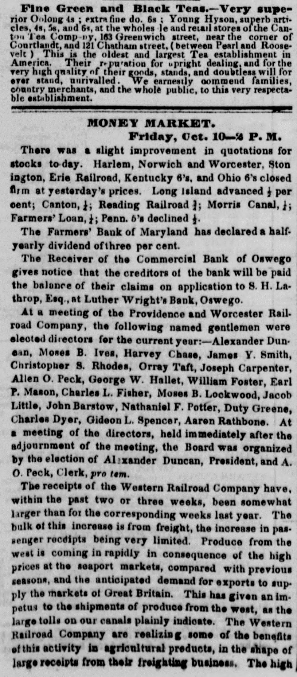 Fine Green and Black Teas.-Very superior Oolong 4s : extra fine do. 6s : Young Hyson, superb articles, 4s, 5s, and 6s, at the wholes le and retail stores of the Cantoo Tea Comp-ny, 163 Greenwich street, near the corner of Courtlandt, and 121 Chatham street, (between Pearl and Roosevelt ) This is the oldest and largest Tea establishment in America. Their repuration for upright dealing, and for the very high quality of their goods, stands, and doubtless will for ever stand, unrivalled. We earnestly commend families, country merchants, and the whole public, to this very respectable establishment. MONEY MARKET. Friday, Oct. 10m's P. M. There was a slight improvement in quotations for stocks today. Harlem, Norwich and Worcester, Ston ington, Erie Railroad, Kentucky 6's. and Ohio 6's closed firm at yesterday's prices. Long Island advanced 1 per cent; Canton, 1; Reading Railroad 1; Morris Canal, 1; Farmers' Loan, t; Penn. 5's declined 1. The Farmers' Bank of Maryland has declared a halfyearly dividend ofthree per cent. The Receiver of the Commercial Bank of Oswego gives notice that the creditors of the bank will be paid the balance of their claims on application to S. H. Lathrop, Esq., at Luther Wright's Bank, Oswego. At a meeting of the Providence and Worcester Railroad Company, the following named gentlemen were elected directors for the current year:-Alexander Duncan, Moses B. Ives, Harvey Chase, James Y. Smith, Christopher S. Rhodes, Orray Taft, Joseph Carpenter, Allen O. Peck, George W. Hallet, William Foster, Earl P. Mason, Charles L. Fisher, Moses B. Lockwood, Jacob Little, John Barstow, Nathaniel F. Potter, Duty Greene, Charles Dyer, Gideon L. Spencer, Aaron Rathbone. At a meeting of the directors, held immediately after the adjournment of the meeting, the Board was organized by the election of Alexander Duncan, President, and A. O. Peck, Clerk, pro tem. The receipts of the Western Railroad Company have, within the past two or three weeks, been somewhat larger than for the corresponding weeks last year. The bulk of this increase is from freight, the increase in passenger receipts being very limited. Produce from the west is coming in rapidly in consequence of the high prices at the seaport markets, compared with previous seasons, and the anticipated demand for exports to supply the markets of Great Britain. This has given an impetus to the shipments of produce from the west, as the large tolls on our canals plainly indicate. The Western Railroad Company are realizin some of the benefits of this activity in agricultural products, in the shape of large receipts from their freighting business. The high