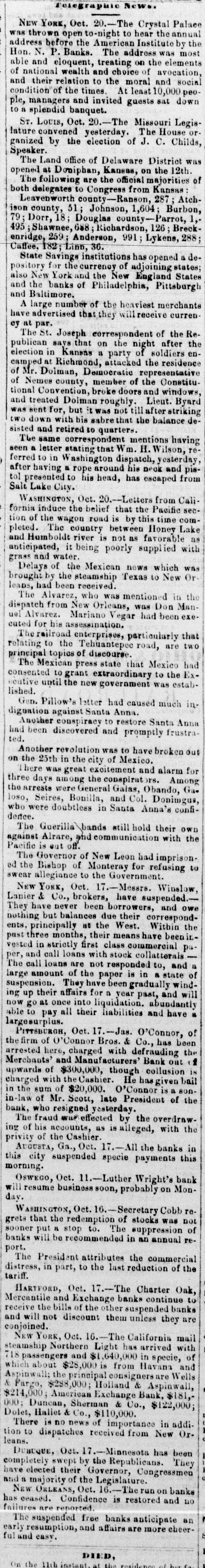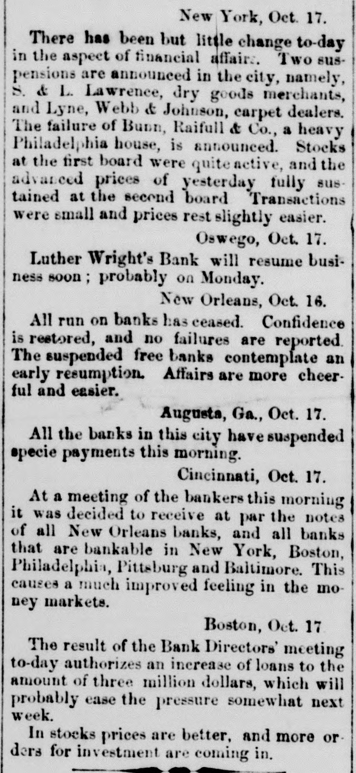 The Financial Crisis. New Orleans, Oct. 15. The Citizens and Louisiana Bank, of La., and the Canal Bank, all this morning refused to take the notes of the free tanks. The run commenced early on the free banks, and before 3 o'clock the Union, Merchants' and Bank of New Orleans, had suspended specie payments.There is no run upon the Southern Bank, and it is considered perfectly good. LATER. Affairs are very unsettled. It is supposed that the run will continue to-morrow, and great confidence is felt in the banks which are now standing. They have had large deposits to-day. There are rumors that the bank of New Orleans will open in the morning. Notes of the Bank of James Robb are taken at the citizens and Southern Banks. St. Louis, Oct. 16. The reported suspension of Doane, King & Co., and Collins, Kerley & Co., of this city, published in the New York Express of the 12th, is authoritatively contradicted. No paper of these firms is protested here, and they are regarded as among the most solvent and responsible houses in the city. New York, Oct. 16. Our financial and business affairs appear to improve. Stocks of all kinds took a further advance at the first board. New York State S ining at an average advance of 9 per cent. Specie is almost unsaleable at a are premium. quiet and irregular, Rates of domestic but the exchange bulk of the F stern is done at about 3 per cent. Our importers have concluded the work of reshipping British goods from the bonded warehouses, there being no market for them at the 2d board. Bridgeport, Ct., Oct. 16. The Connecticut, Bridgeport, Farmers' and Hequinnock banks at this city have suspended specie payments to day. Boston, Oct. 16. Money market quiet, and everybody appears to be waiting the result of the suspension. Stocks show a little more activity. The specie brokers are realizing small gains, gold being plenty. Oswego, Oct. 16. Luther Wright's bank does not open today. All the other banks are paying specie as usual. Albany, Oct. 16. Samuel A. Foot and Samuel G. Ruggles were heard this morning before Gov. King, in behalf of the New York city banks, objecting to an extra session of the Legislature. The Governor sees no necessity for it at present, but will hold the subject under advisal.