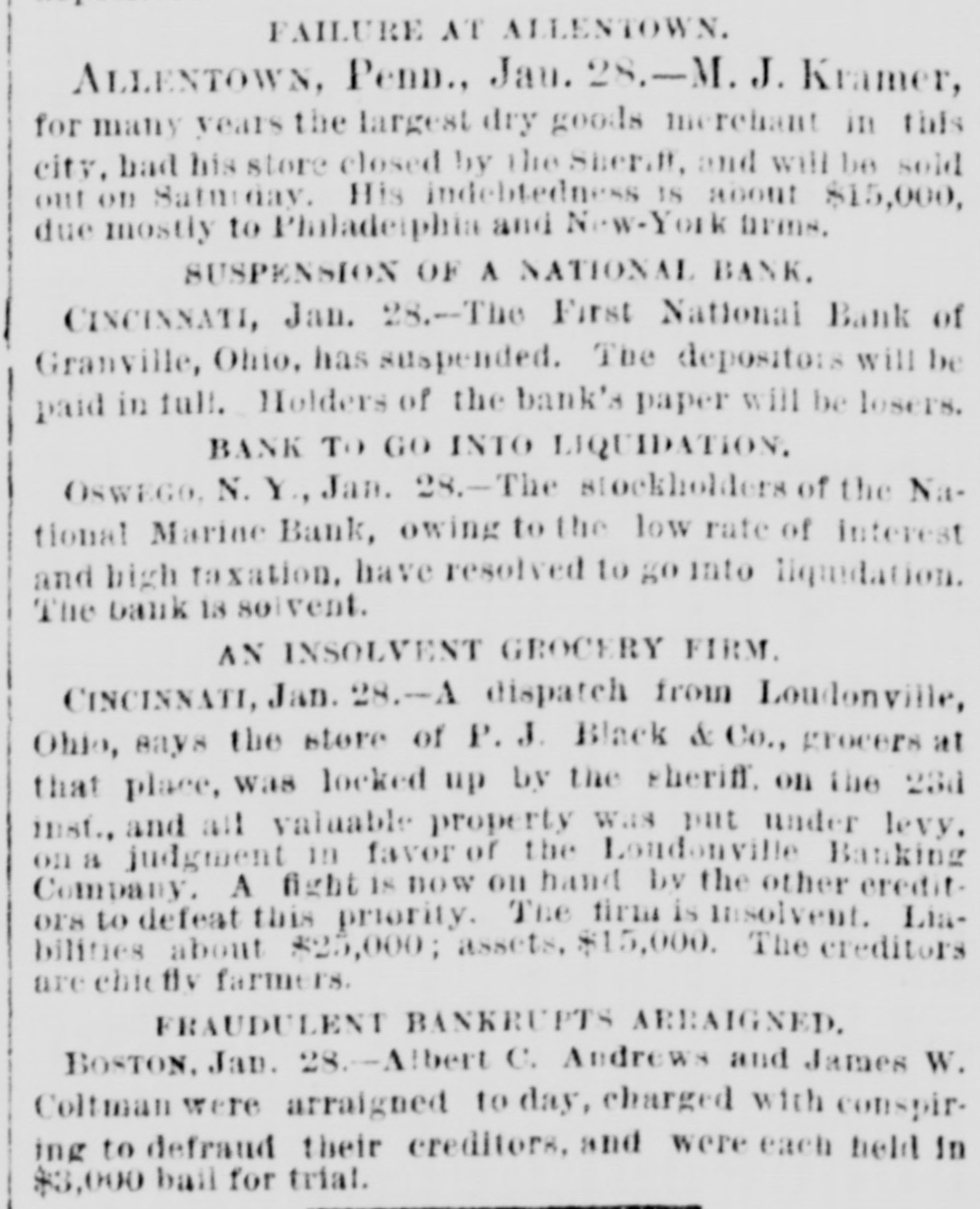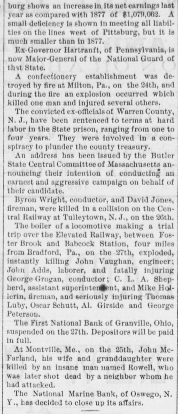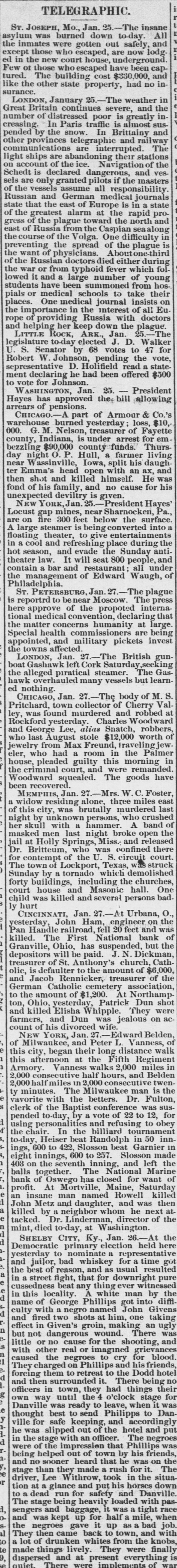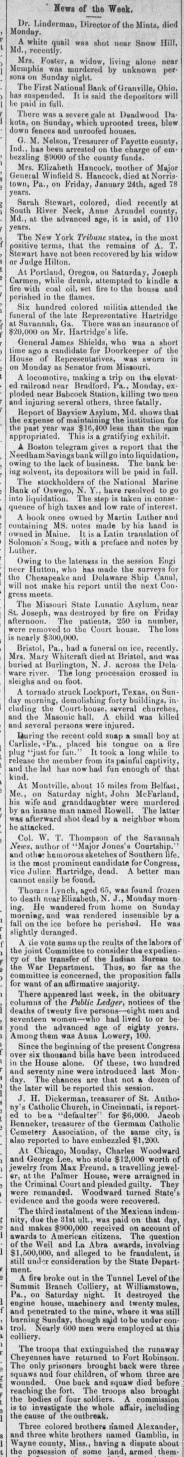 News of the Week. Dr. Linderman, Director of the Mints, died Monday. A white quail was shot near Snow Hill, Md., recently. Mrs. Foster, a widow, living alone near Memphis was murdered by unknown persons on Sunday night. The First National Bank of Granville, Ohio, has suspended. It is said the depositors will be paid in full. There was a severe gale at Deadwood Dakota, on Sunday, which uprooted trees, blew down fences and unroofed houses. G. M. Nelson, Treasurer of Fayette county, Ind., has been arrested on the charge of em bezzling $9000 of the county funds. Mrs. Elizabeth Hancock, mother of Major General Winfield S. Hancock, died at Norristown, Pa., on Friday, January 24th, aged 78 years. Sarah Stewart, colored, died recently at South River Neck, Anne Arundel county, Md., at the advanced age, it is said, of 110 years. The New York Tribune states, in the most positive terms, that the remains of A. T. Stewart have not been recovered by his widow or Judge Hilton. At Portland, Oregon, on Saturday, Joseph Carmen, while drunk, attempted to kindle a fire with coal oil, set fire to the house and perished in the flames. Six hundred colored militia attended the funeral of the late Representative Hartridge at Savannah, Ga. There was an insurance of $20,000 on Mr. Hartridge's life. General James Shields, who was a short time ago a candidate for Doorkeeper of the House of Representatives, was sworn in on Monday as Senator from Missouri. A locomotive, making a trip on the elevated railroad near Bradford, Pa., Monday, exploded near Babcock Station, killing two men and injuring several others, three fatally. Report of Bayview Asylum, Md. shows that the expense of maintaining the institution for the past year was $16,400 less than the sum appropriated. This is a gratifying exhibit. A Boston telegram gives a report that the NeedhamSavings bank willgo into liquidation, owing to the lack of business. The bank be ing solvent, its depositors will be paid in full. The stockholders of the National Marine Bank of Oswego, N. Y., have resolved to go into liquidation. The step is taken in consequence of high taxes and low rate of interest. A book once owned by Martin Luther and containing MS: notes made by his hand is owned in Maine. It is a Latin translation of Solomon's Song, with a preface and notes by Luther. Owing to the lateness in the session Engi neer Hutton, who has made the surveys for the Chesapeake and Delaware Ship Canal, will not make his report until the next Congress meets. The Missouri State Lunatic Asylum, near St. Joseph, was destroyed by fire on Friday afternoon. The patients, 250 in number, were removed to the Court house. The loss is nearly $300,000. Bristol, Pa., had a funeral on ice, recently. Mrs. Mary Whiteraft died at Bristol, and was buried at Burlington, N. J. across the Dela ware river. The long procession crossed in sleighs and on foot. A tornado struck Lockport, Texas, on Sunday morning, demolishing forty buildings, in cluding the Court-house, several churches, and the Masonic hall. A child was killed and several persons were injured. During the recent cold snap a small boy at Carlisle, *Pa., placed his tongue on a fire plug "just for fun." It took a long while to release the member from its painful captivity, and the lad has now had fun enough of that kind. At Montville, about 15 miles from Belfast, Me., on Saturday night, John McFarland, his wife and granddaughter were murdered by an insane man named Rowell. The latter was afterward shot dead by a neighbor whom he attacked. Col. W. T. Thompson of the Savannah News. author of "Major Jones's Courtship. and other humorous sketches of Southern life. is the most prominent candidate for Congress, vice Julian Martridge, dead. A better man cannot easily be found. Thomes Lynch, aged 65, was found frozen to death near Elizabeth, N. J., Monday morn ing. He wandered from home on Sunday morning, and was rendered insensible by a fall on the ice before he perished. He was slightly deranged. A tie vote sums up the reults of the labors of the joint Committee to consider the expediency of the transfer of the Indian Bureau to the War Department. Thus, so far as the committee is concerned, the proposition falls for want of an affirmative majority. There appeared last week. in the obituary columns of the Public Ledger, notices of the deaths of twenty five persons- -eight men and seventeen women-who had lived to or be yond the advanced age of eighty years. Among them was Anna Lowery, 100. Since the beginning of the present Congress over six thousand bills have been introduced in the House alone. Of these, two hundred and seventy nine were introduced last Monday. The chances are that not a dozen of the later will be reported this session. J. H. Dickerman, treasurer of St. Authony's Catholic Church, in Cincinnati, is reported to bea "defaulter" for $6,000. Jacob Benneker, treasurer of the Germam Catholic Cemetery Association, of the same city, is also reported to have embezzled $1,200. At Chicago, Monday, Charles Woodward and George Lee, who stole $12,000 worth of jewelry from Max Freund, a travelling jewel er, at the Palmer House, were arraigned in the Criminal Court and pleaded guilty. They were remanded. Woodward turned State's evidence and the goods were recovered. The third instalment of the Mexican indemnity, due the 31st ult., was paid on that day and makes $900,000 received on account of awards to American citizens. The question of the Weil and La Abra awards, involving $1,500,000, and alleged to be fraudulent, is still under consideration by the State Department. A fire broke out in the Tunnel Level of the Summit Branch Colliery, at Williamstown, Pa., on Saturday night. It destroyed the engine house, machinery and twenty mules, and penetrated to the mine, where it was still burning Sunday, though said to be under control. Nearly 600 men were employed at this colliery. The troops that extinguished the runaway Cheyennes have returned to Fort Robin