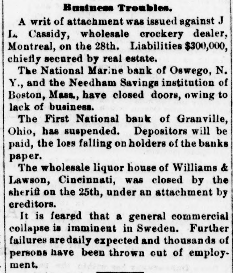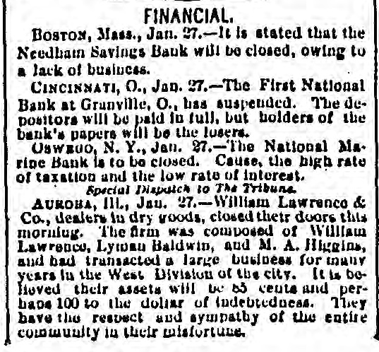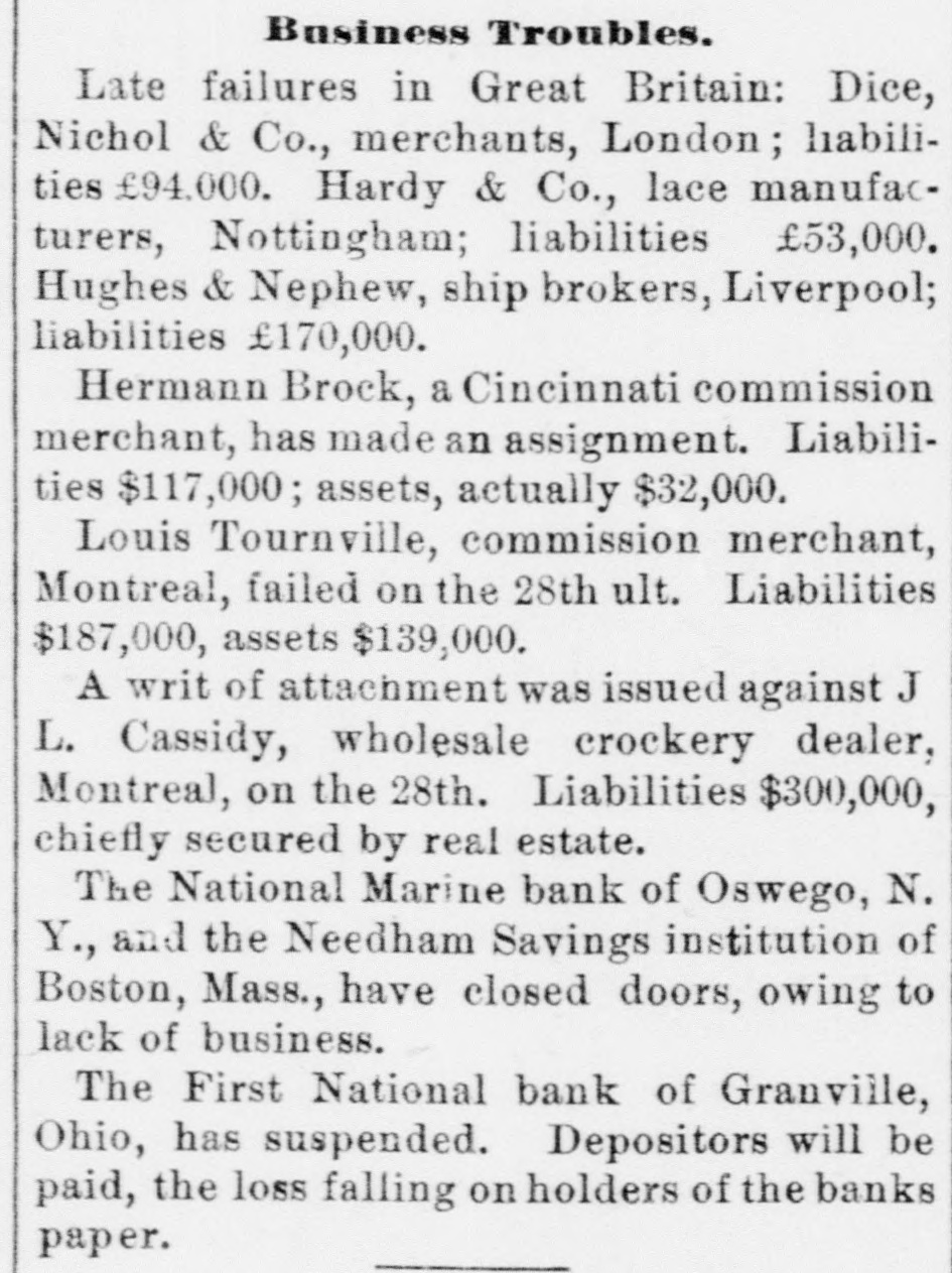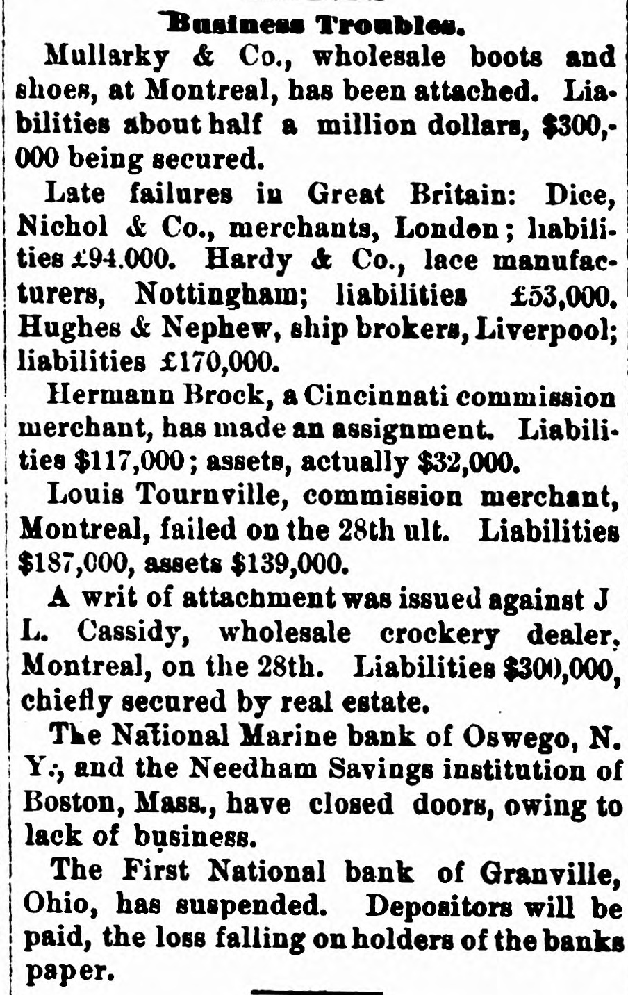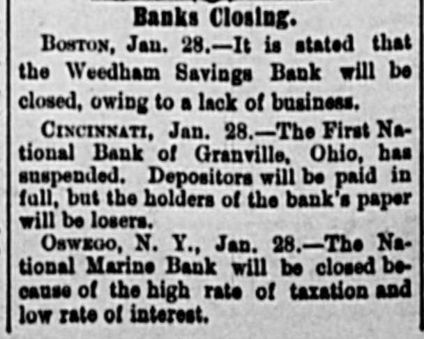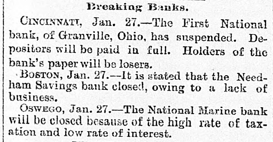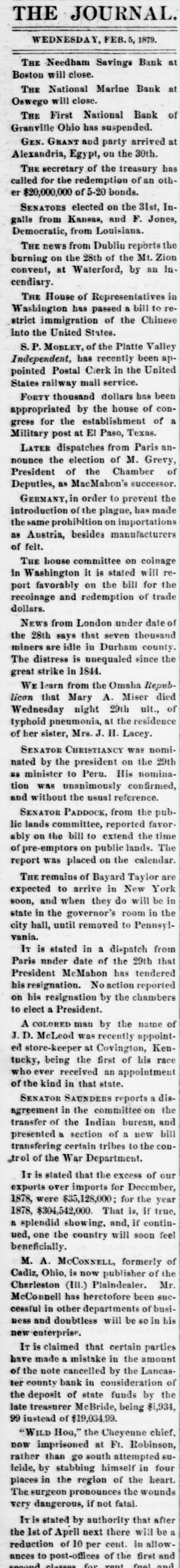 News of the Week. Dr. Linderman, Director of the Mints, died Monday. A white quail was shot near Snow Hill, Md., recently. Mrs. Foster, a widow, living alone near Memphis was murdered by unknown persons on Sunday night. The First National Bank of Granville, Ohio, has suspended. It is said the depositors will be paid in full. There was a severe gale at Deadwood Dakota, on Sunday, which uprooted trees, blew down fences and unroofed houses. G. M. Nelson, Treasurer of Fayette county, Ind., has been arrested on the charge of em bezzling $9000 of the county funds. Mrs. Elizabeth Hancock, mother of Major General Winfield S. Hancock, died at Norristown, Pa., on Friday, January 24th, aged 78 years. Sarah Stewart, colored, died recently at South River Neck, Anne Arundel county, Md., at the advanced age, it is said, of 110 years. The New York Tribune states, in the most positive terms, that the remains of A. T. Stewart have not been recovered by his widow or Judge Hilton. At Portland, Oregon, on Saturday, Joseph Carmen, while drunk, attempted to kindle a fire with coal oil, set fire to the house and perished in the flames. Six hundred colored militia attended the funeral of the late Representative Hartridge at Savannah, Ga. There was an insurance of $20,000 on Mr. Hartridge's life. General James Shields, who was a short time ago a candidate for Doorkeeper of the House of Representatives, was sworn in on Monday as Senator from Missouri. A locomotive, making a trip on the elevated railroad near Bradford, Pa., Monday, exploded near Babcock Station, killing two men and injuring several others, three fatally. Report of Bayview Asylum, Md. shows that the expense of maintaining the institution for the past year was $16,400 less than the sum appropriated. This is a gratifying exhibit. A Boston telegram gives a report that the NeedhamSavings bank willgo into liquidation, owing to the lack of business. The bank be ing solvent, its depositors will be paid in full. The stockholders of the National Marine Bank of Oswego, N. Y., have resolved to go into liquidation. The step is taken in consequence of high taxes and low rate of interest. A book once owned by Martin Luther and containing MS: notes made by his hand is owned in Maine. It is a Latin translation of Solomon's Song, with a preface and notes by Luther. Owing to the lateness in the session Engi neer Hutton, who has made the surveys for the Chesapeake and Delaware Ship Canal, will not make his report until the next Congress meets. The Missouri State Lunatic Asylum, near St. Joseph, was destroyed by fire on Friday afternoon. The patients, 250 in number, were removed to the Court house. The loss is nearly $300,000. Bristol, Pa., had a funeral on ice, recently. Mrs. Mary Whiteraft died at Bristol, and was buried at Burlington, N. J. across the Dela ware river. The long procession crossed in sleighs and on foot. A tornado struck Lockport, Texas, on Sunday morning, demolishing forty buildings, in cluding the Court-house, several churches, and the Masonic hall. A child was killed and several persons were injured. During the recent cold snap a small boy at Carlisle, *Pa., placed his tongue on a fire plug "just for fun." It took a long while to release the member from its painful captivity, and the lad has now had fun enough of that kind. At Montville, about 15 miles from Belfast, Me., on Saturday night, John McFarland, his wife and granddaughter were murdered by an insane man named Rowell. The latter was afterward shot dead by a neighbor whom he attacked. Col. W. T. Thompson of the Savannah News. author of "Major Jones's Courtship. and other humorous sketches of Southern life. is the most prominent candidate for Congress, vice Julian Martridge, dead. A better man cannot easily be found. Thomes Lynch, aged 65, was found frozen to death near Elizabeth, N. J., Monday morn ing. He wandered from home on Sunday morning, and was rendered insensible by a fall on the ice before he perished. He was slightly deranged. A tie vote sums up the reults of the labors of the joint Committee to consider the expediency of the transfer of the Indian Bureau to the War Department. Thus, so far as the committee is concerned, the proposition falls for want of an affirmative majority. There appeared last week. in the obituary columns of the Public Ledger, notices of the deaths of twenty five persons- -eight men and seventeen women-who had lived to or be yond the advanced age of eighty years. Among them was Anna Lowery, 100. Since the beginning of the present Congress over six thousand bills have been introduced in the House alone. Of these, two hundred and seventy nine were introduced last Monday. The chances are that not a dozen of the later will be reported this session. J. H. Dickerman, treasurer of St. Authony's Catholic Church, in Cincinnati, is reported to bea "defaulter" for $6,000. Jacob Benneker, treasurer of the Germam Catholic Cemetery Association, of the same city, is also reported to have embezzled $1,200. At Chicago, Monday, Charles Woodward and George Lee, who stole $12,000 worth of jewelry from Max Freund, a travelling jewel er, at the Palmer House, were arraigned in the Criminal Court and pleaded guilty. They were remanded. Woodward turned State's evidence and the goods were recovered. The third instalment of the Mexican indemnity, due the 31st ult., was paid on that day and makes $900,000 received on account of awards to American citizens. The question of the Weil and La Abra awards, involving $1,500,000, and alleged to be fraudulent, is still under consideration by the State Department. A fire broke out in the Tunnel Level of the Summit Branch Colliery, at Williamstown, Pa., on Saturday night. It destroyed the engine house, machinery and twenty mules, and penetrated to the mine, where it was still burning Sunday, though said to be under control. Nearly 600 men were employed at this colliery. The troops that extinguished the runaway Cheyennes have returned to Fort Robin