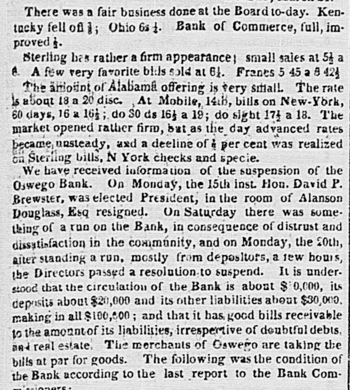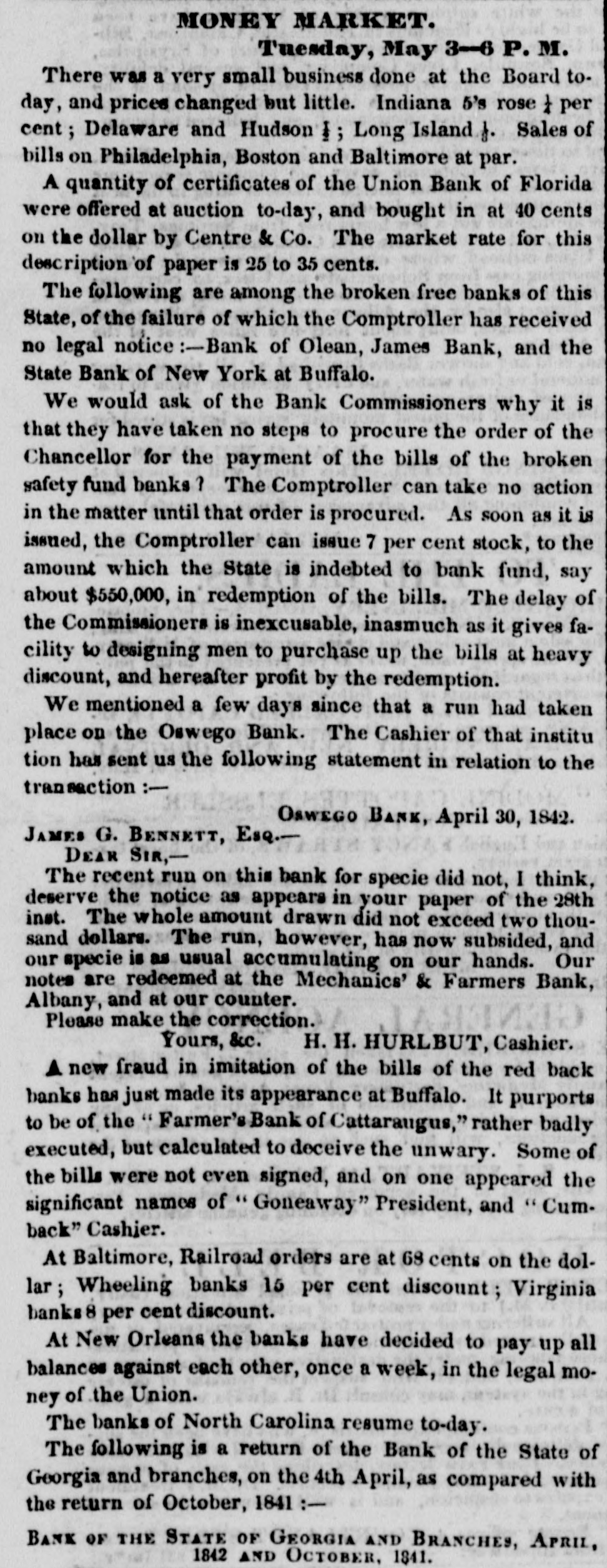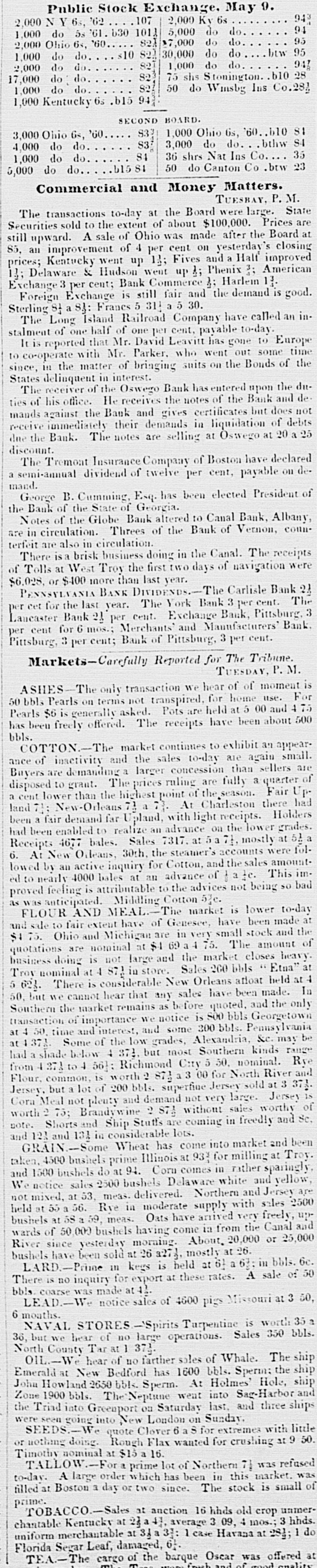 Buffalo, February last of 44 per cent. and the City Bank of in the same month, paid a dividend of 50 per cent. Receivers of the several insolvent render it quite bankstaken The returns collectively, from the certain that in circula- the loss to the Safety Fund will be equal to all the notes that a call may on the the debts of some of betion; Safety and it Fund is not to improbable pay the be Banks made youd the redemption of the notes in circulation. The discounted bills in most of the banks are very large in amount; but the Receiver of the Commercial Bank of New-York estimates that only about ten thousand dollars will be realized from three hundred and eight thousand dollars of this class of assets. In ten months the Receiver has collected only $2,181 the in usets the of Bank that of Bank, Buffalo while Comptroller, less 79 than from five the months, has collected and redeemed more than $423,000 of notes of the same bank. There has been Commercial Bauk of paid the circulating on the assets of the Buffalo Fund only to $11,000, while the outstanding notes for the Safety The payments to the Receiver of the of amount to Watervieit A statement redeem Commercial amount Bank to about $483,000. Bank $8,000. Oswego has $2,400; not been the obtained from the Clinton County Bank, but the sum collacied probably does not exceed those of the Commercial of and Beffalo. Judging from tions believe that an amount to Bank there Oswego is no reason to these equal indicathe debts of the banks will ever be realized from the assets the Receivers. If this is so, the loss to the the circulating notes of ten exSafety hands Fund, of being the $2,068,504; banks, which cluding the Lewis County Bank, will be consume the original capital of the Safety Fund and of the contributions of half of one per cent. on the capitals all the banks to January, 1849, inclusive. After the arrearages are paid off, the banks must continue make pay half of one per cent. annually for six years, to up a new fund. This will terminate in January, 1855, provieed there are no mere failures among the Safety Fund Banks. Markets-Carefully reported for The Tribune. ASHES-The market remains heavy with an indisposition among exporters to buy at previous rates. The bills out to-day are about 150 bbls., and the receipts about 100 bble of both descriptions. Of Pots some 40 to 50 bbls. have been taken at $5.621, but the market cannot be considered firm at this rate. Pearls are still sold by some receivers at $6, but sales to a small extent were made at $5 94 a $587} The bigher rate is about the fair quotation. The amount received sisce opening of Canals, is 36,974 bbls. Stock on band, Pots. 1st inst., 2,133; 2d do. 377; 3d do. 119; condemned, H.Total, 2,723. Pearls, inst, 590; 2d do. 115; Sd do. 33 ; condemoed, 22.-Total, 766. Aggregate, 3,489 bble, Shipped from 1st to 19th October, 2,144 bbls. Pots; 294 bbls. Pearls. COTTON-The sales to-day are about 500 bales, at al most previous rates. The market, however, continues in favor of the buyer. A portion of these sales were to exporters, but the decline in Exchange and the difficulty of selling bills, keep shippers out of the market. The sales for the past week add up 2,200 bales, viz: 1,300 Upland and Florida, at a 9; 300 Mobile, at of a 10; 400 New Orleans, at 6a 10. FLOUR-The improved feeling in Flour continues to prevail, and the demand to-day for the East and bome trade has been very fair. Some large receivers who have been seiling at $4.25, are now asking $4 311. The sales of Genesee have been generally at $1.25, with none to be had less, and are not very treely at that. Ohio flat. $4 182 a $425; Wilmington, $1.18 a 25, mostly good brands at the latter rate. Troy is afforded at but sales cannot be made at that rate. Round Ohio is selling at $4 183 and in demand. We believe there is more to be had now be low that price. A lot of 1,200 bbls. of fancy brand round Ohio sold, for shipment to East Indies, at $131. lined. Within a few days 800 bbk New-Orleans superfine sold from the whari at $1 124, and to-day 410 bbls. sold, to arrive, at smething over that rate, supposed at $4 183. In Southern we bear of very little doing. The price of round Ohio in daces purchasers to take that in preference at the differ