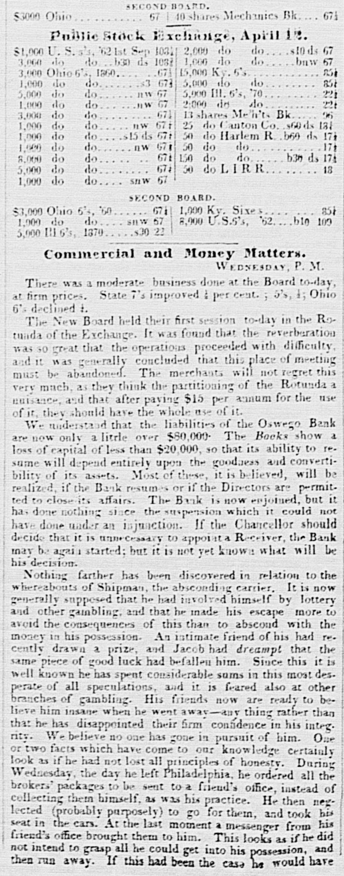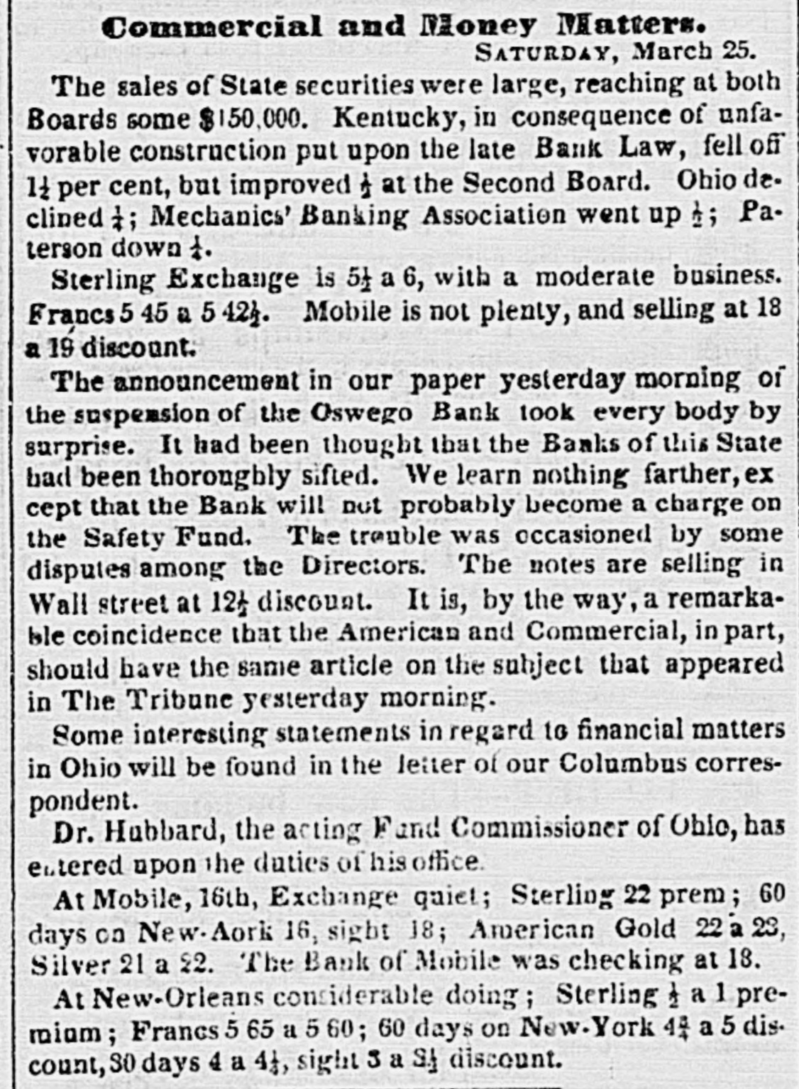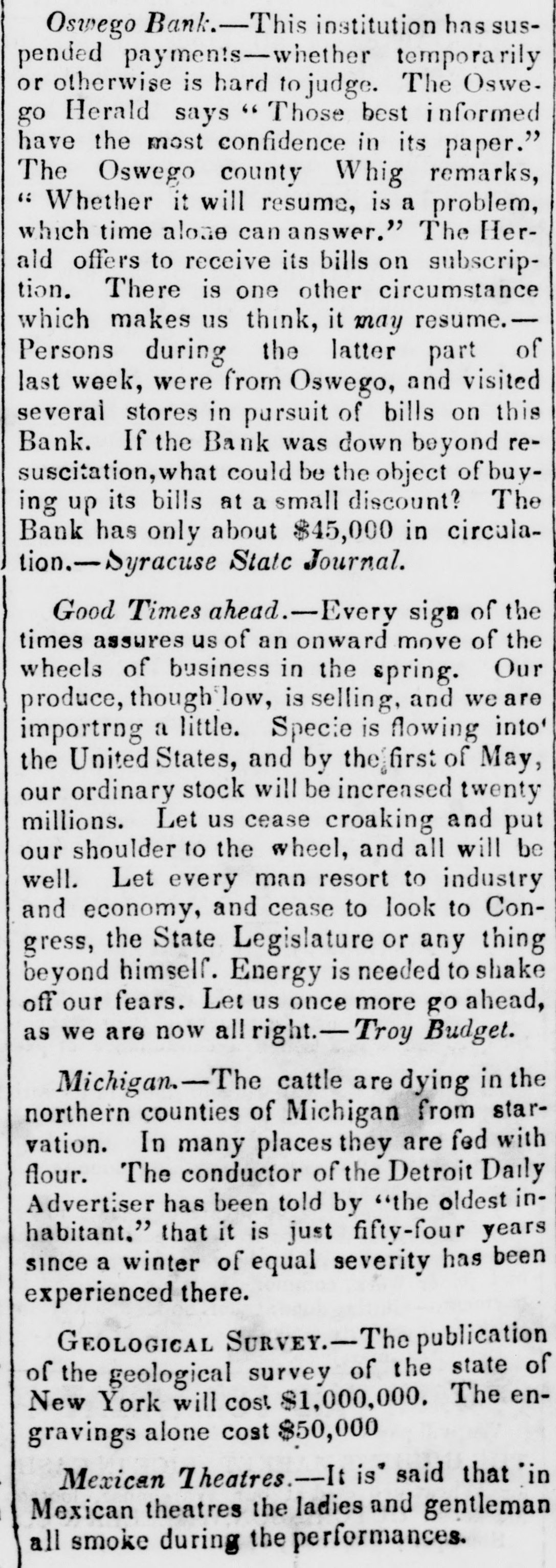 Buffalo, February last of 44 per cent. and the City Bank of in the same month, paid a dividend of 50 per cent. Receivers of the several insolvent render it quite bankstaken The returns collectively, from the certain that in circula- the loss to the Safety Fund will be equal to all the notes that a call may on the the debts of some of betion; Safety and it Fund is not to improbable pay the be Banks made youd the redemption of the notes in circulation. The discounted bills in most of the banks are very large in amount; but the Receiver of the Commercial Bank of New-York estimates that only about ten thousand dollars will be realized from three hundred and eight thousand dollars of this class of assets. In ten months the Receiver has collected only $2,181 the in usets the of Bank that of Bank, Buffalo while Comptroller, less 79 than from five the months, has collected and redeemed more than $423,000 of notes of the same bank. There has been Commercial Bauk of paid the circulating on the assets of the Buffalo Fund only to $11,000, while the outstanding notes for the Safety The payments to the Receiver of the of amount to Watervieit A statement redeem Commercial amount Bank to about $483,000. Bank $8,000. Oswego has $2,400; not been the obtained from the Clinton County Bank, but the sum collacied probably does not exceed those of the Commercial of and Beffalo. Judging from tions believe that an amount to Bank there Oswego is no reason to these equal indicathe debts of the banks will ever be realized from the assets the Receivers. If this is so, the loss to the the circulating notes of ten exSafety hands Fund, of being the $2,068,504; banks, which cluding the Lewis County Bank, will be consume the original capital of the Safety Fund and of the contributions of half of one per cent. on the capitals all the banks to January, 1849, inclusive. After the arrearages are paid off, the banks must continue make pay half of one per cent. annually for six years, to up a new fund. This will terminate in January, 1855, provieed there are no mere failures among the Safety Fund Banks. Markets-Carefully reported for The Tribune. ASHES-The market remains heavy with an indisposition among exporters to buy at previous rates. The bills out to-day are about 150 bbls., and the receipts about 100 bble of both descriptions. Of Pots some 40 to 50 bbls. have been taken at $5.621, but the market cannot be considered firm at this rate. Pearls are still sold by some receivers at $6, but sales to a small extent were made at $5 94 a $587} The bigher rate is about the fair quotation. The amount received sisce opening of Canals, is 36,974 bbls. Stock on band, Pots. 1st inst., 2,133; 2d do. 377; 3d do. 119; condemned, H.Total, 2,723. Pearls, inst, 590; 2d do. 115; Sd do. 33 ; condemoed, 22.-Total, 766. Aggregate, 3,489 bble, Shipped from 1st to 19th October, 2,144 bbls. Pots; 294 bbls. Pearls. COTTON-The sales to-day are about 500 bales, at al most previous rates. The market, however, continues in favor of the buyer. A portion of these sales were to exporters, but the decline in Exchange and the difficulty of selling bills, keep shippers out of the market. The sales for the past week add up 2,200 bales, viz: 1,300 Upland and Florida, at a 9; 300 Mobile, at of a 10; 400 New Orleans, at 6a 10. FLOUR-The improved feeling in Flour continues to prevail, and the demand to-day for the East and bome trade has been very fair. Some large receivers who have been seiling at $4.25, are now asking $4 311. The sales of Genesee have been generally at $1.25, with none to be had less, and are not very treely at that. Ohio flat. $4 182 a $425; Wilmington, $1.18 a 25, mostly good brands at the latter rate. Troy is afforded at but sales cannot be made at that rate. Round Ohio is selling at $4 183 and in demand. We believe there is more to be had now be low that price. A lot of 1,200 bbls. of fancy brand round Ohio sold, for shipment to East Indies, at $131. lined. Within a few days 800 bbk New-Orleans superfine sold from the whari at $1 124, and to-day 410 bbls. sold, to arrive, at smething over that rate, supposed at $4 183. In Southern we bear of very little doing. The price of round Ohio in daces purchasers to take that in preference at the differ
