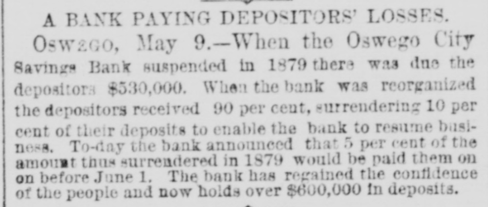 A BANK PAYING DEPOSITORS' LOSSES. Oswago, May 9.-When the Oswego City Savings Bank suspended in 1879 there was due the depositors $530,000. When the bank was reorganized the depositors received 90 per cent, surrendering 10 per cent of their deposits to enable the bank to resume business. To-day the bank announced that 5 per cent of the amount thus surrendered in 1879 would be paid them on on before June 1. The bank has regained the confidence of the people and now holds over $600,000 in deposits.