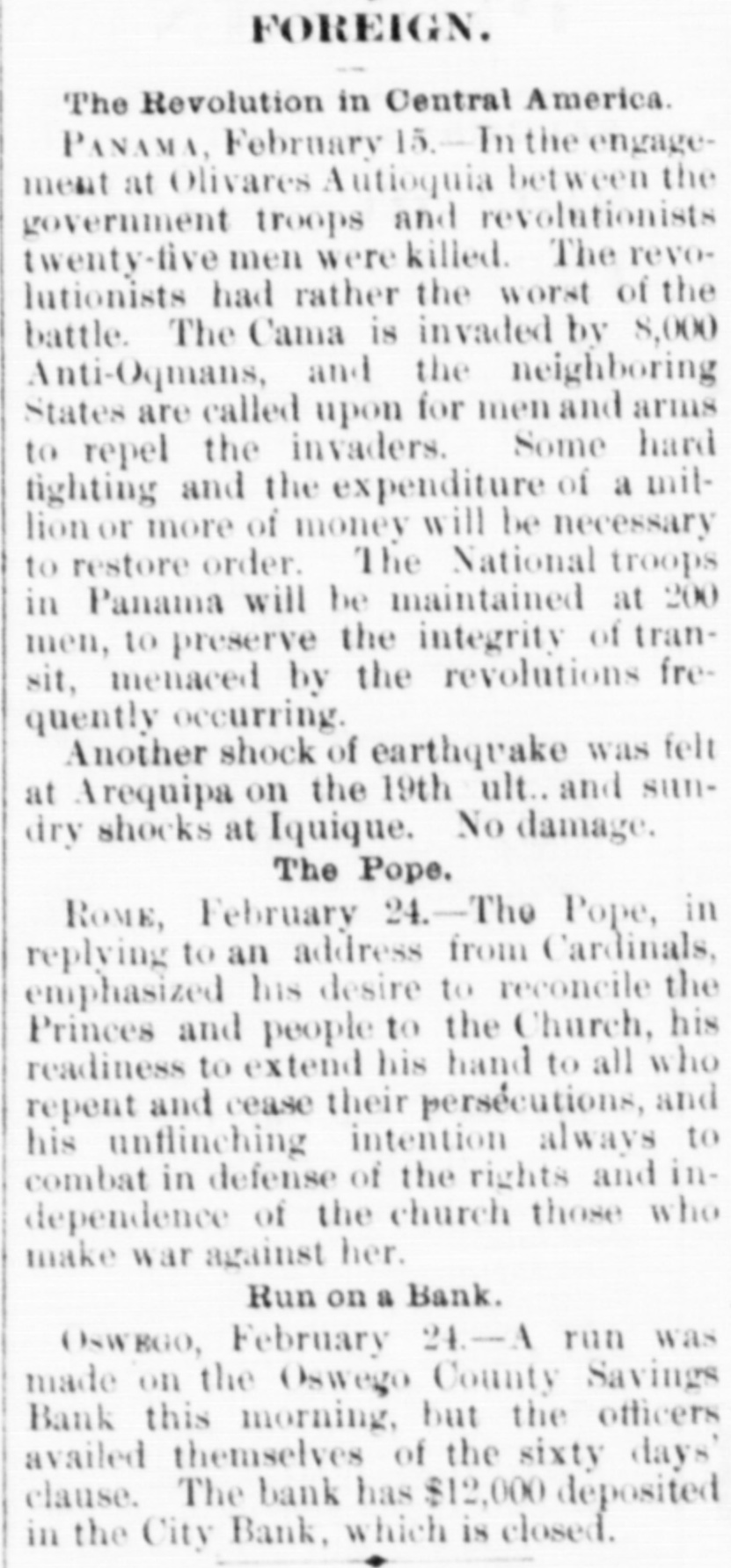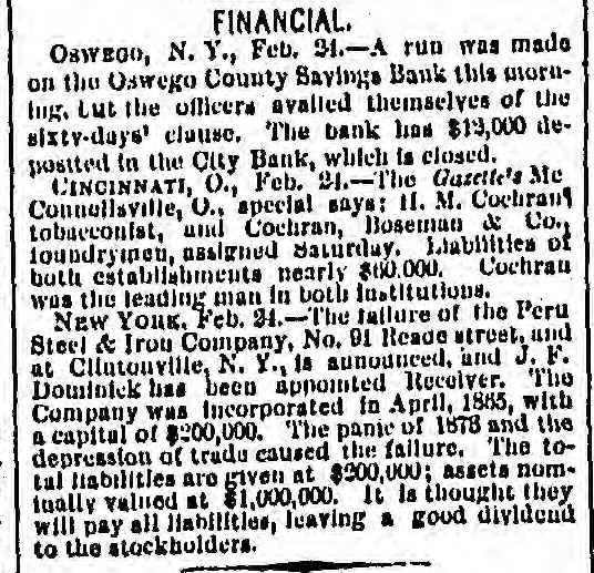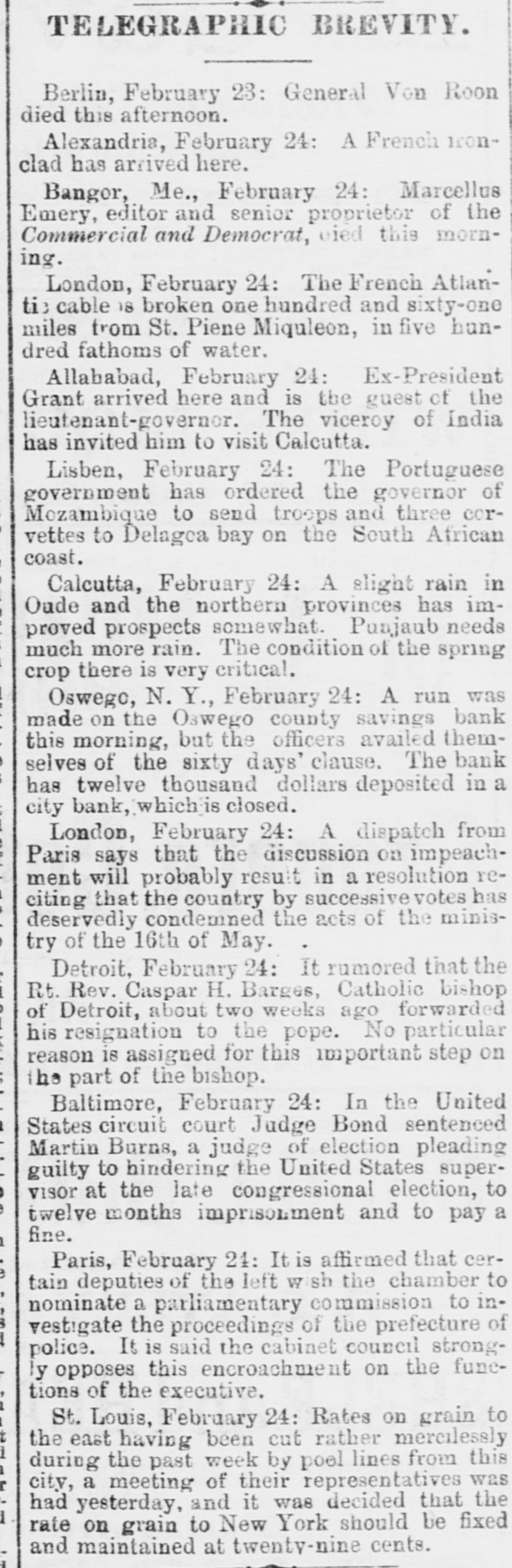 TELEGRAPHIC BREVITY. Berlin, February 23: General Von Roon died this afternoon. Alexandria, February 24: A French Ironclad has arrived here. Bangor, Me., February 24: Marcellus Emery, editor and senior proprietor of the Commercial and Democrat, oied this morning. London, February 24: The French Atlanti: cable 18 broken one hundred and sixty-one miles from St. Piene Miquleon, in five hundred fathoms of water. Allababad, February 24: Ex-President Grant arrived here and is the guest of the lieutenant-governor. The viceroy of India has invited him to visit Calcutta. Lisben, February 24: The Portuguese government has ordered the governor of Mozambique to send troops and three corvettes to Delagca bay on the South African coast. Calcutta, February 24: A slight rain in Oude and the northern provinces has improved prospects somewhat. Punjaub needs much more rain. The condition of the spring crop there is very critical. Oswego, N. Y., February 24: A run was made on the Oswego county savings bank this morning, but the officers availed themselves of the sixty days' clause. The bank has twelve thousand dollars deposited in a city bank, which is closed. London, February 24: A dispatch from Paris says that the discussion on impeachment will probably result in a resolution reciting that the country by successive votes has deservedly condemned the acts of the ministry of the 16th of May. Detroit, February 24: It rumored that the Rt. Rev. Caspar H. Barges, Catholic bishop of Detroit, about two weeks ago forwarded his resignation to the pope. No particular reason is assigned for this important step on the part of the bishop. Baltimore, February 24: In the United States circuit court Judge Bond sentenced Martin Burns, a judge of election pleading guilty to hindering the United States supervisor at the late congressional election, to twelve months imprisonment and to pay a fine. Paris, February 24: It is affirmed that certain deputies of the left wish the chamber to nominate a parliamentary commission to investigate the proceedings of the prefecture of police. It is said the cabinet council strongly opposes this encroachment on the functions of the executive. St. Louis, February 24: Rates on grain to the east having been cut rather mercilessly during the past week by poel lines from this city, a meeting of their representatives was had yesterday, and it was decided that the rate on grain to New York should be fixed and maintained at twenty-nine cents.