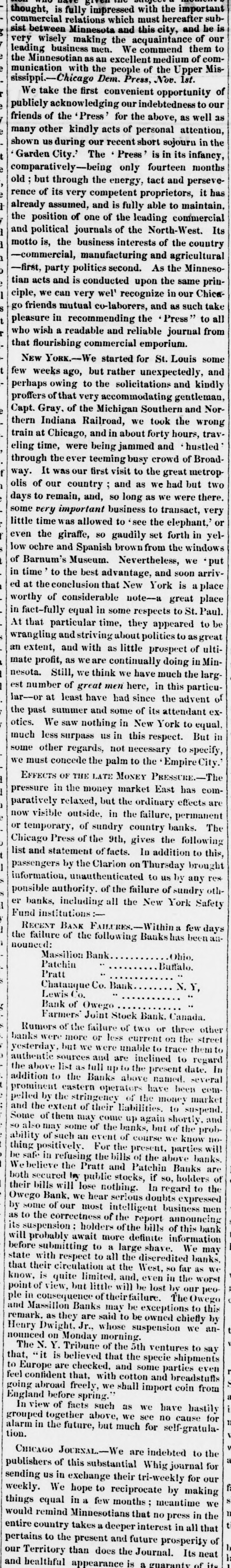 with the important subthought, is relations fully impressed which must this city, hereafter and he commercial Minnesota and of our as an excellent of the Upper with Nov. very sist between leading the Minnesotian wisely business making men. the people the We acquaintance commend medium 1st. them of com- Misof munication Chicago Dem. Press, opportunity sissippi.- the first convenient to our We take ledging our indebtedness as well as publicly acknow the 'Press for the above, attention, friends of kindly acts of personal sojourn in the many shown other us during our recent Press short is in its infancy, through the comparatively- Garden City.' The energy, only tact fourteen and perseve- months it has old but competent proprietors, maintain, rence already of assumed, its very and of is the fully leading able to commercial Its the position of the of one North-West. business interests of motto is, manufacturing and As the and political the journals agricultural the Minneso- country -commercial, party politics second. the same printian -first, acts and is conducted wel' recognize upon in our such Chicaciple, we can mutual very cu-laborers, and Press' as " to take all go friends recommending the from pleasure in readable and reliable journal who wish flourishing a commercial emporium. that for St. Louis some t NEW YORK.- We but started rather unexpectedly, kindly and few weeks ago, the solicitations and perhaps owing to accommodating gentleman, and Norproffers of that very the Michigan Southern the wrong Capt. Gray. of we took and in about forty thern train Indiana Chicago, Railroad, hours, hustled Broad- travat were being jammed crowd and of through eling time, the ever teeming visit busy to the great metropway. It was our ; and as we had were to business to days olis of our remain, important country and, first so long as we transact, elephant.' but there. very two or some very was allowed to 'see the forth in yellittle time the giraffe, so gaudily from set the windows ochre and we even low Museum. Spanish brown Neverthelese, arriv- put of Barnum's to the best advantage, York and soon is a place ed in time' at the conclusion considerable that New note-a great to St. place Paul. equal appeared to worthy in fact-fully of particular in time, some they respects politics to asgreat ulti- be At that and striving about prospect of wrangling and with as little in Minan extent, weare continually doing the largmate profit, as we think we have much of great men here, in the advent at least have had of its attendant nesota. lar-or number Still, and some since this particu- equal. ex- of the past summer nothing in New York to But in less surpass us to some the palm to the otics. much other We concede saw regards, not in necessary this respect. PRESSURE.- EmpireCity specify, The we must THE LATE MONEY has comEFFECTS OF the money market East effects are pressure in relaxed, but the ordinary permanent paratively outside. in the failure, banks. The now or temporary, visible of sundry country gives the following I Chicago Press of the of facts. 9th, In addition brought to this, list and statement by the Clarion on Thursday by any res passengers unauthenticated to us other information, authority. of the failure of sundry Safety ponsible banks, including all the New York Fund institutions few Within days Ohio. the RECENT failure BANK of the FAILURES. following Banks has been allnounced: Massilion Bank Patchin Buffalo. N.Y, Chatauque Pratt Co. Bank Lewis Co. Bank of Owego Joint Stock Bank, Canada. of the failure of current on the Rumors more or less trace them banks were Farmers were unable two to or three regard street other to yesterday, but we and are inclined to date. In authentic sources list as full up to the present named. several the above the Banks above been cemaddition to eastern operators have by the stringency liabilities. of to prominent pelled the money suspend market and extent of their shortly, also may some of event of course we will noSome so and the of them such all may come the banks, up again but of parties know the probability of For the present. banks. thing in refusing the Patchin Banks Webelieve be safe positively. the Pratt and bills of the above holders are of in public stocks, if regard so, to the their bills will lose serious doubts men Owego announcing both secured Bank, our we most hear nothing. intelligent In business expressed to the correctnes of the bills of this will to a large as by its suspension some probably of await holders more of the definite report shave. information We bank may with respect to the West, so far as that their and, even in state before submitting circulation at all the discredited the banks. worst we know, TheOwego point of consequence is view, quite but limited little of theirfailure. will be exceptions lost by our to peo- this in Massillon Banks may to be be owned chiefly on Monday remark. Dwight. as they Jr., are whose suspension we and ple Henry said morning. ventures to say an- by The N. Y. Tribune that the specie even nounced "it is believed checked. of the and 5th some parties shipments to Europe are with cotton and feel confident that, we shall import going that, abroad before freely, spring. have breadstuffs coin hastily from England In view of facts such we as we see no cause for alarm grouped in together the future, above, but much for self-gratulation. JOURNAL.- We are indebted journal to the for CHICAGO of this substantial Whig for our publishers in exchange their tri-weekly making sending us We hope to reciprocate meantime by we weekly. in a few months in remind Minnesotians that no in all takes a deeper to the present and future Its entire would things country equal interest prosperity press neat that the of pertains than does the Journal. of its our and Territory healthful appearance is a guaranty