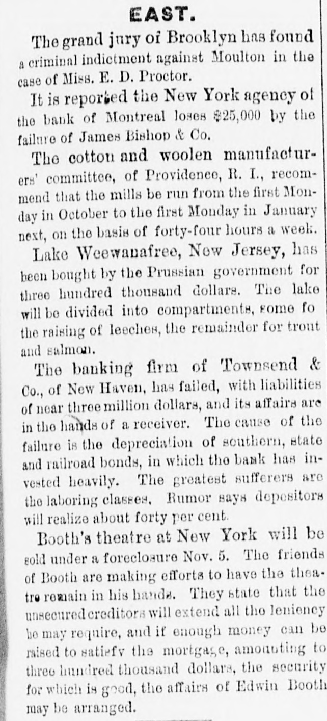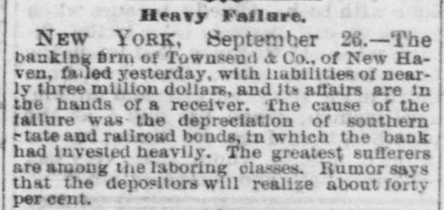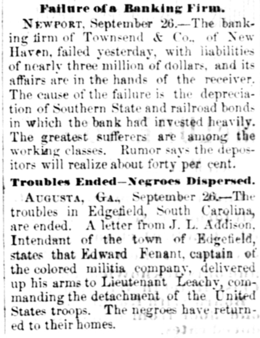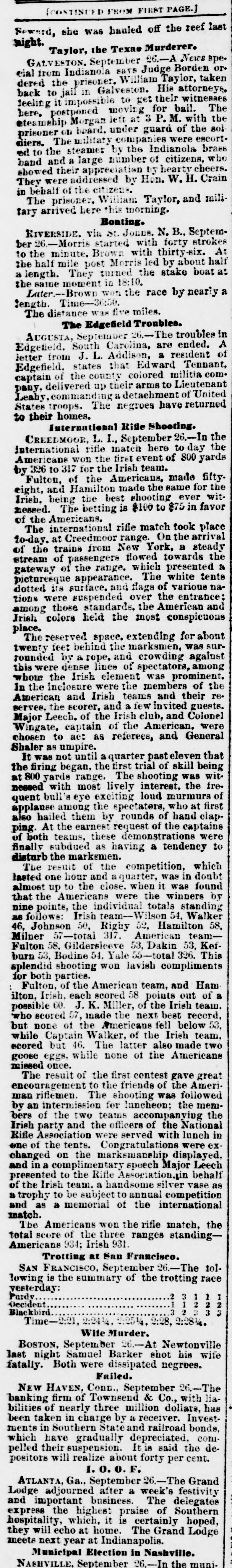 [CONTINCE FROM FIRST PAGE.] Seward, she was hauled off the reef last might. Taylor, the Texas Murderer. GALVESTON. September 26.-A News spe. cial from Indianola says Judge Borden taken or. dered the prisoner. William Taylor, back to jail in Galveston. His attorneys. feeling it impossible to get their witnesses The postponed moving for bail. eteamship here. Morgan left at 3 P. M. with sol- the OD board. under guard of the diers. prisoner The military companies were escorted to the steamer by the Indianola brass who band and a large number of citizens. showed their appreciation by hearty cheers. They were addressed by Hon. W. H. Crain in behalf of the citizens. The prisoner. William Taylor, and military arrived here this morning. Boating. RIVERSIDE. via St. Johns. N. B., September Morris started with forty strokes At to the minute. Brown with thirty-six. the half mile post Morris led by about half a length. They turned the stake boat at the same moment in 18:10. Brown won the race by nearly a length. Time-36:50. The distance was five miles. The Edgefield Troubles. AUGUSTA, September 26.-The troubles in A Edgefield. South Carolina, are ended. letter from J. L. Addison, a resident of Edgefield, states that Edward Tennant. captain of the county colored militia com. pany, delivered up their arms to Lieutenant Leahy, commanding a detachment of United States troops. The negroes have returned to their homes. International Rifle Shooting. CREEDMOOR, L. I., September 26.-In the international rifle match here to day the Americans won the first event of 800 yards by 326 to 317 for the Irish team. Fulton, of the Americans, made fifty. eight, and Hamilton made the same for the Irish. being the best shooting ever witmessed. The betting is $100 to $75 in favor of the Americans. The international rifle match took place to-day. at Creedmoor range. On the arrival of the trains from New York, a steady the stream of passengers flowed towards gateway of the range. which presented a picturesque appearance. The white tents dotted its surface. and flags of various nations were suspended over the entrance: among those standards. the American and Irish colors held the most conspicuous place. The reserved space. extending for about twenty fee: behind the marksmen, was surrounded by a rope, and crowding against this were dense lines of spectators, among whom: the Irish element was prominent. In the inclosure were the members of the American and Irish teams and their reserves. the scorer. and a few invited guests. Major Leech. of the Irish club, and Colonel Wingate. captain of the American, were chosen to act as referees, and General Shaler as umpire. It was not until a quarter past eleven that the firing began, the first trial of skill being at 800 yards range. The shooting was witnessed with most lively interest. the frequent bull 8 eye exciting loud murmurs of applause among the spectaters, who at first also hailed them by rounds of hand clapping At the earnest request of the captains of both teams, these demonstrations were finally subdued as having a tendency to disturb the marksmen. The result of the competition, which lasted one hour and a quarter, was in doubt almost up to the close. when it was found that the Americans were the winners by nine points, the individual totals standing as follows: Irish team- 54, Walker 46, Johnson 50, Righy 52, Hamilton 58, Milner 57-total 317. American teamFulton 58. Gildersleeve 53, Dakin 53, Kefburn 53, Bodine 54. Yale 55-total 326. This splendid shooting won lavish compliments for both parties. Fulton, of the American team, and Ham ilton, Irish, each scored 58 points out of a possible 60. J. K. Miller, of the Irish team. who scored 57, made the next best record, but none of the Americans fell below 53, while Captain Walker, of the Irish team, scored but 46. The latter also made two geose eggs, while none of the Americans missed once. The result of the first contest gave great encouragement to the friends of the Ameriman riffemen. The shooting was followed by an intermission for luncheon; the members of the two teams accompanying the Irish party and the officers of the National Rifle Association were served with lunch in one of the tents. Congratulations were exchanged on the marksmanship displayed, and in a complimentary speech Major Leech presented to the Rifle Association.jin behalf of the Irish team. a handsome silver vase as a trophy to be subject to annual competition and as a memorial of the international match. The Americans won the rifle match, the total score of the three ranges standingAmericans 934; Irish 931. Trotting at San Francisco. SAN FRANCISCO, September 26.-The tollowing is the summary of the trotting race vesterday: 23111 Purdy Occident 11222 Blackbird 32333 Time-2:21, 2:24 4, 2:25 4, 2:28, 2:28 4. Wife Murder. BOSTON, September 26.-At Newtonville last night Samuel Barker shot his wife fatally. Both were dissipated negroes. Failed. NEW HAVEN, Conn., September 26.-The banking firm of Townsend & Co., with liabilities of nearly three million dollars, has been taken in charge by a receiver. Investments in Southern State and railroad bonds, which have gradually depreciated. compelled their suspension. It is said the depositors will realize about forty per cent. 1. o. 0. F. ATLANTA, Ga., September 26-The Grand Lodge adjourned after a week's festivity and important business. The delegates express the highest praise of Southern hospitality, which, it is certainly hoped, they will echo at home. The Grand Lodge meets next year at Indianapolis. Municipal Election in Nashville. NASHVILLE. September 26. the muni-